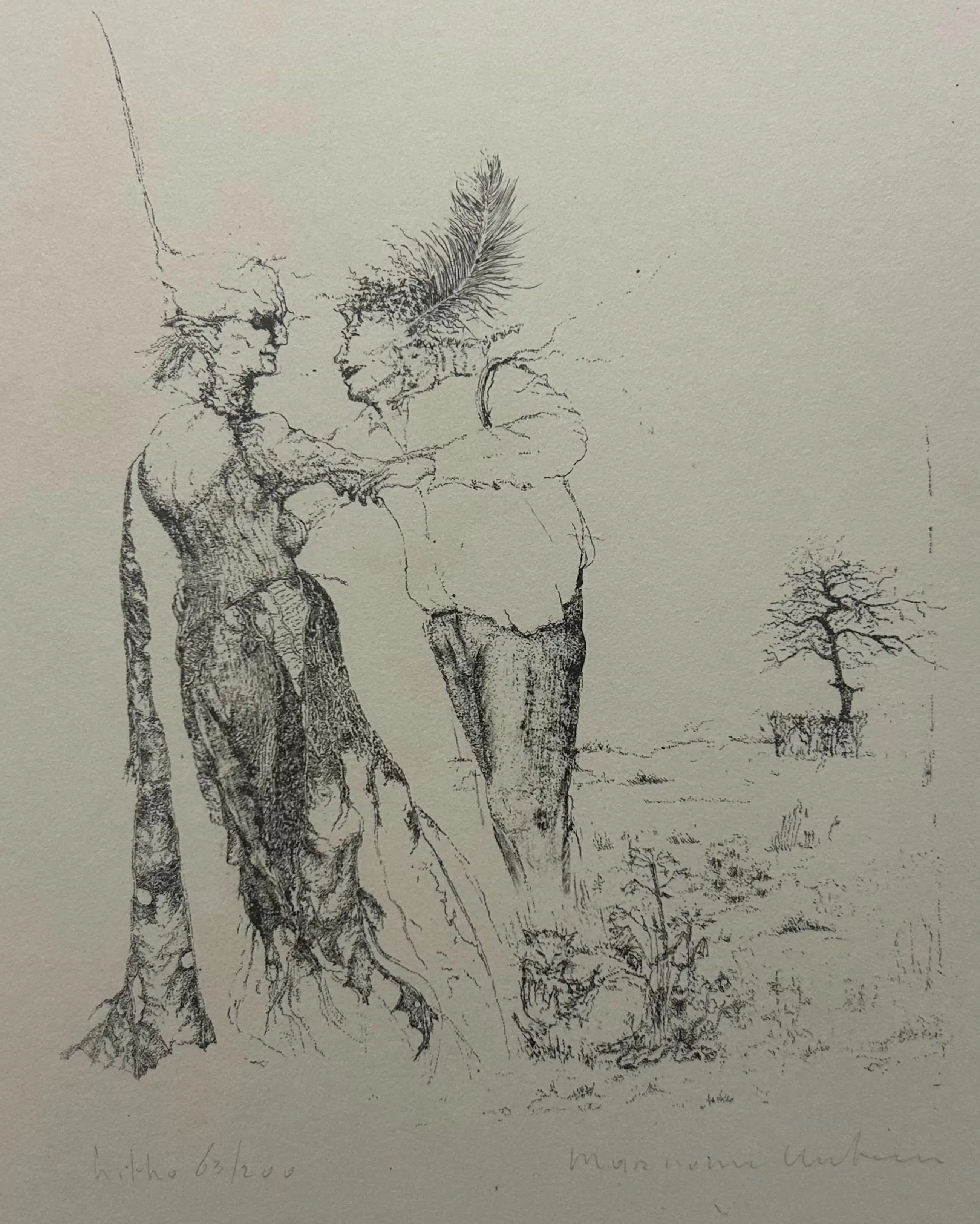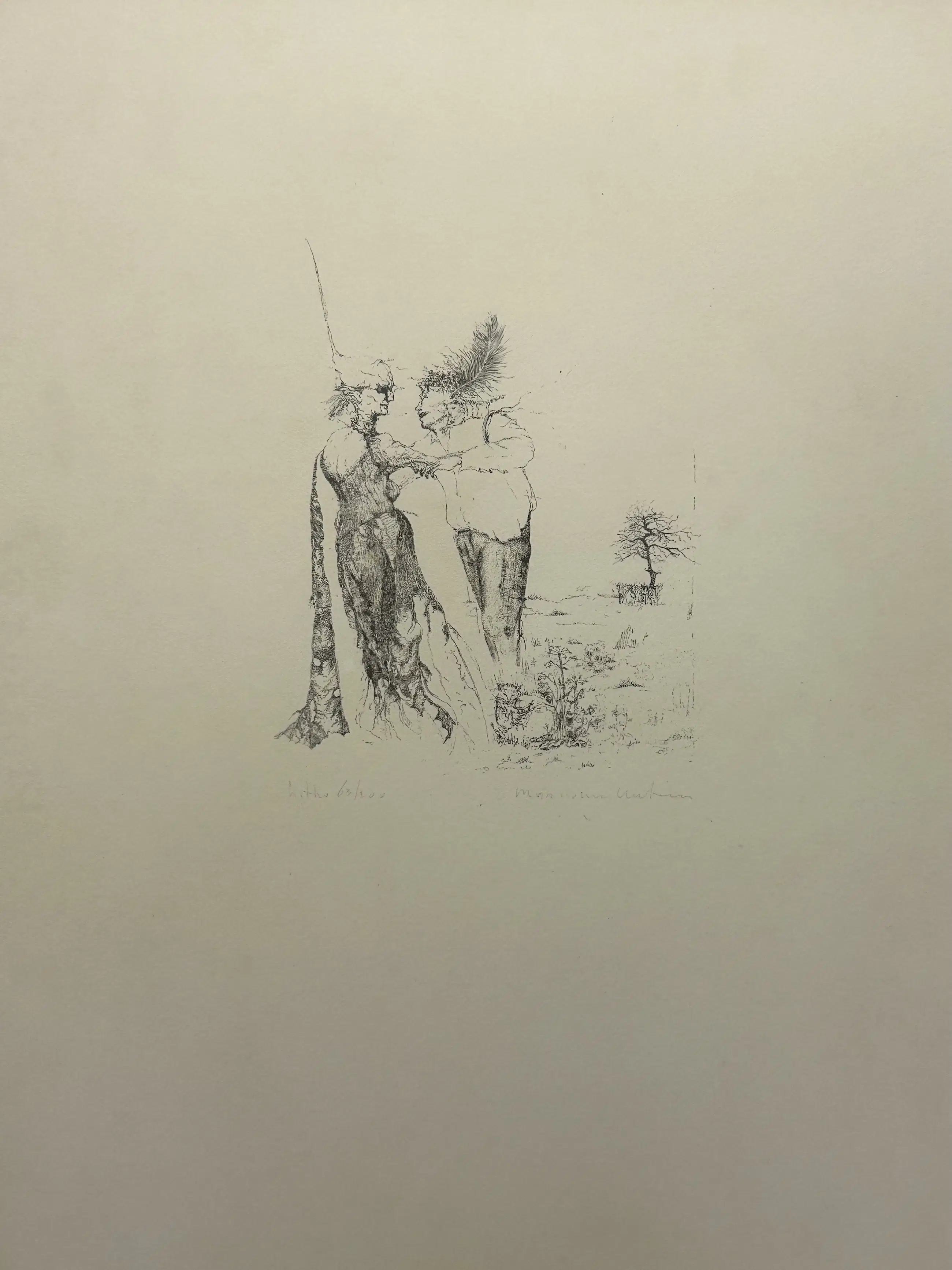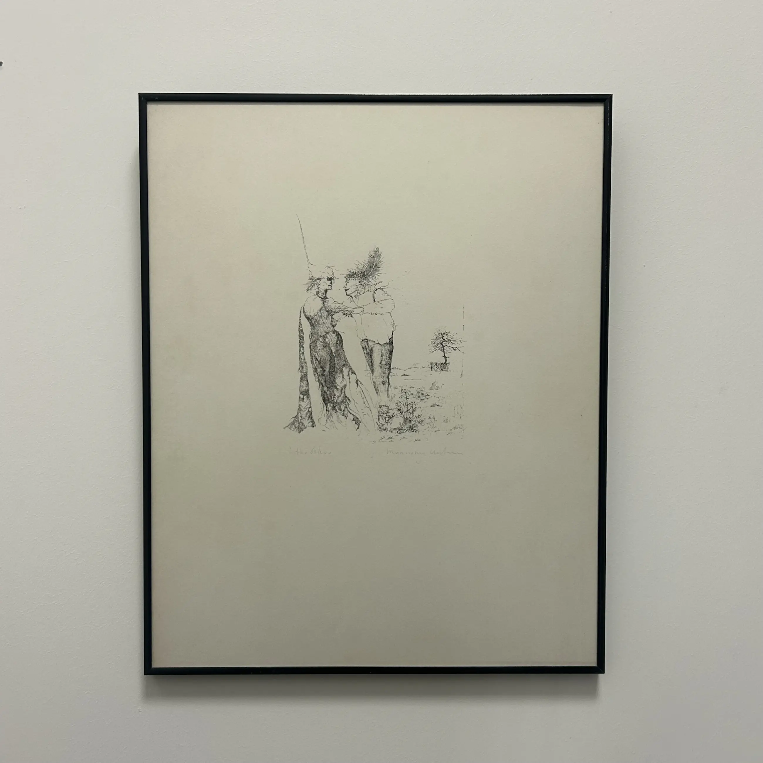 Dromerige voorstelling door Marianne Aartsen, in een aluminium zwarte lijst achter glas.
