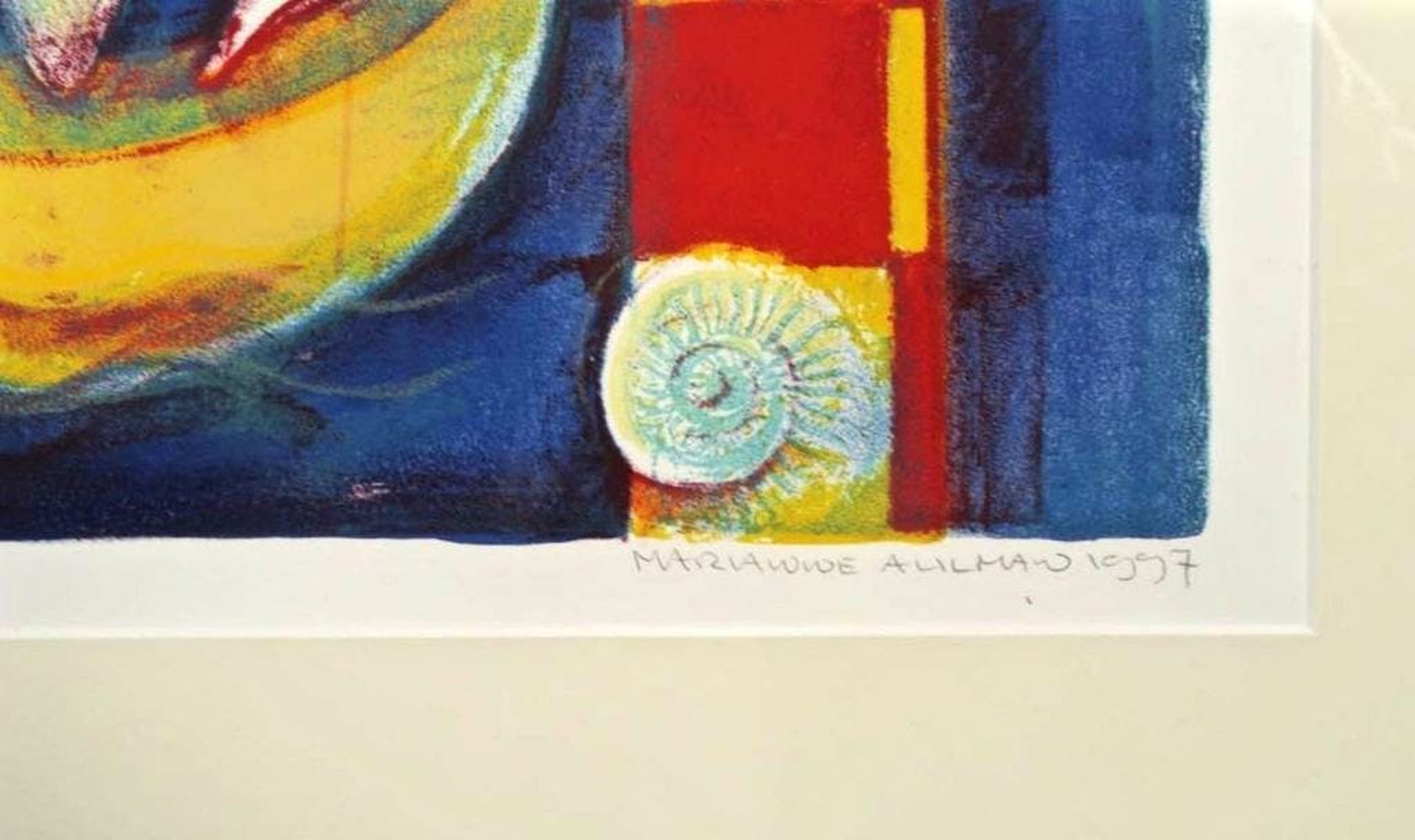 Titel: Sirenen IV Jaartal: 1997 Afmetingen lijst: 61 cm x 61 cm Oplage: 11/15 Gesigneerd: Ja, handgeschreven met potlood (rechtsonder) Materiaal: Litho op papier Ingelijst: Ja, in aluminium lijst Conditie kunstwerk: In zeer goede staat