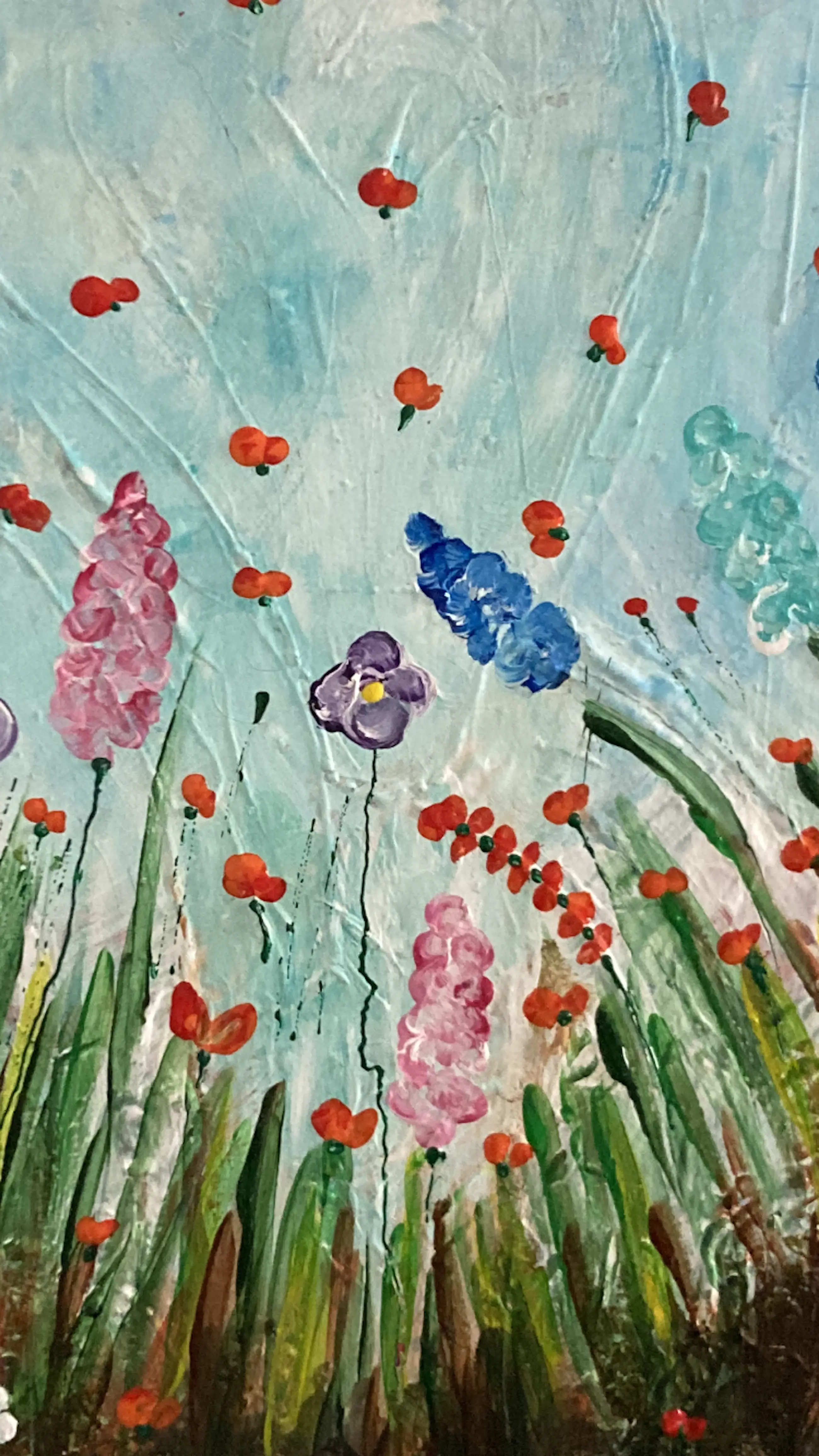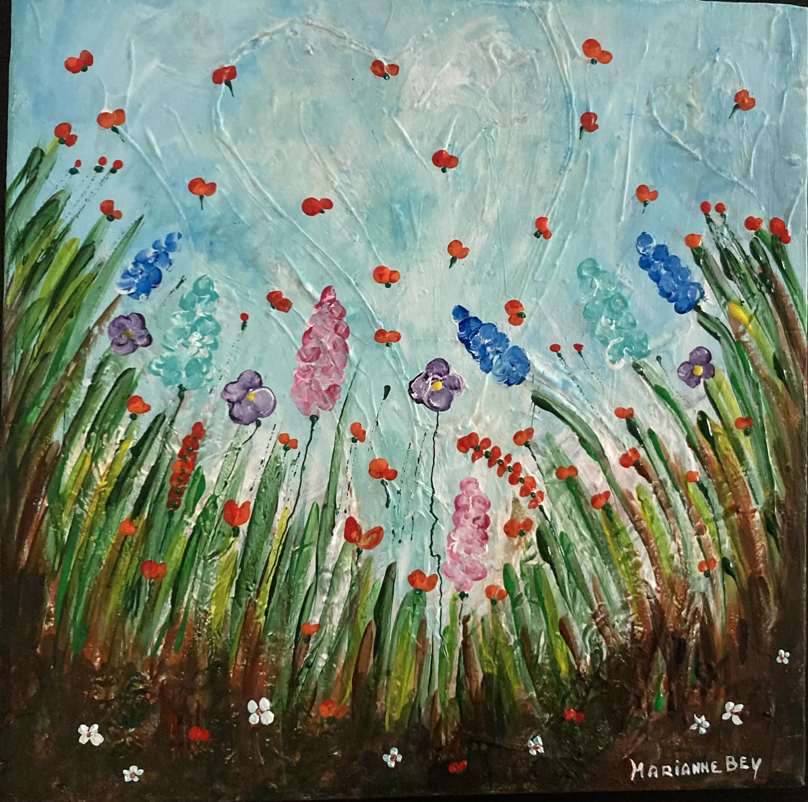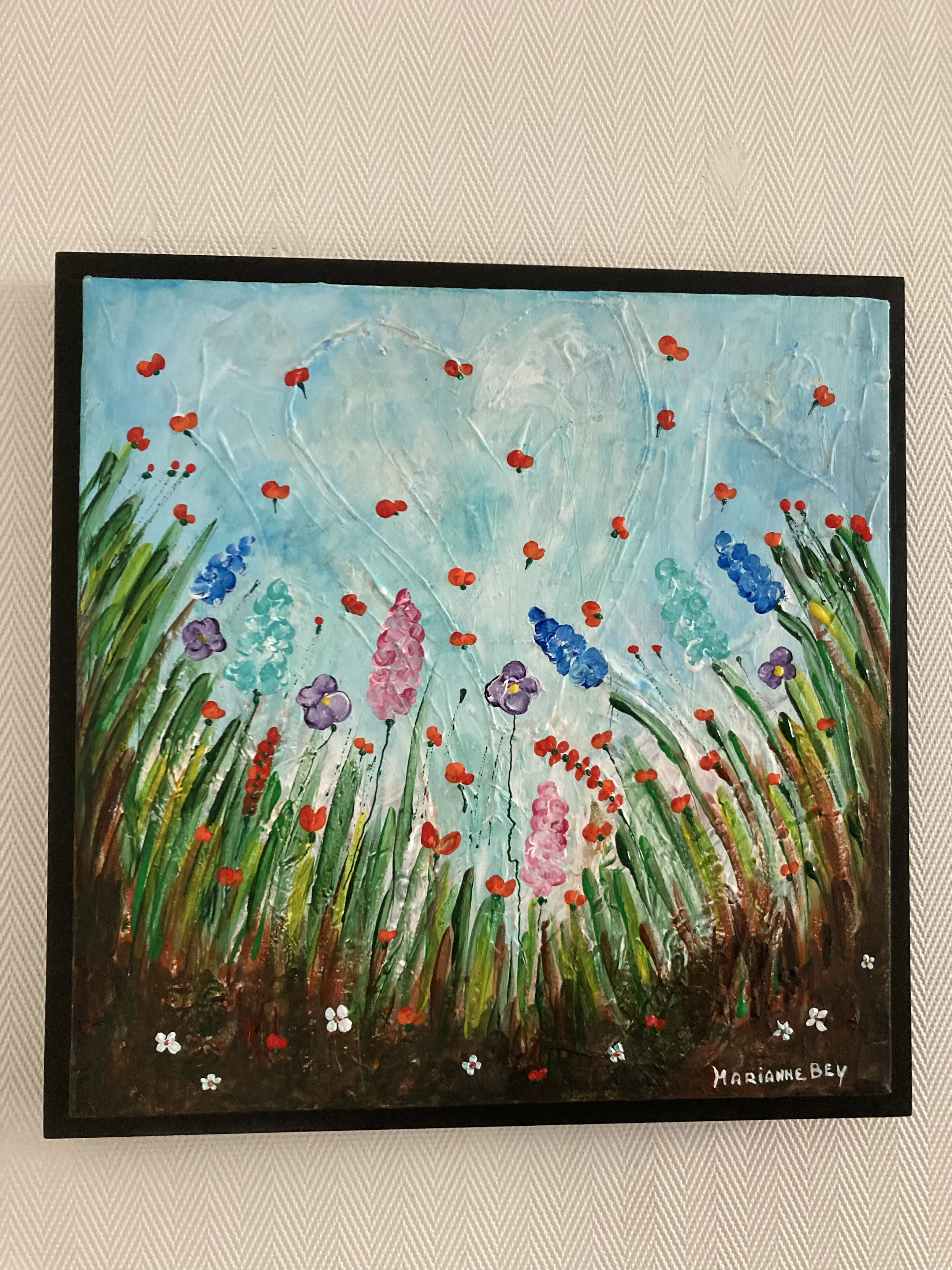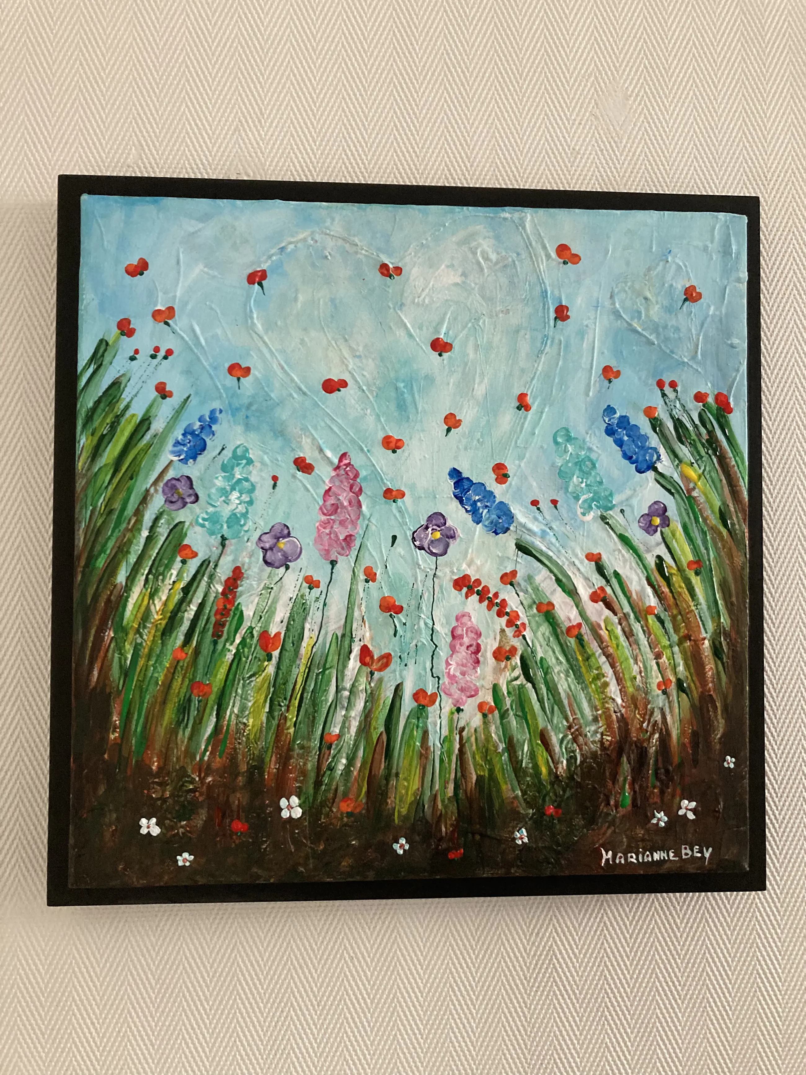 Een origineel en uniek bloemen schilderijtje van Marianne Bey Op canvas doek In zwart houten baklijst