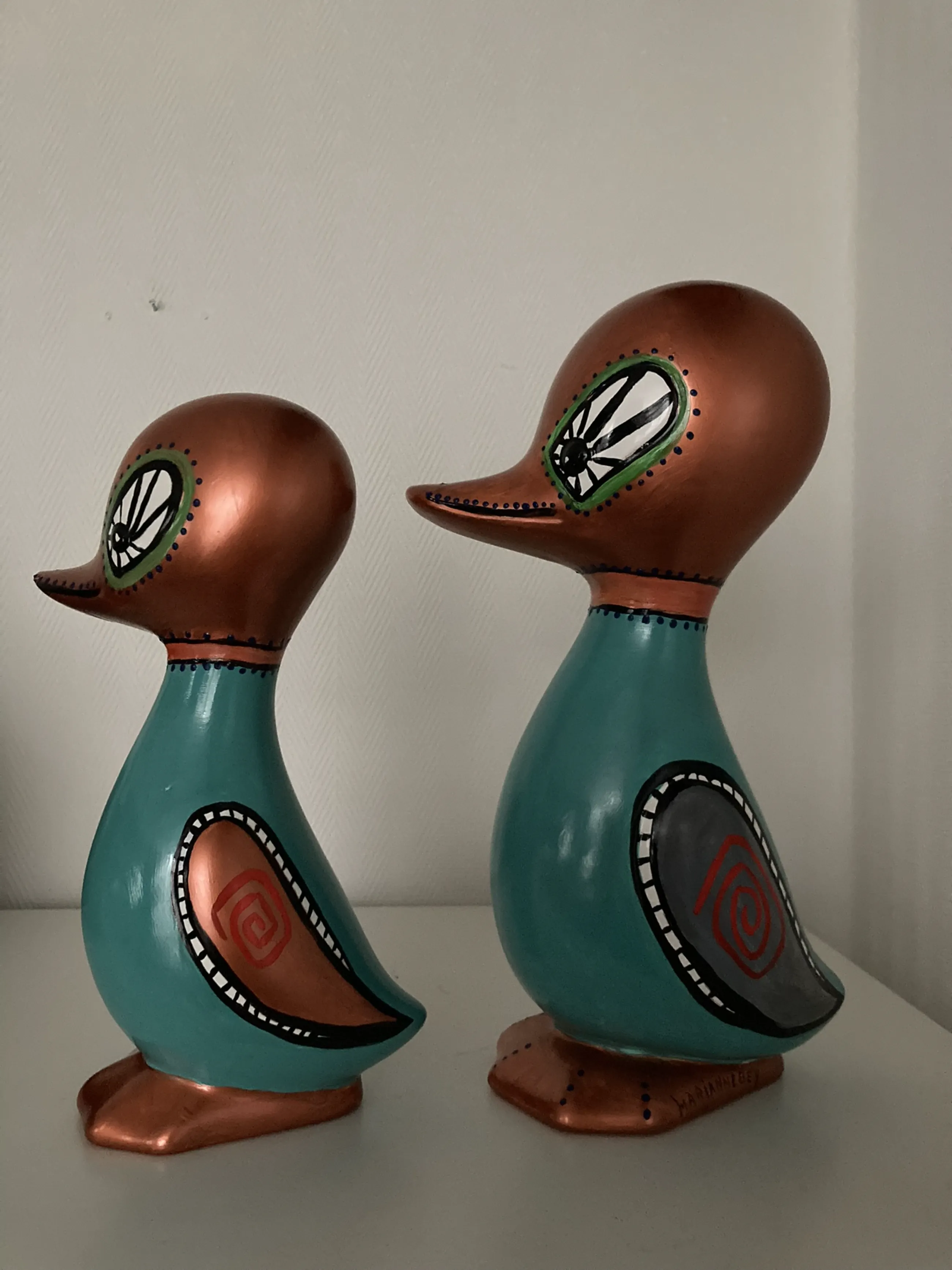Twee bijzondere keramische beelden van Marianne Bey Unica’s en gesigneerd Met de hand bewerkt en beschilderd Daarna in de oven gebakken op 150 graden Maten : De grootste staat hierboven Maten de kleinste zijn : 24 cm H x 15 cm Br x 9 cm D Allen MijnKunst items worden aangetekend naar u verstuurd