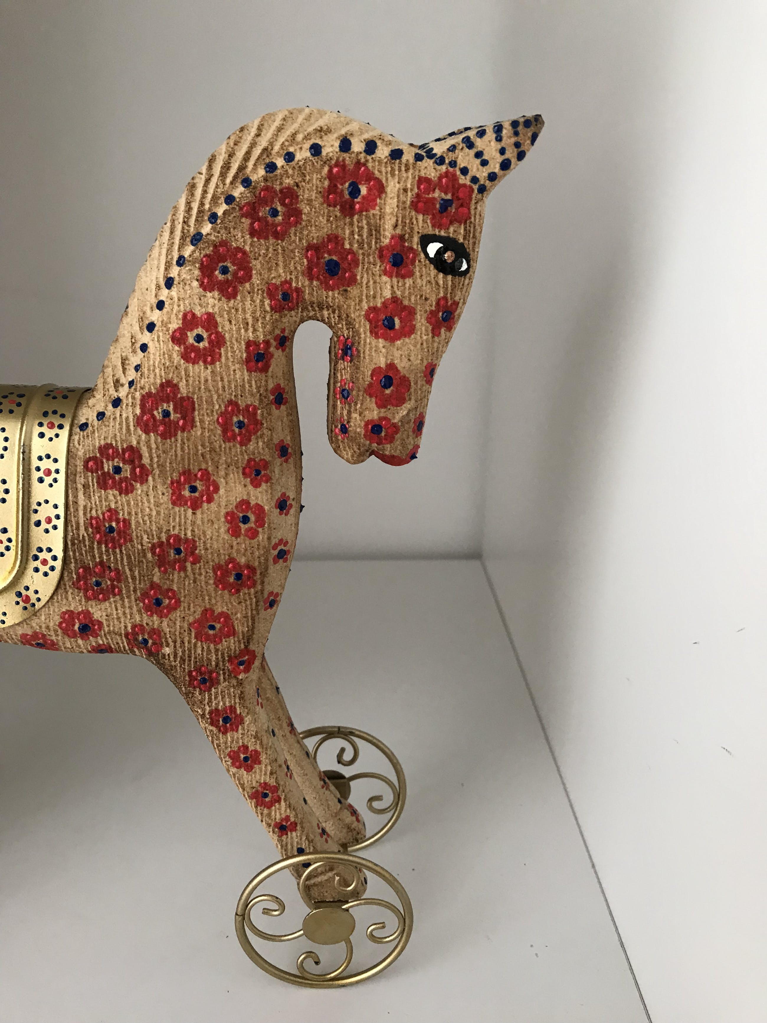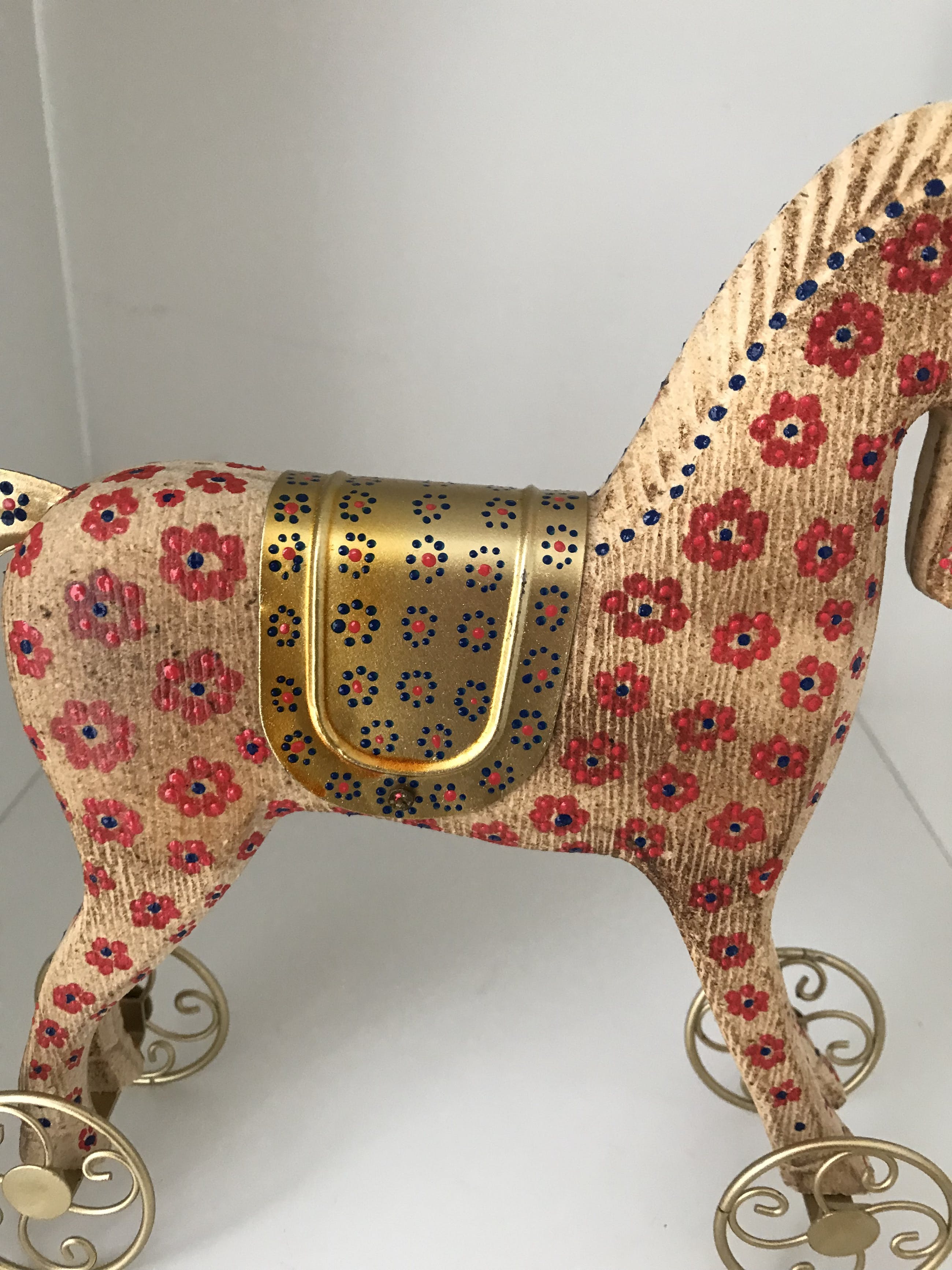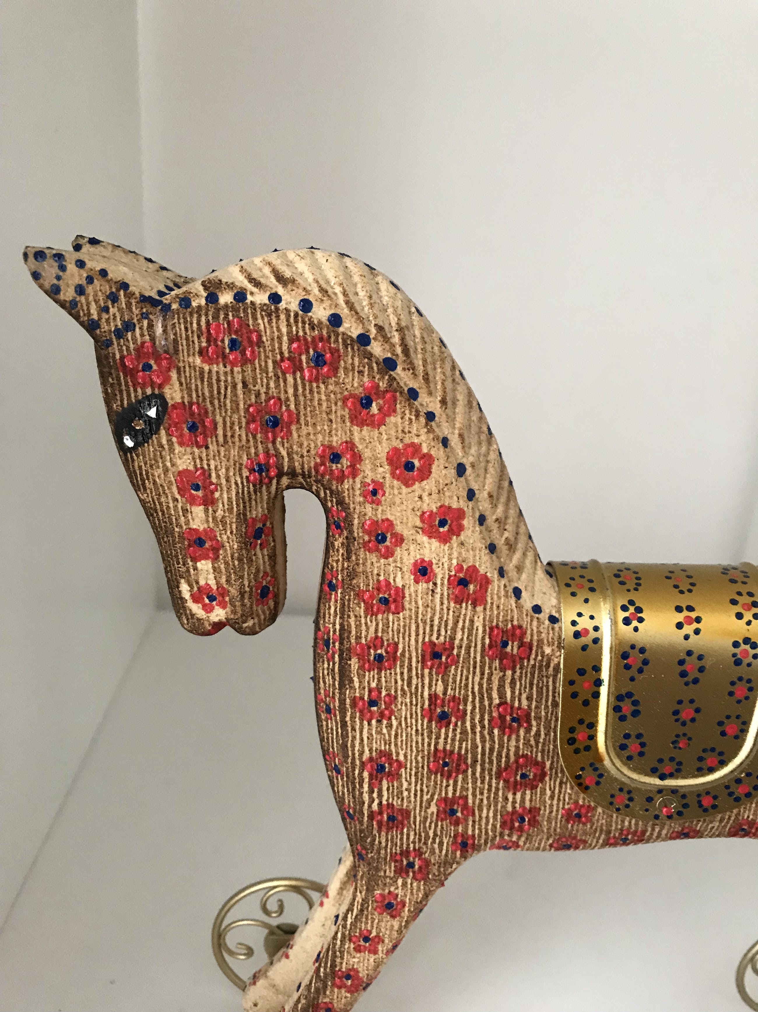 Een uniek gestileerd houten paardje op gietijzeren onderstel van Marianne Bey Unica en Gesigneerd Uit een collectie van 44 verschillend gestileerde paardjes . Met certificaat van echtheid Alle MijnKunst items worden aangetekend verstuurd .