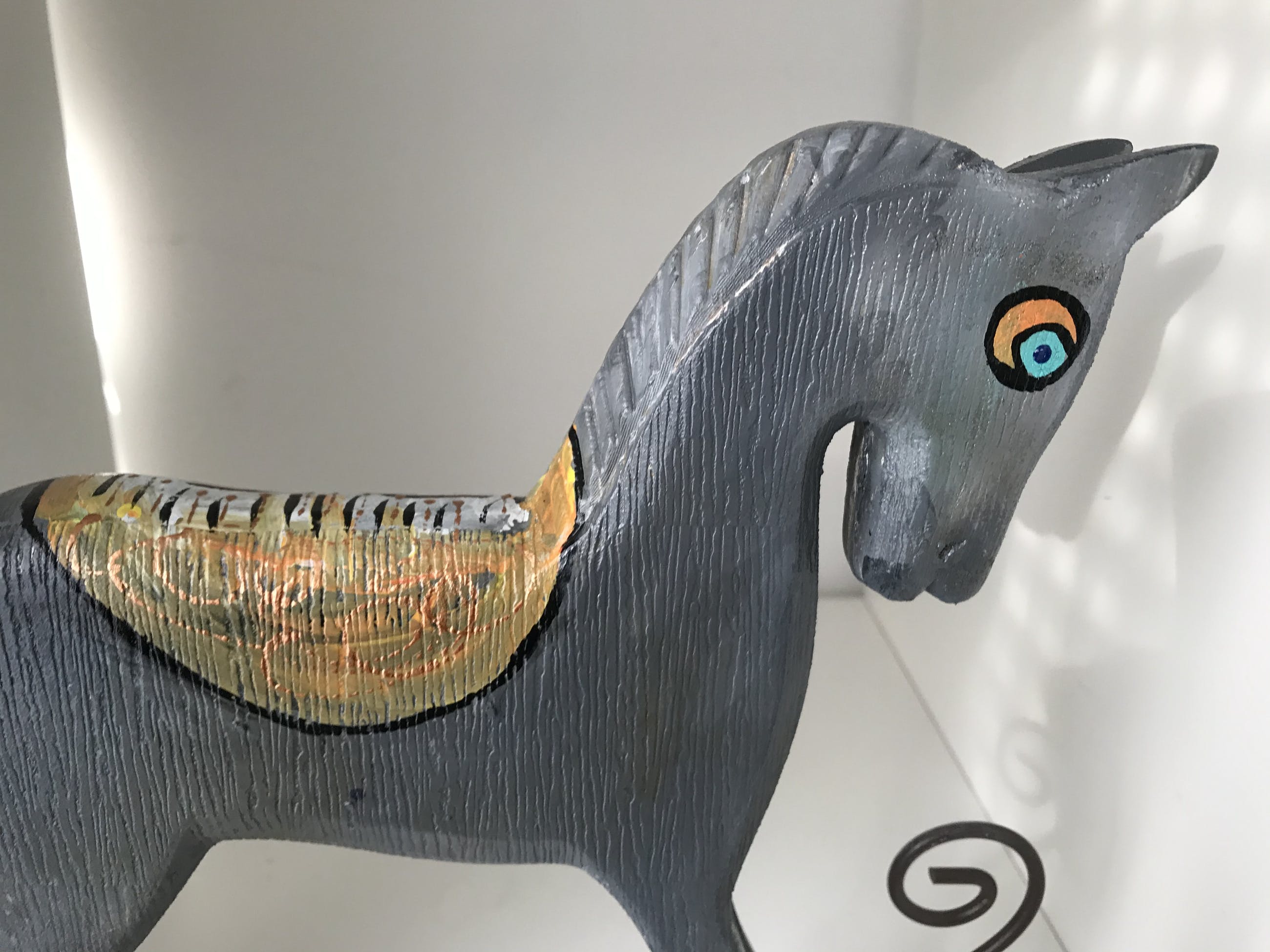 Een uniek gestileerd houten paardje op gietijzeren onderstel van Marianne Bey Unica . Uit een collectie van 44 verschillend gestileerde houten paardjes . Collectors item . Allen Marianne Bey items worden aangetekend verstuurd