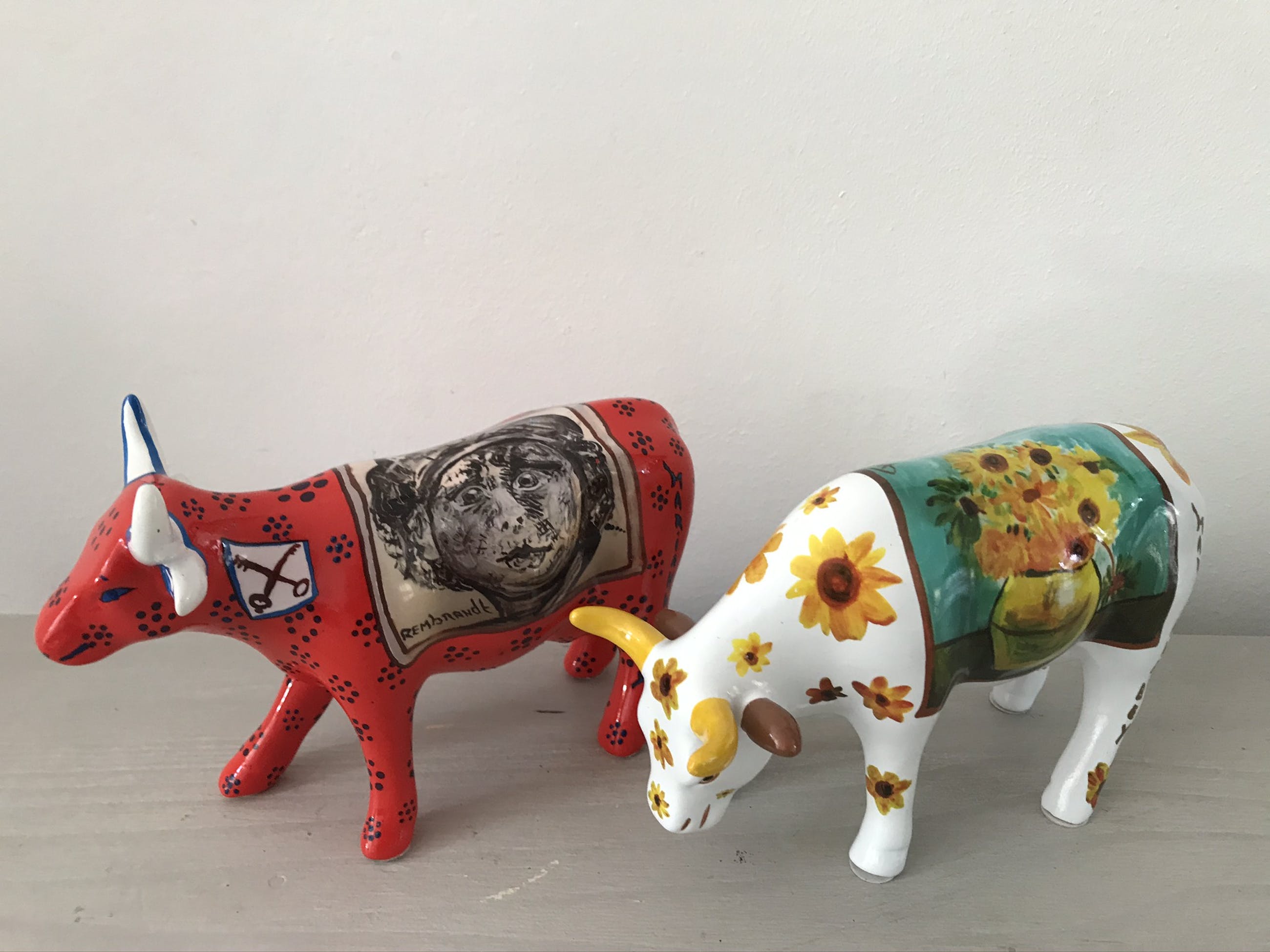 Twee keramische Cowparade koetjes van Marianne Bey Gesigneerd op linker achterpoot Alle MijnKunst items worden aangetekend verstuurd