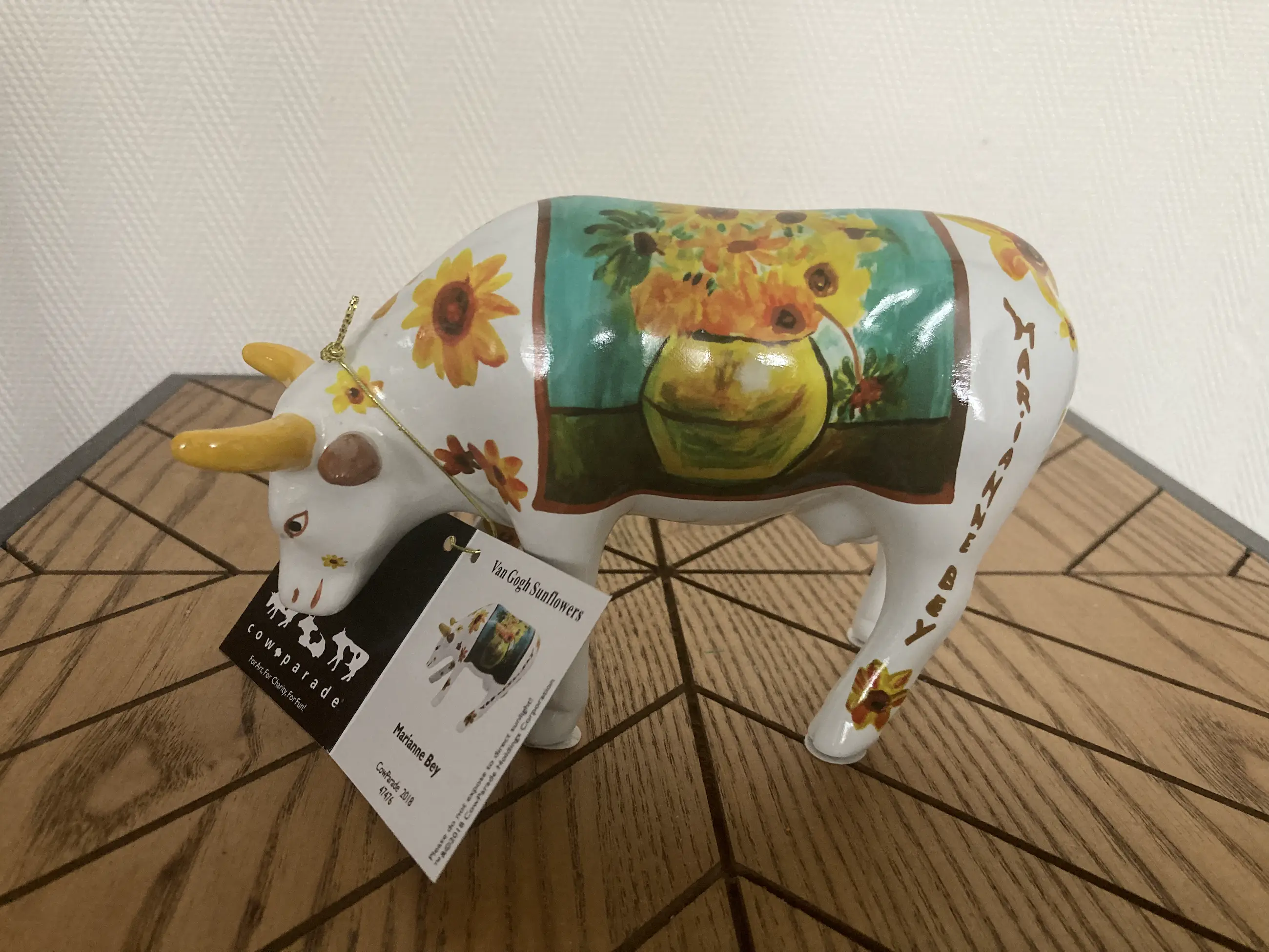 Twee Originelen keramische koetjes van Cowparade Designer Marianne Bey Selfportrait Rembrandt / Sunflowers van Gogh