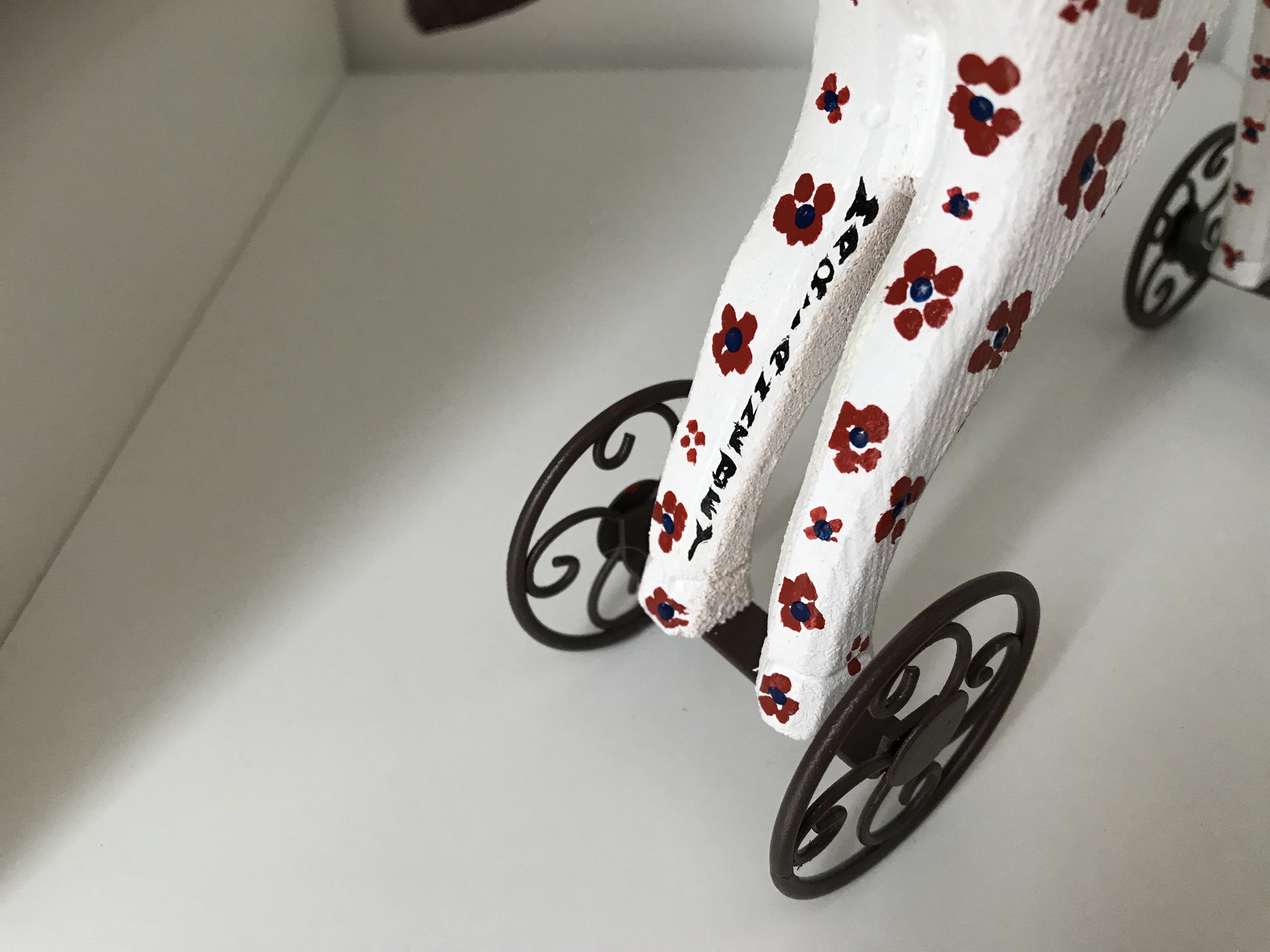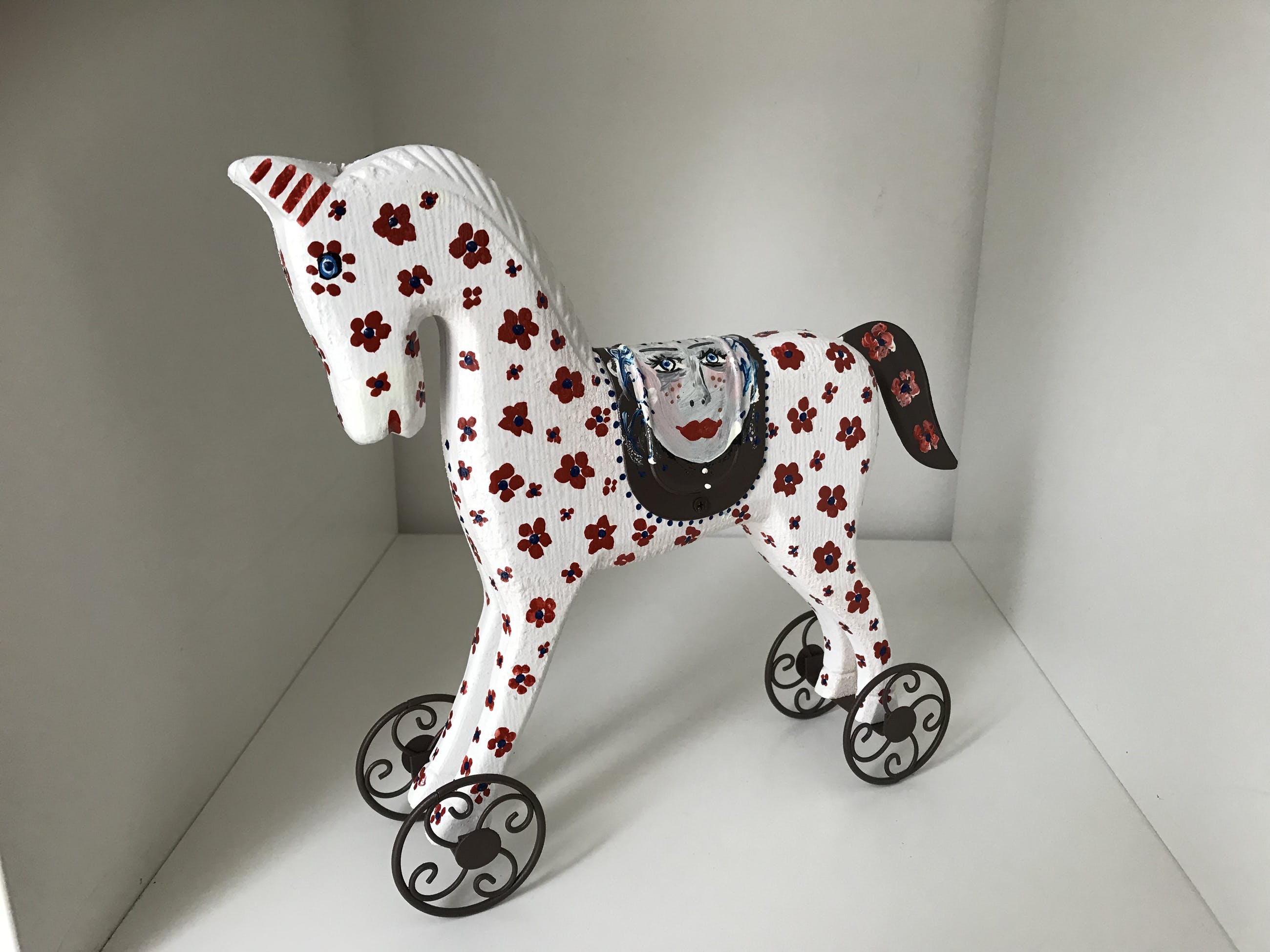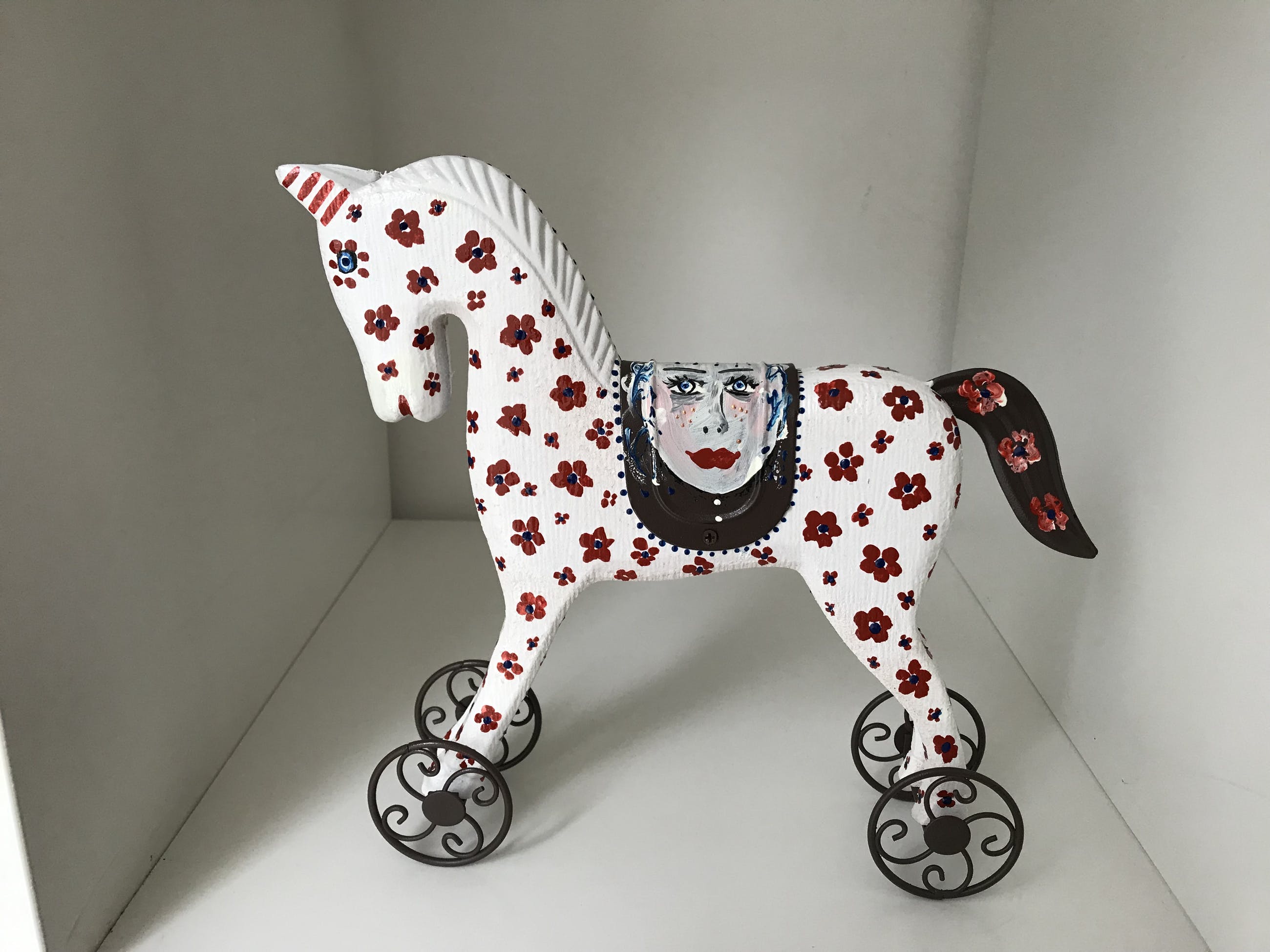 Een uniek gestileerd houten paardje op gietijzeren onderstel Uit een collectie van 44 verschillend gestileerde paardjes . Unica en gesigneerd Met certificaat Alle Marianne Bey items worden aangetekend verstuurd