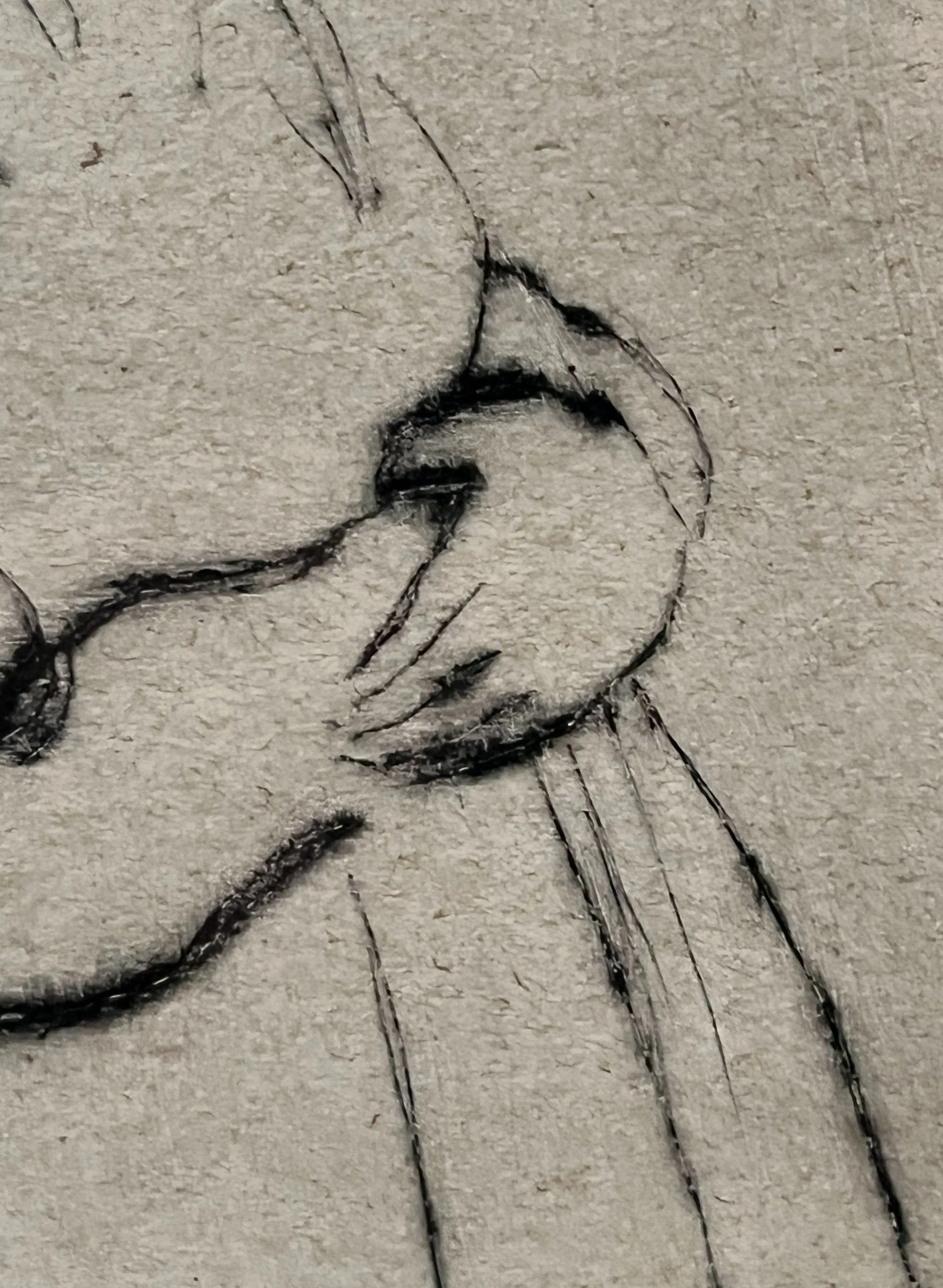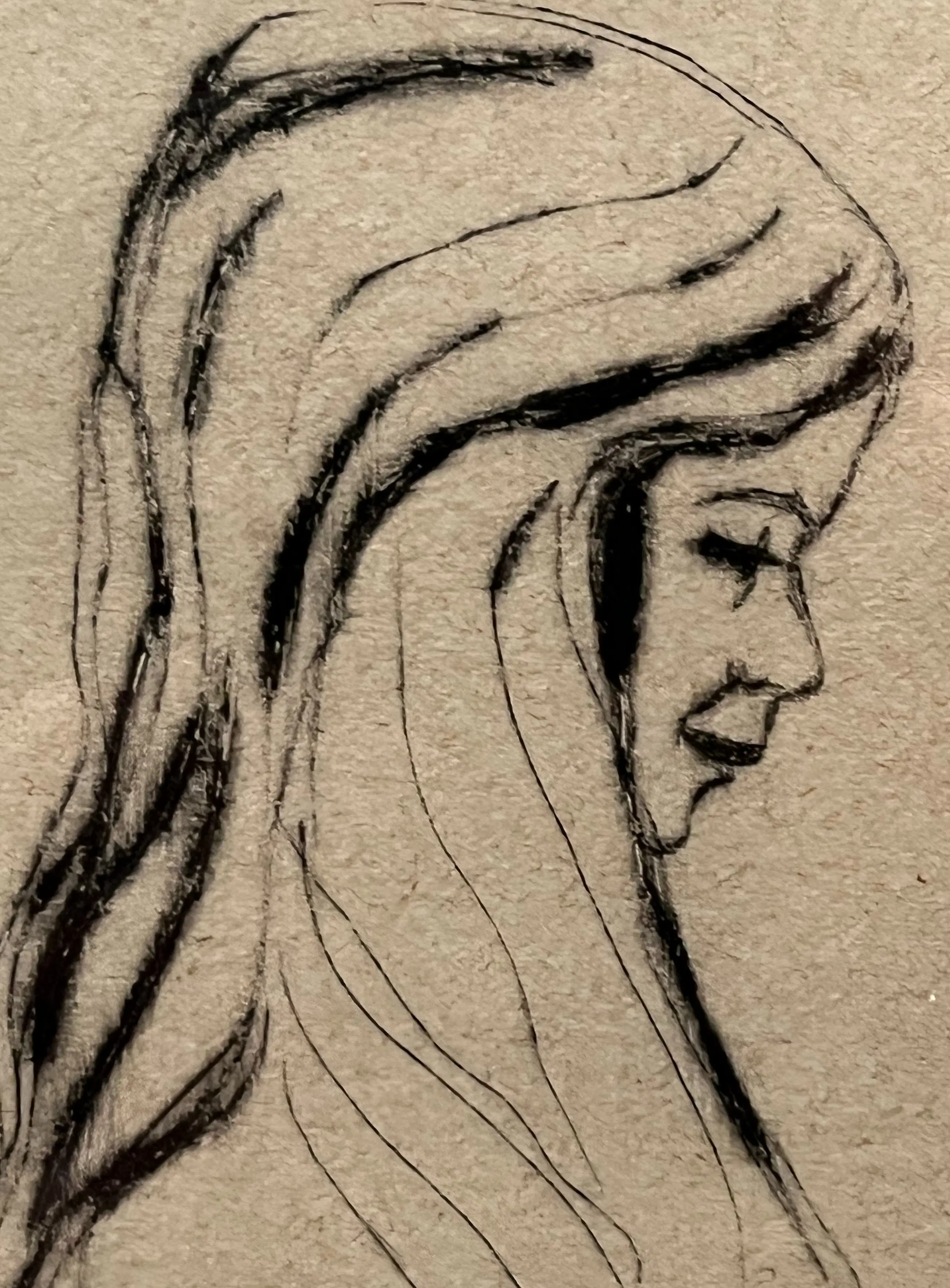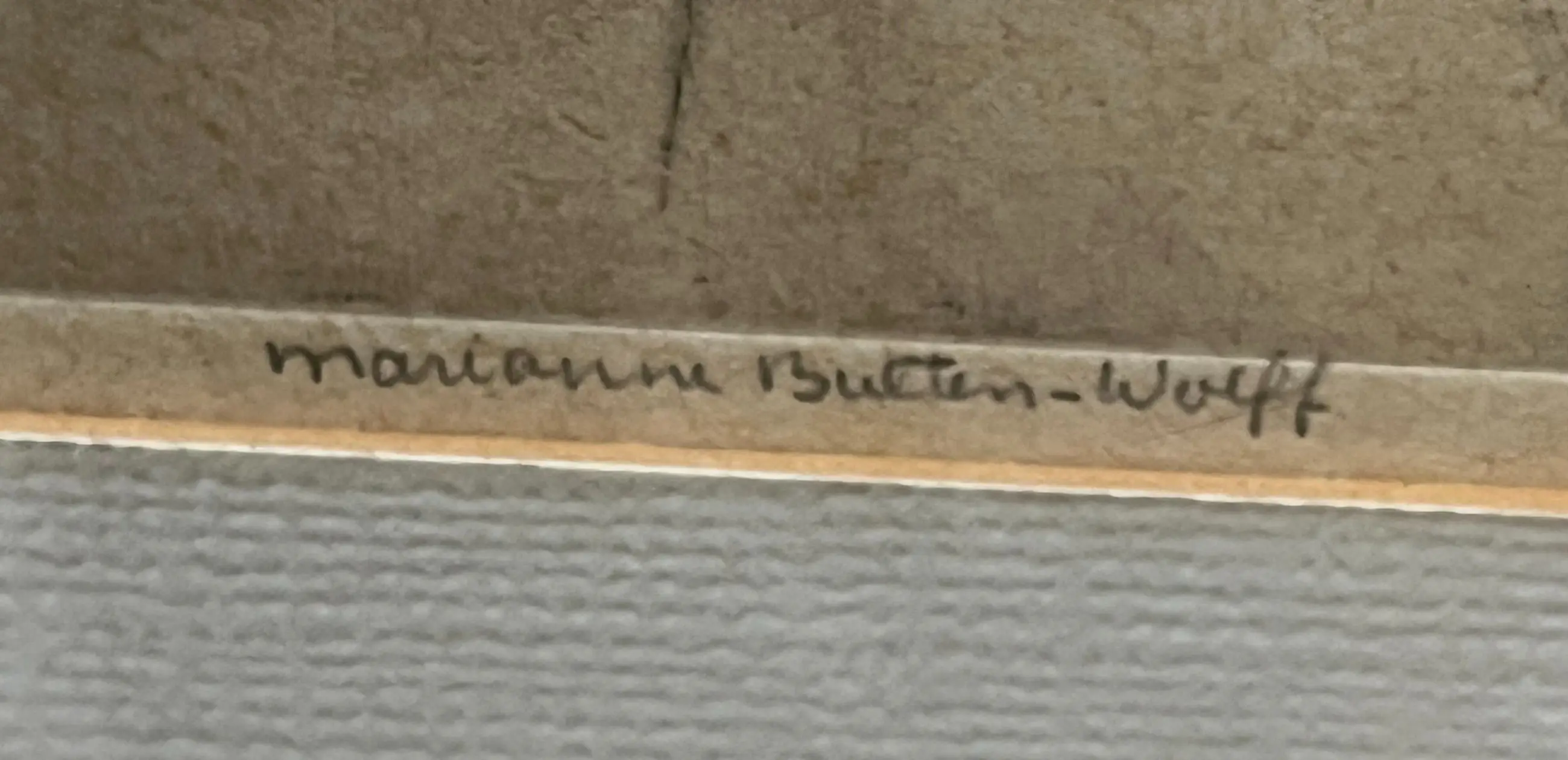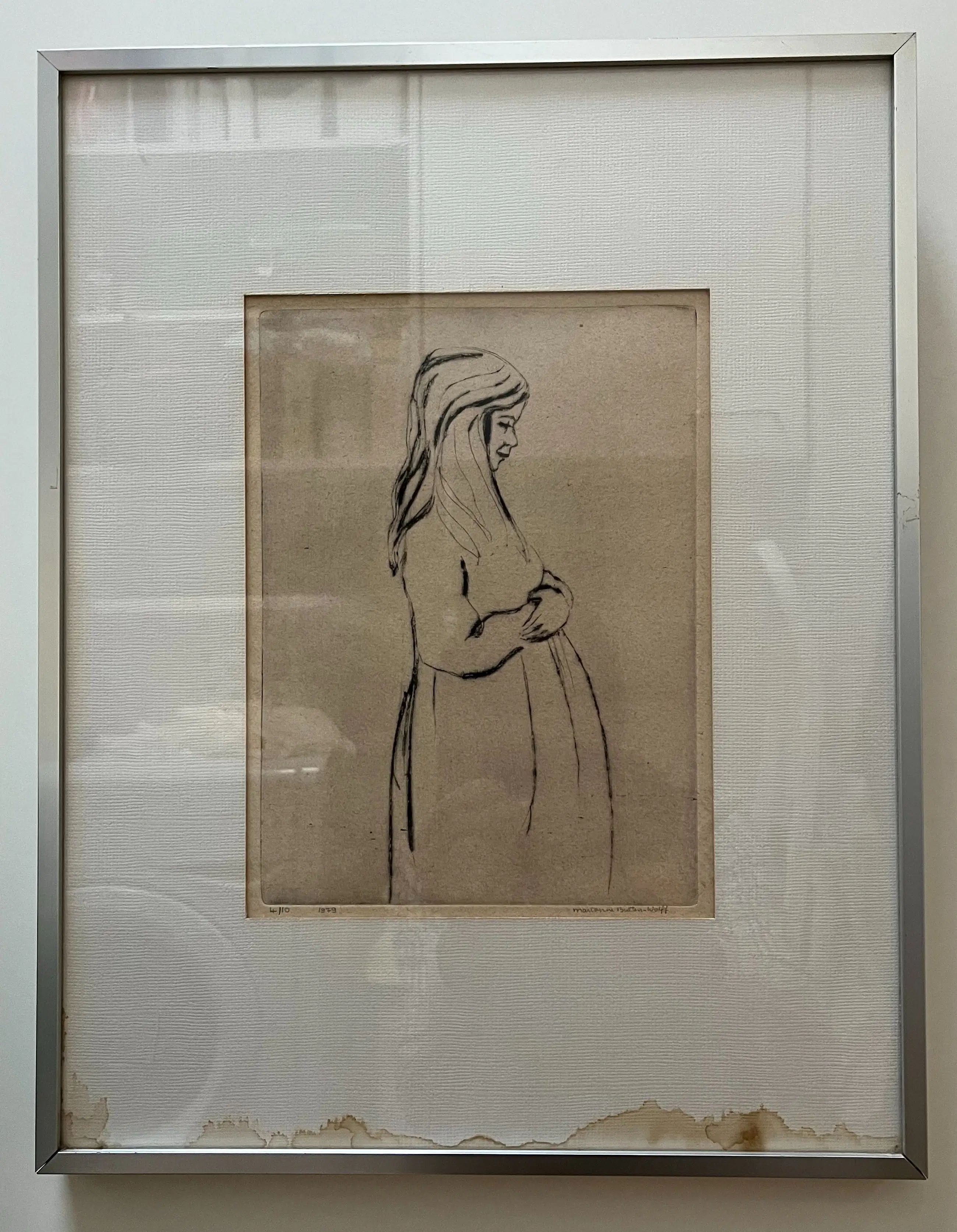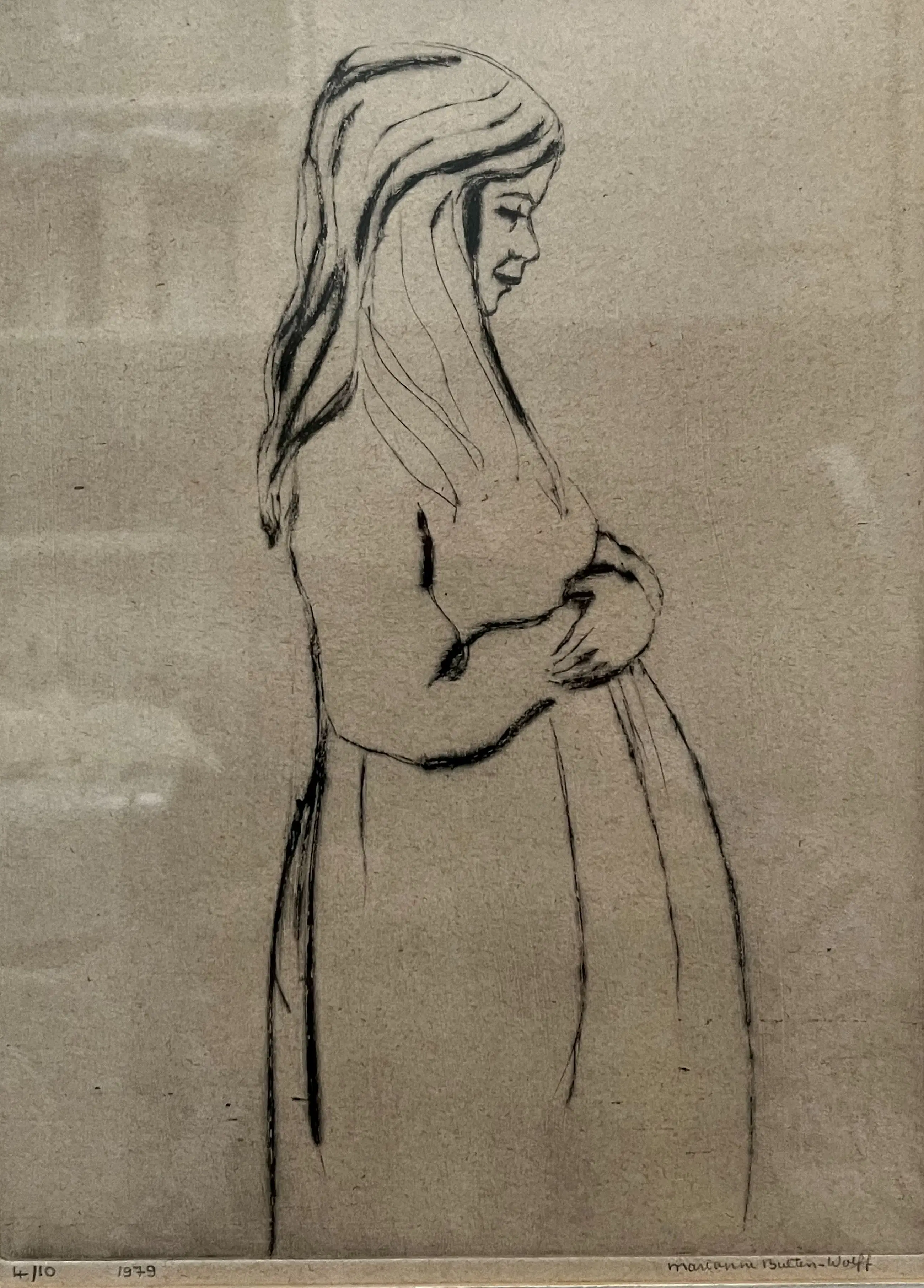 Marianne Bulten-Wolff is een Nederlandse schilder en graficus. In dit werk heeft ze met enkele lijnen een prachtig ingetogen sfeerbeeld gegeven van een aanstaande moeder.