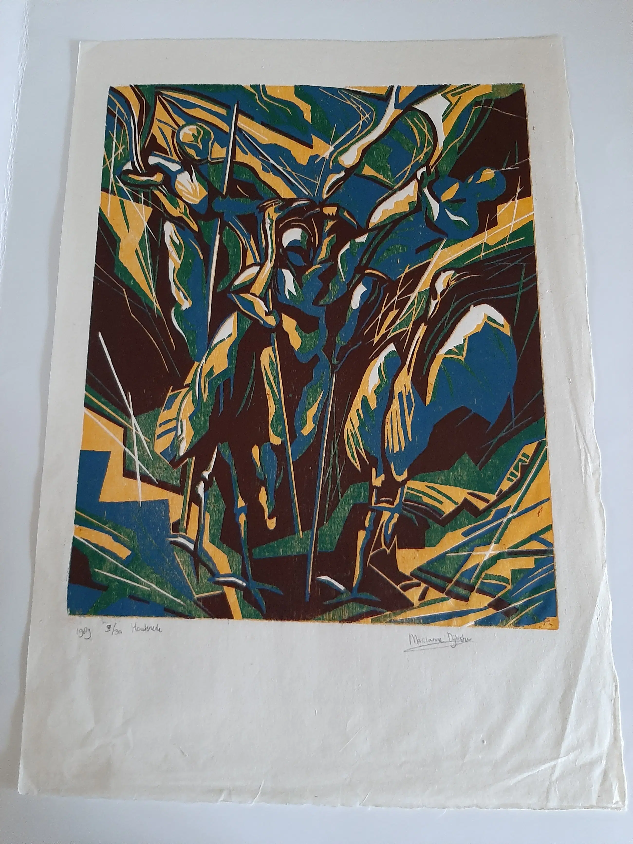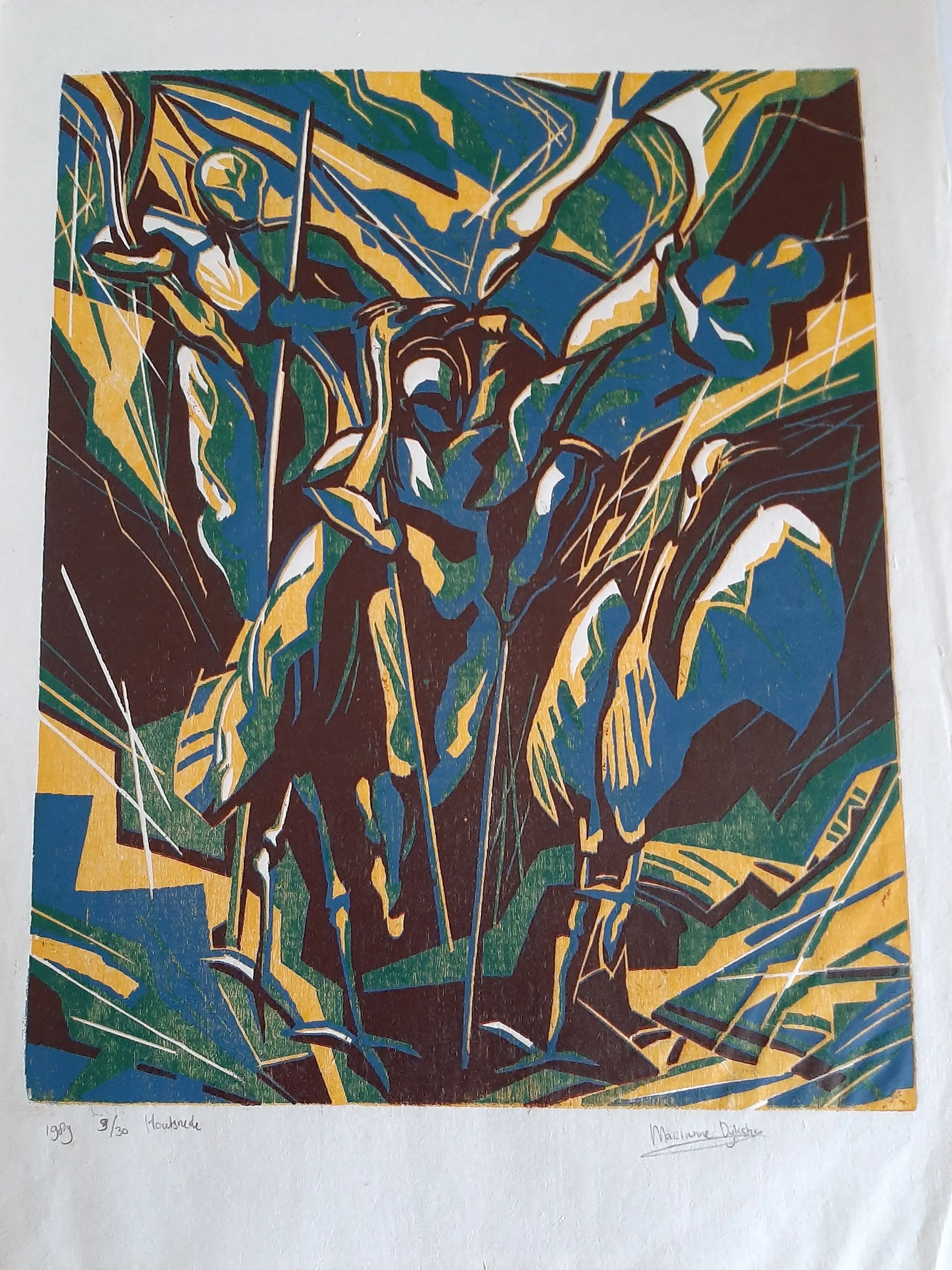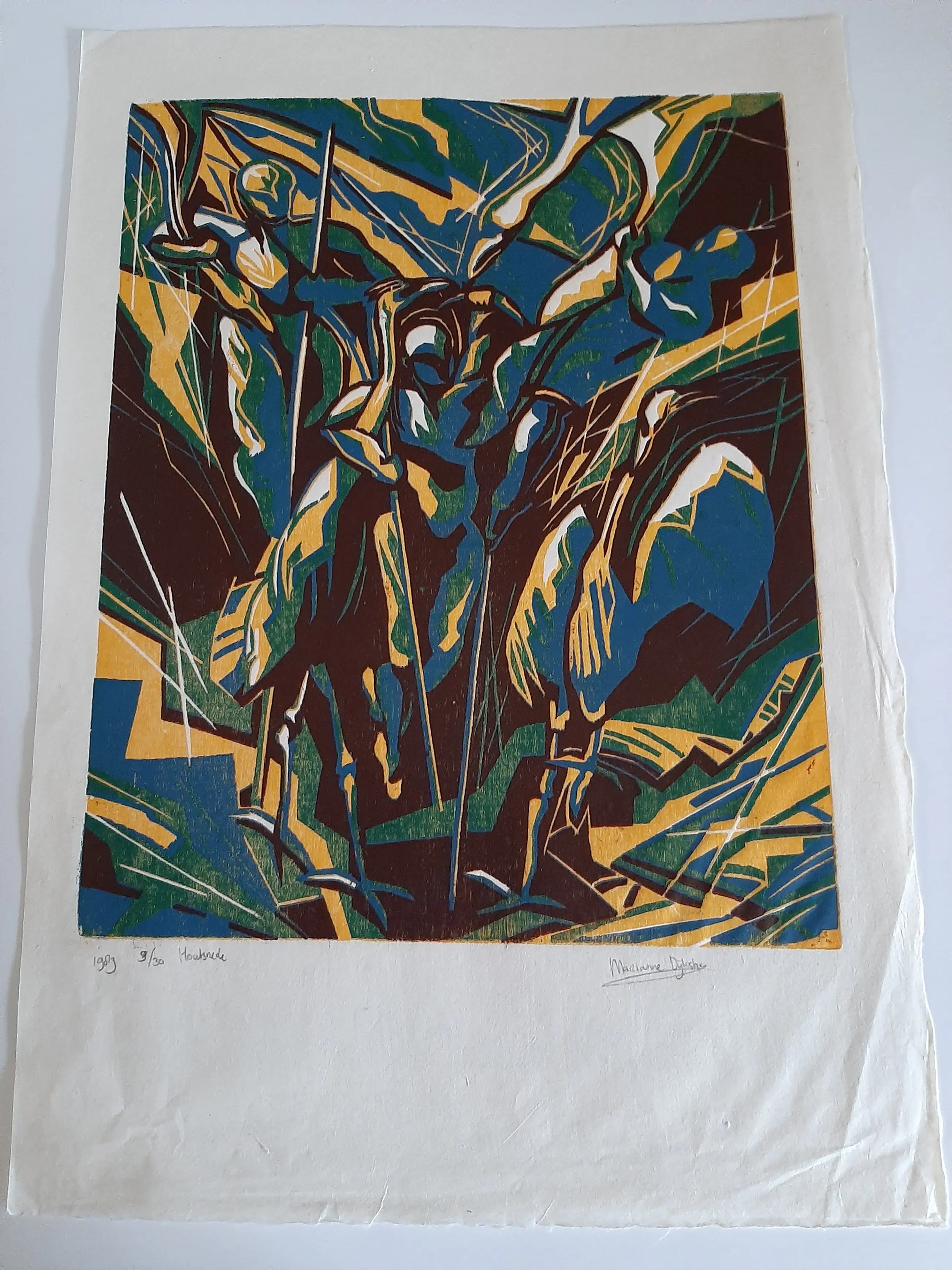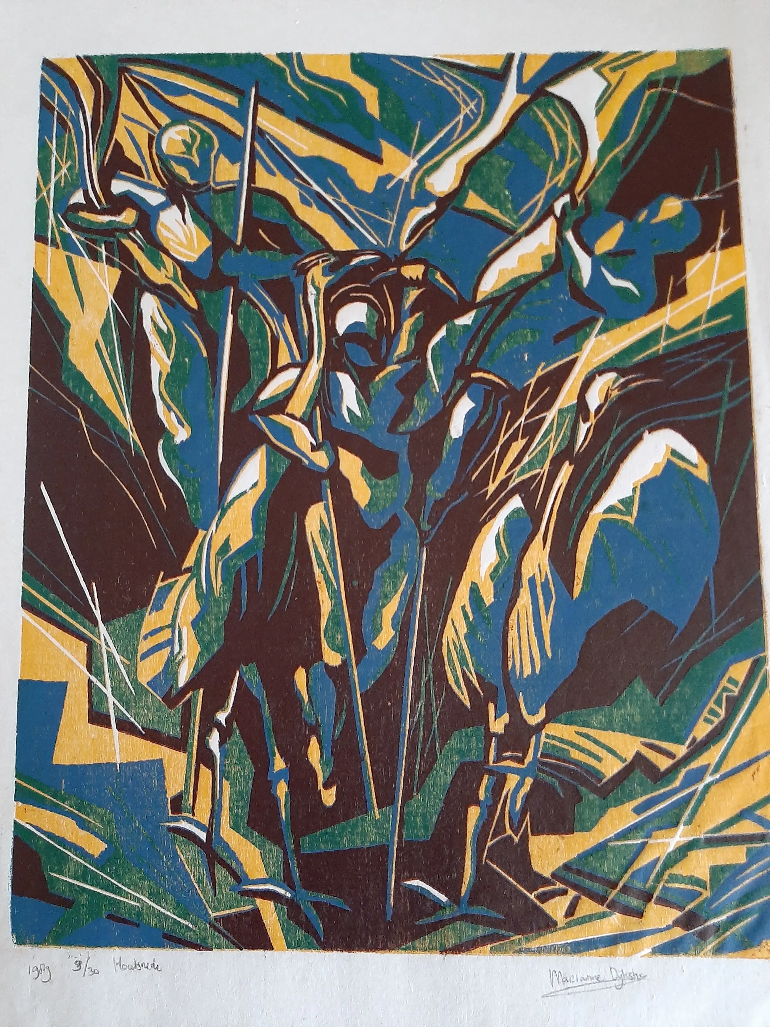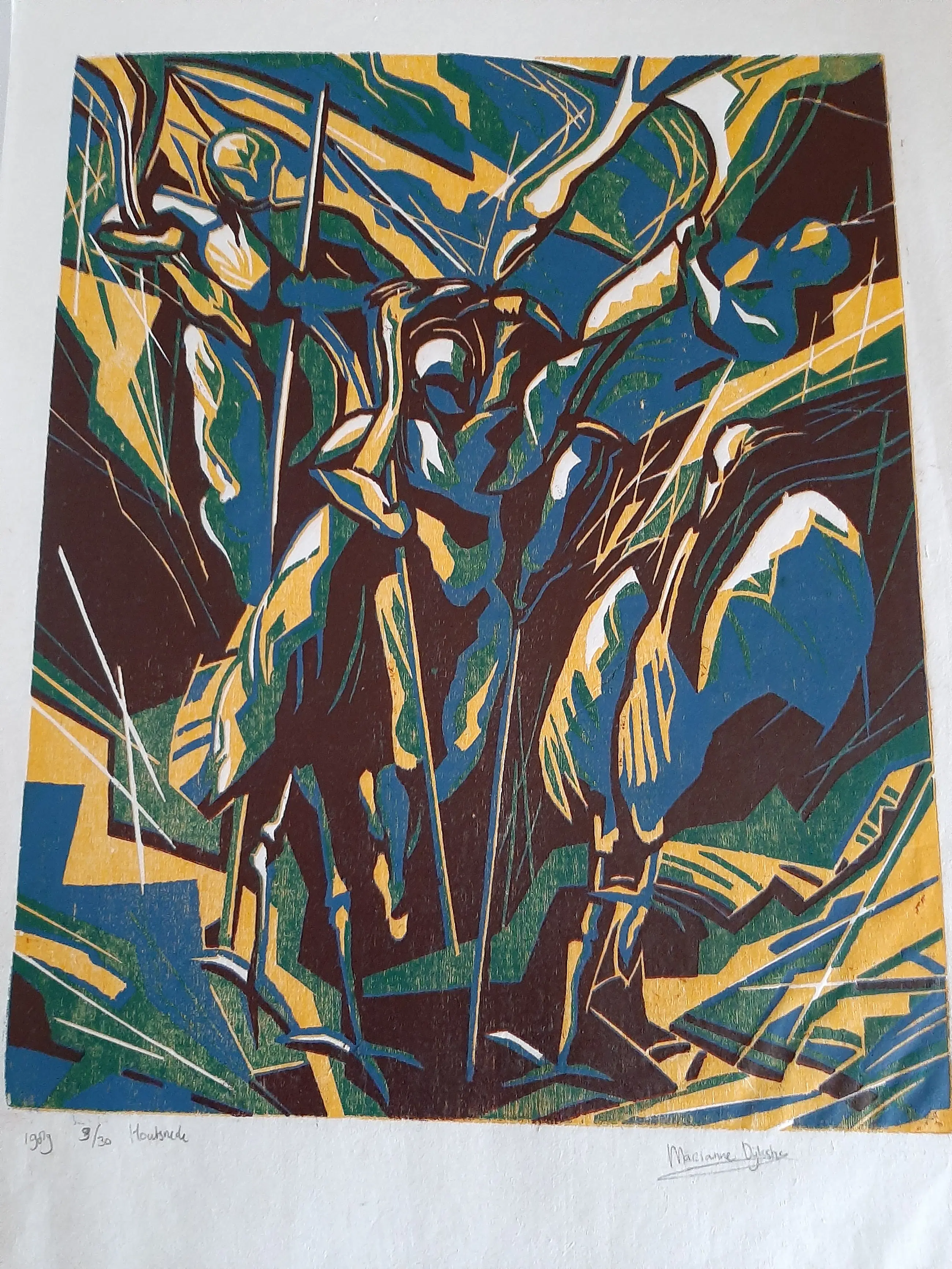 Marianne Dijkstra (1958) woont en werkt in Haarlem. In 1990 ben ik afgestudeerd aan de Gerrit Rietveld Academie in Schilderen en Grafiek Sindsdien ben ik werkzaam als autonoom beeldend kunstenares. Ik maak werken op doek en op papier waaronder andere grafiek, die geregeld op locaties in Nederland worden geëxposeerd. Naast mijn eigen werk, ontwikkel en begeleid ik ook kunstprojecten met kinderen. Ik geef workshops en cursussen aan jongeren, volwassenen en aan mensen met een verstandelijke handicap. In mijn werk houd ik mij veel al bezig met imaginaire ruimtes en landschappen waar vaak dieren maar ook mensen een prominente rol in vervullen. Het beeld kan enigszins vervreemdend aandoen. In een geheel eigen beeldtaal schilder ik levendig en fantasievol over mijn fascinaties, waarin de spiritualiteit van de natuur een zeer grote rol speelt.