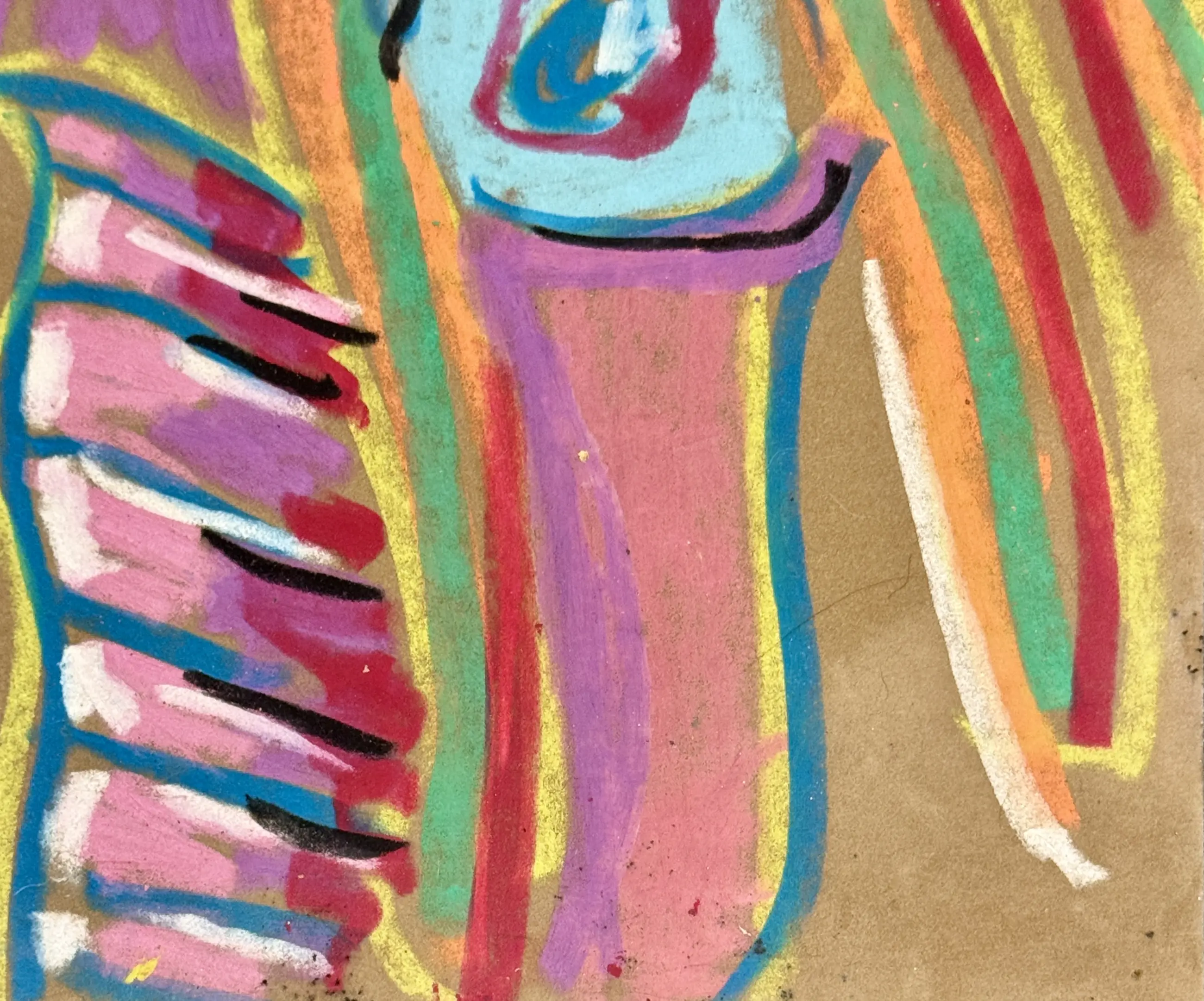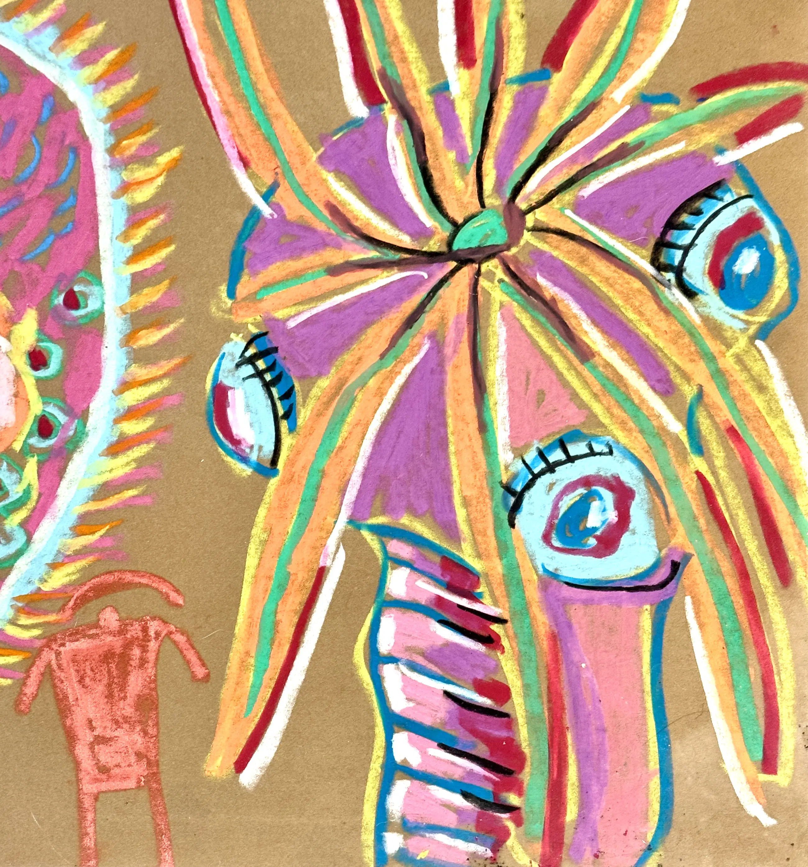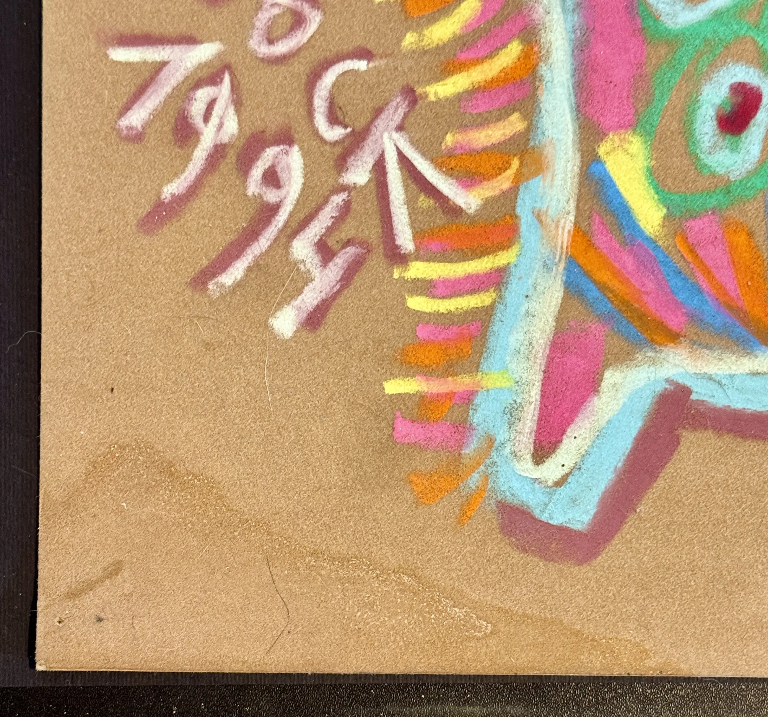 Door de gemengde techniek (pastel, gouache en inkt) krijgt het oppervlak een levendige, bijna tastbare textuur, wat de expressieve kracht van de compositie versterkt.