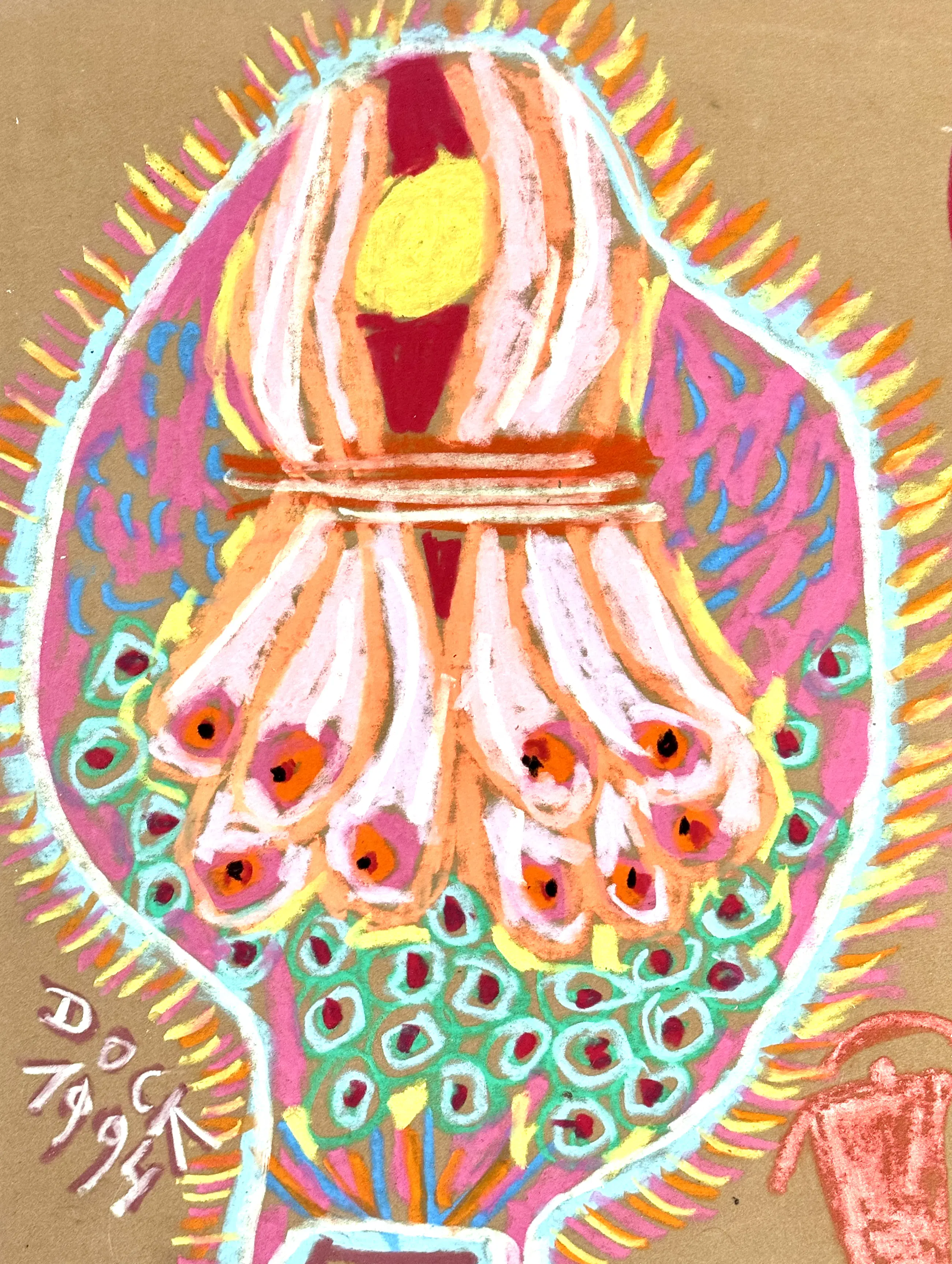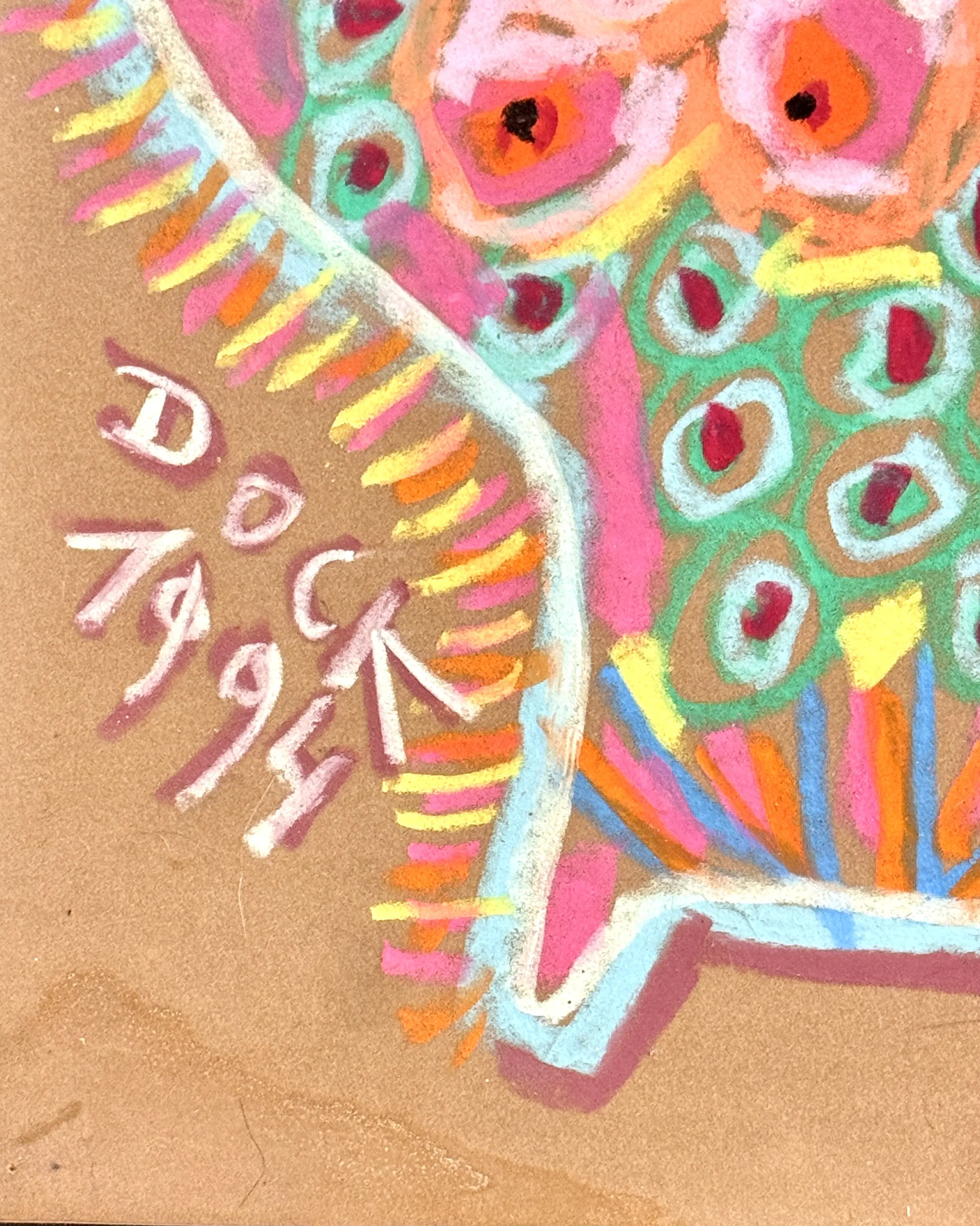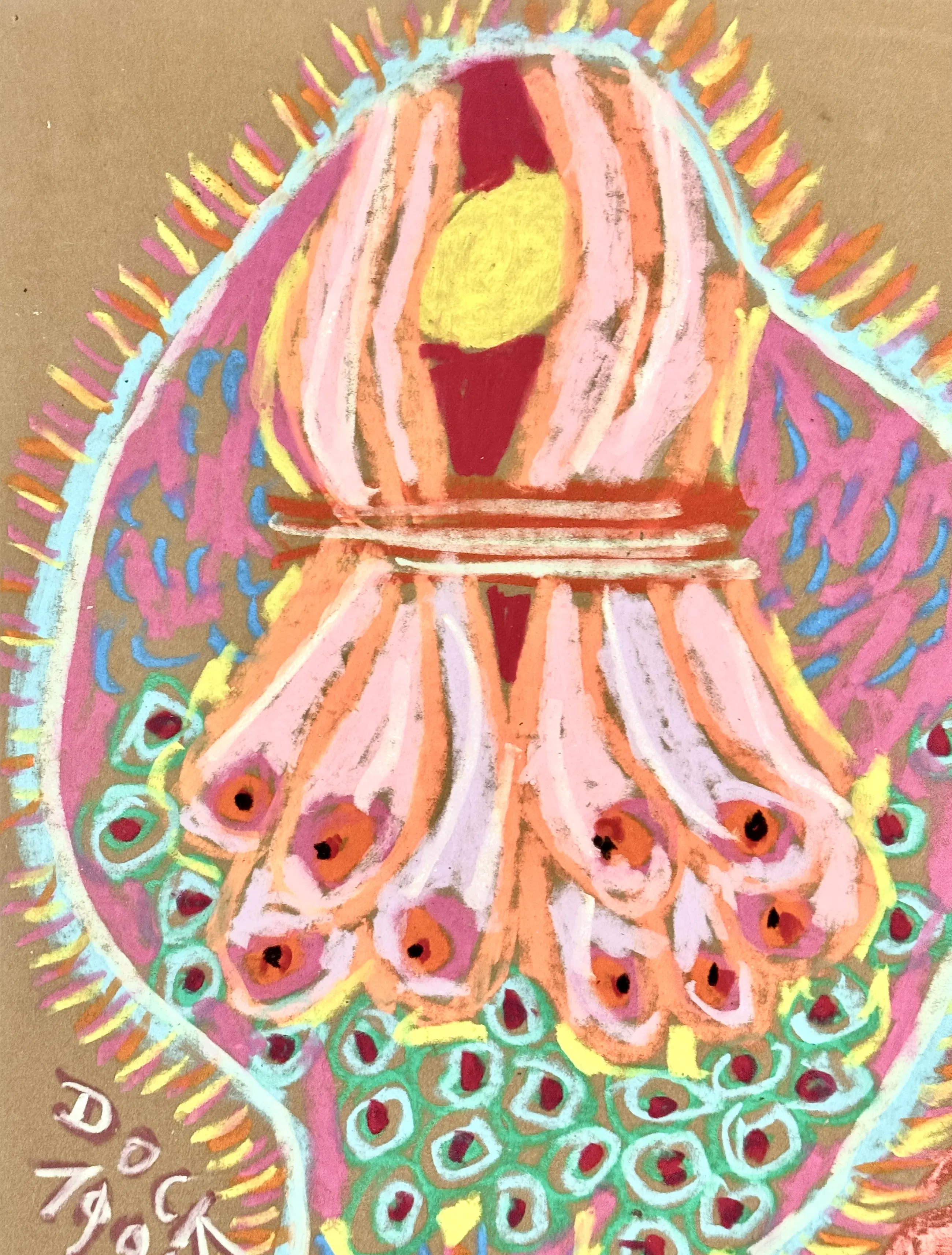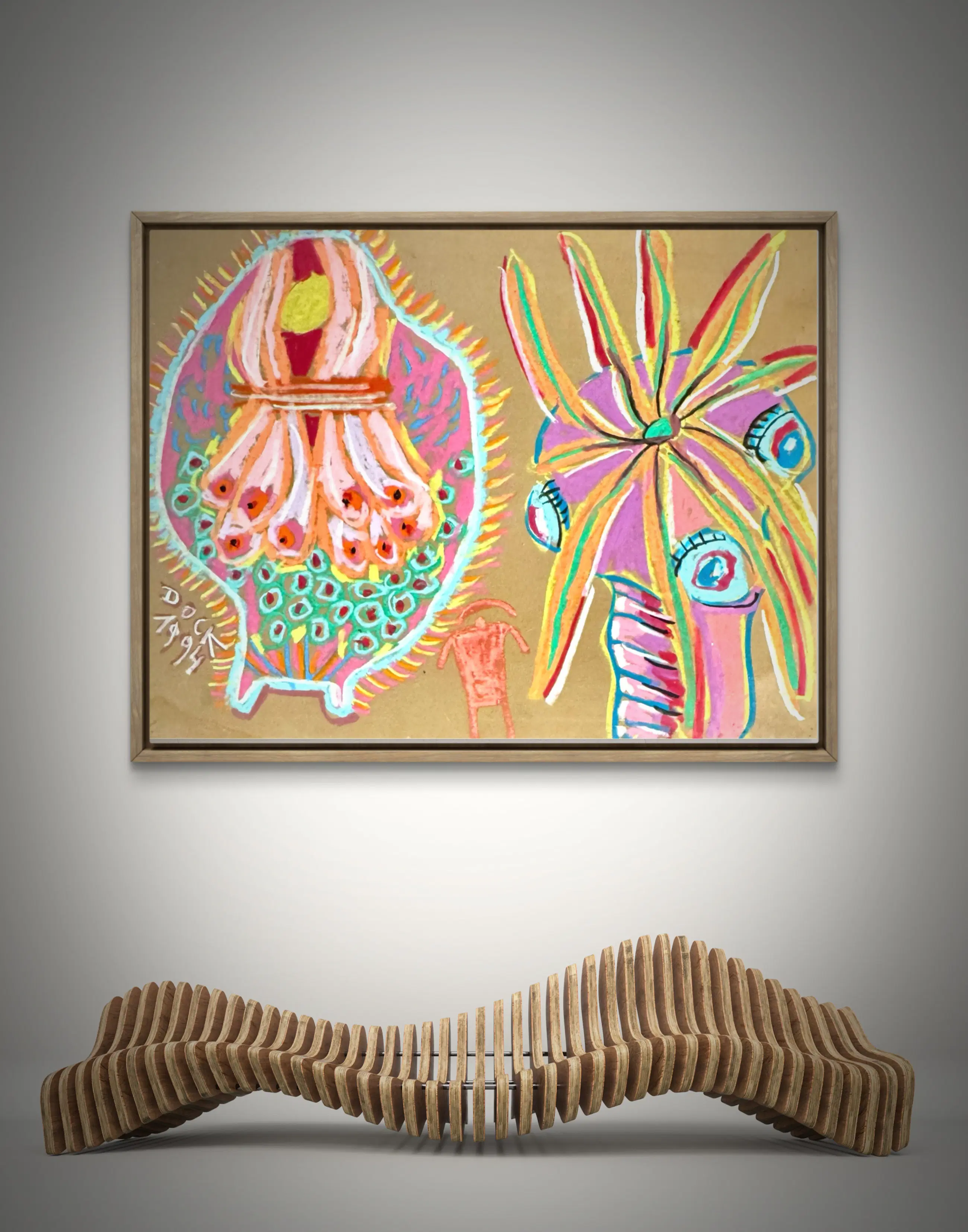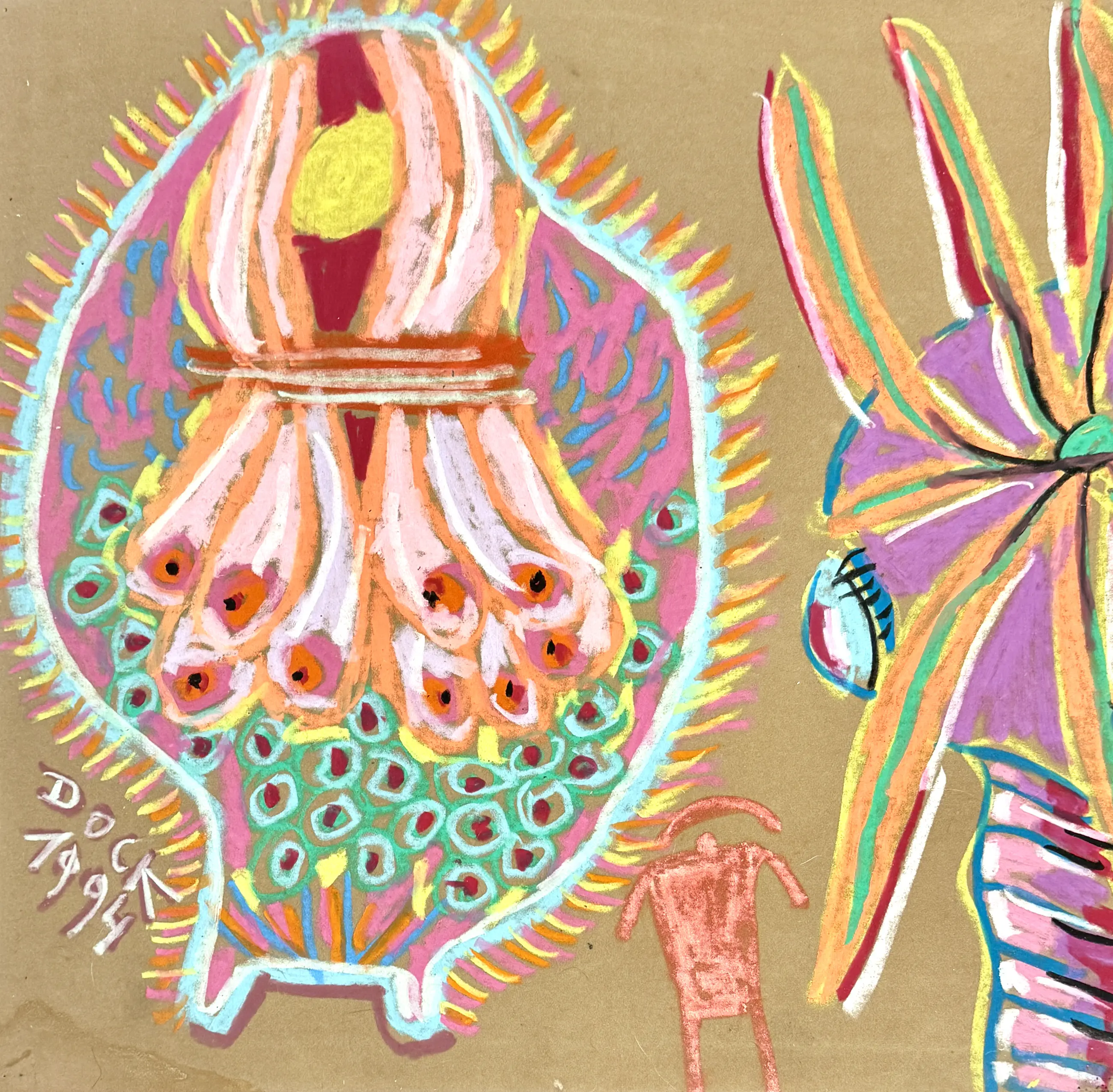 Het levendige en verzadigde palet – gedomineerd door roze, oranje en turquoise – straalt een vitale, zonnige energie uit. Door de kracht van zijn lijnen en de dichtheid van zijn kleuren roept Dock een universum op dat zowel primitief als spiritueel is, waar vuur symbool staat voor wedergeboorte.