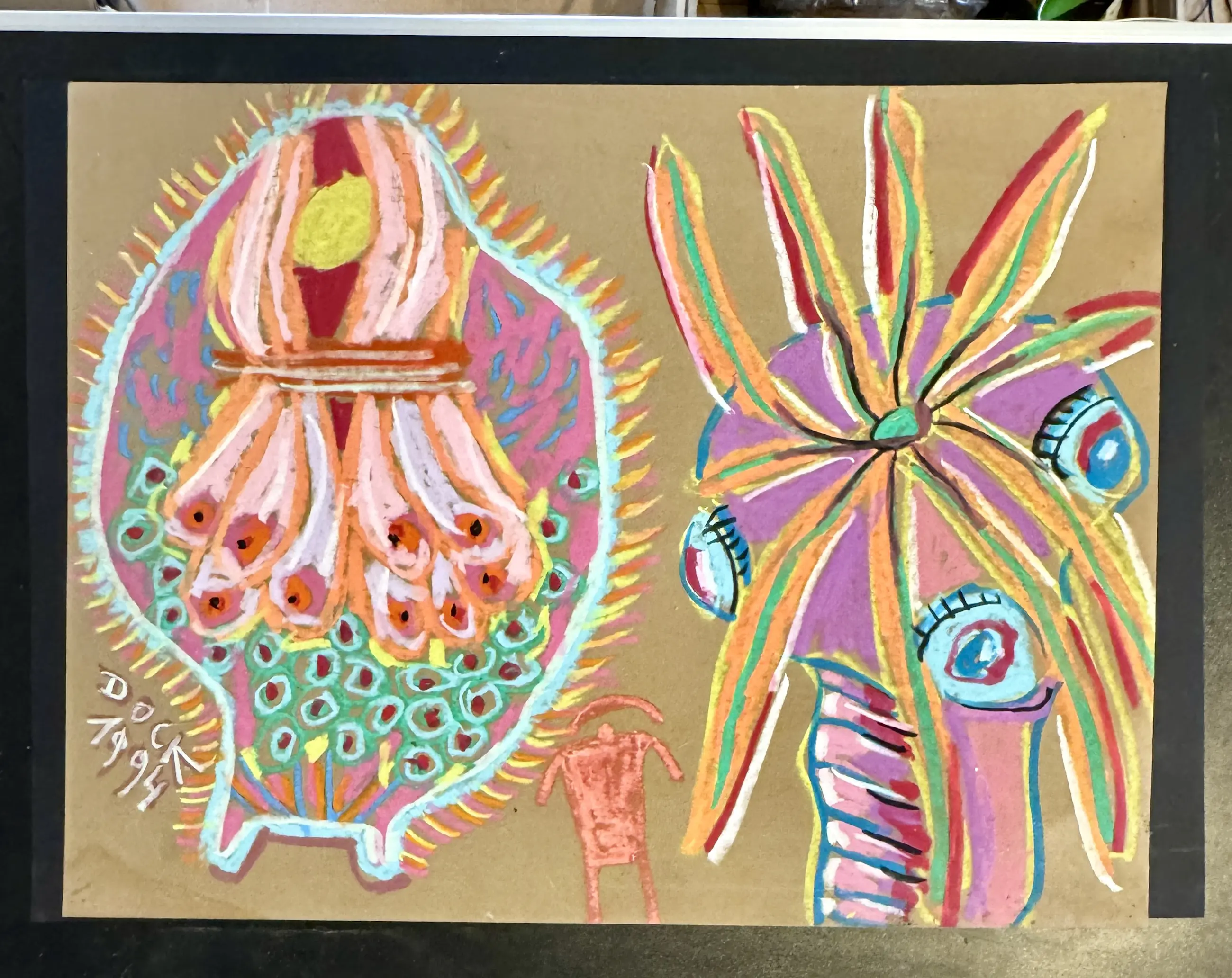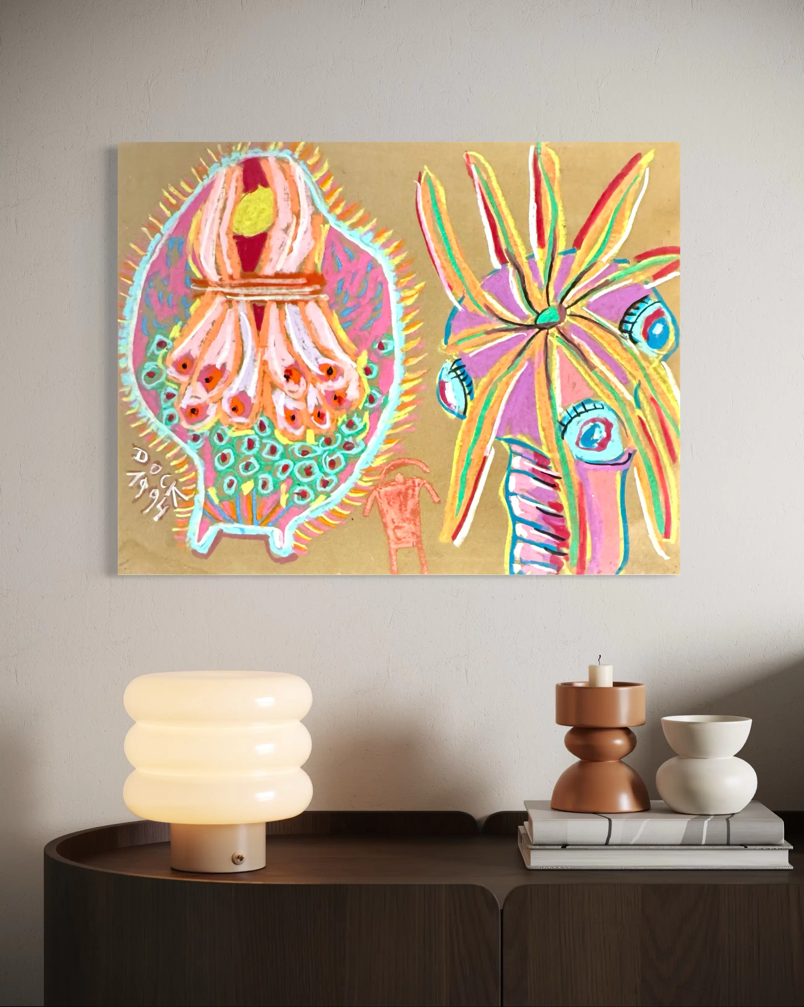 Origineel kunstwerk op papier van Marianne Dock, gedateerd 1994, getiteld The Watchers of the Fire. Deze flamboyante en rituele compositie zet de verkenning van mythe en metamorfose van de kunstenaar voort. Twee totemfiguren, tegenover elkaar staand, lijken met elkaar te praten in een gloeiende ruimte. De ene, omgeven door licht, roept een beschermende godheid op; de andere, met spiraalvormige vormen en meerdere ogen, belichaamt waakzaamheid en transformatie.