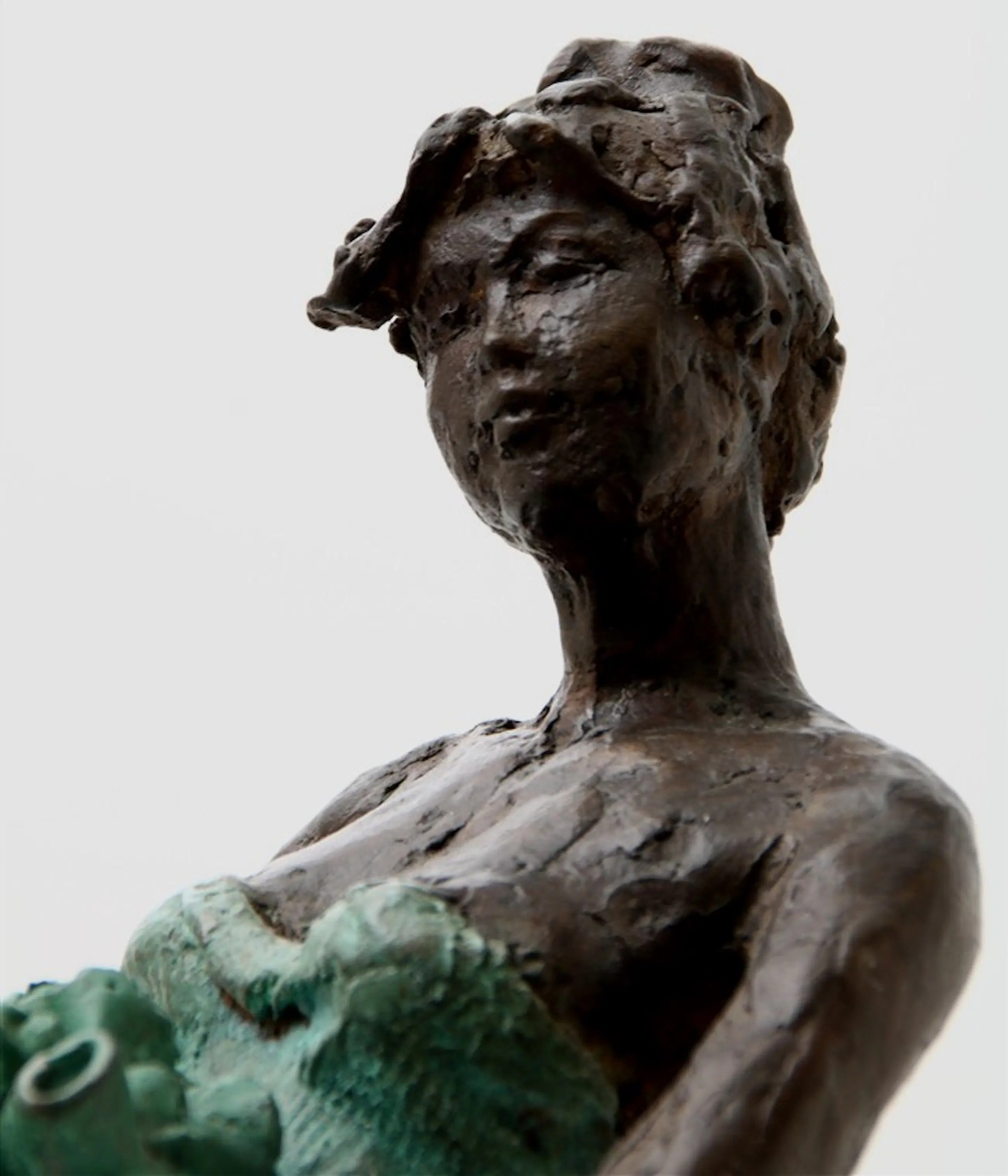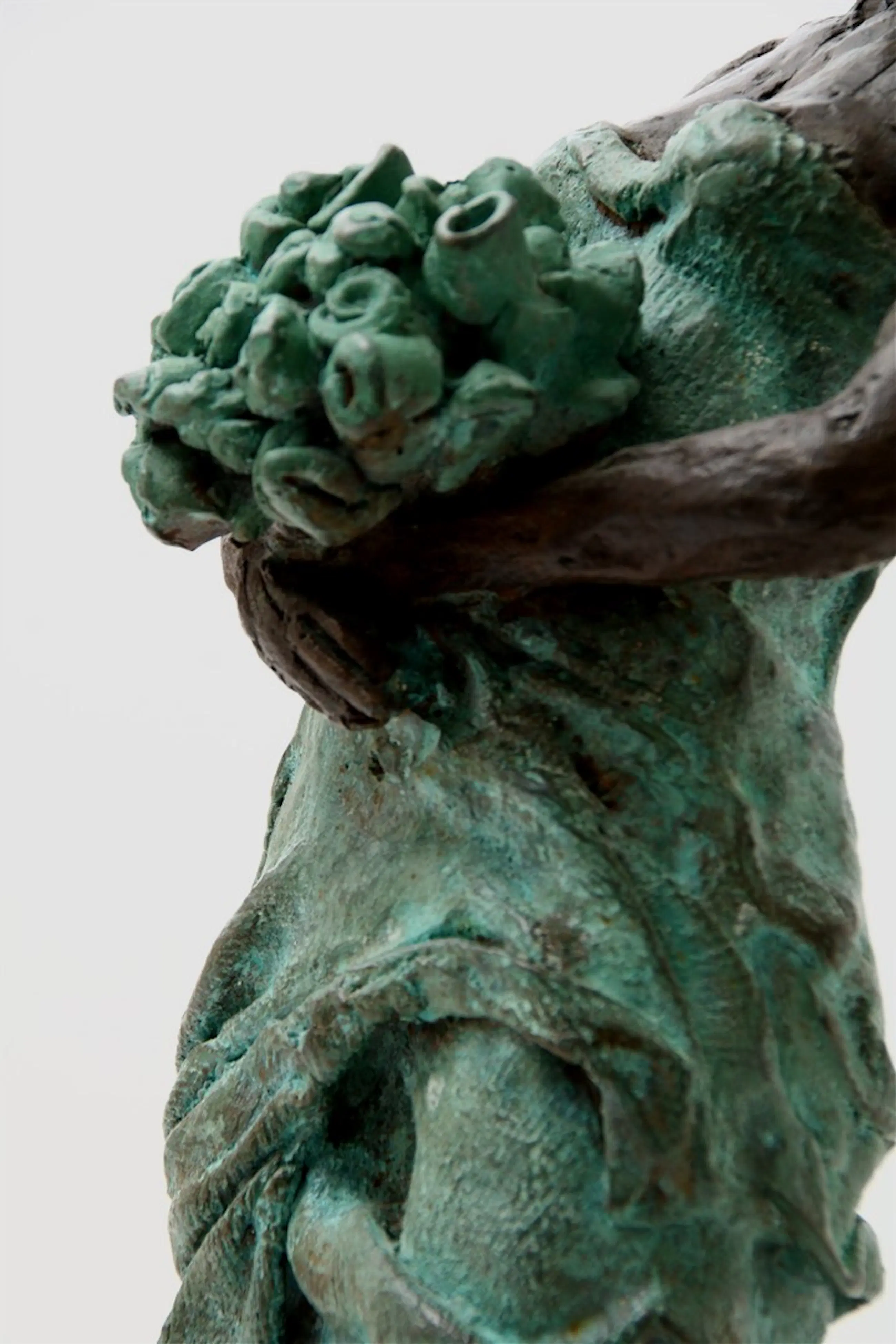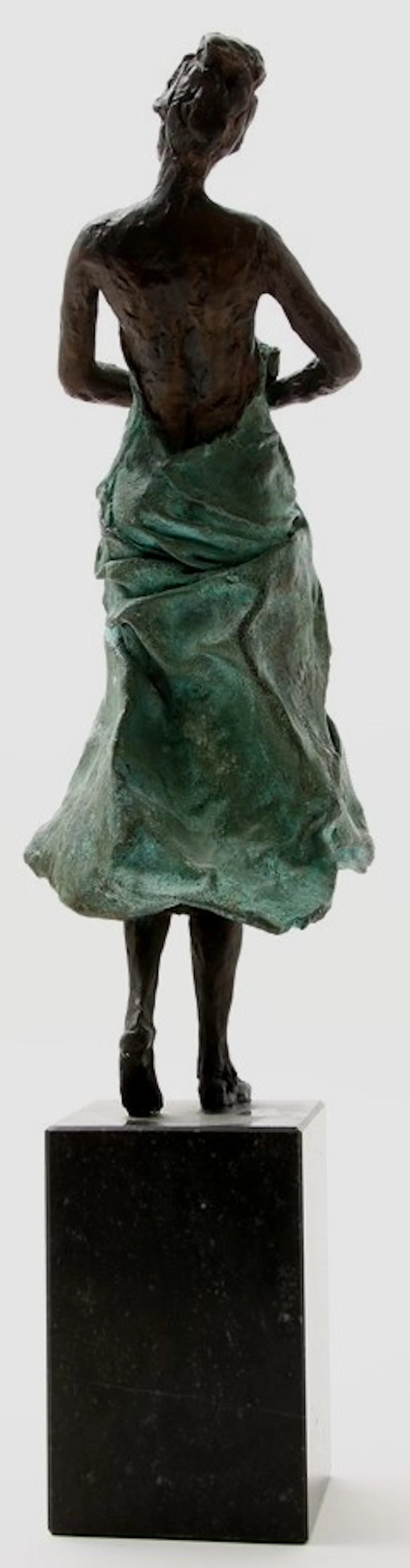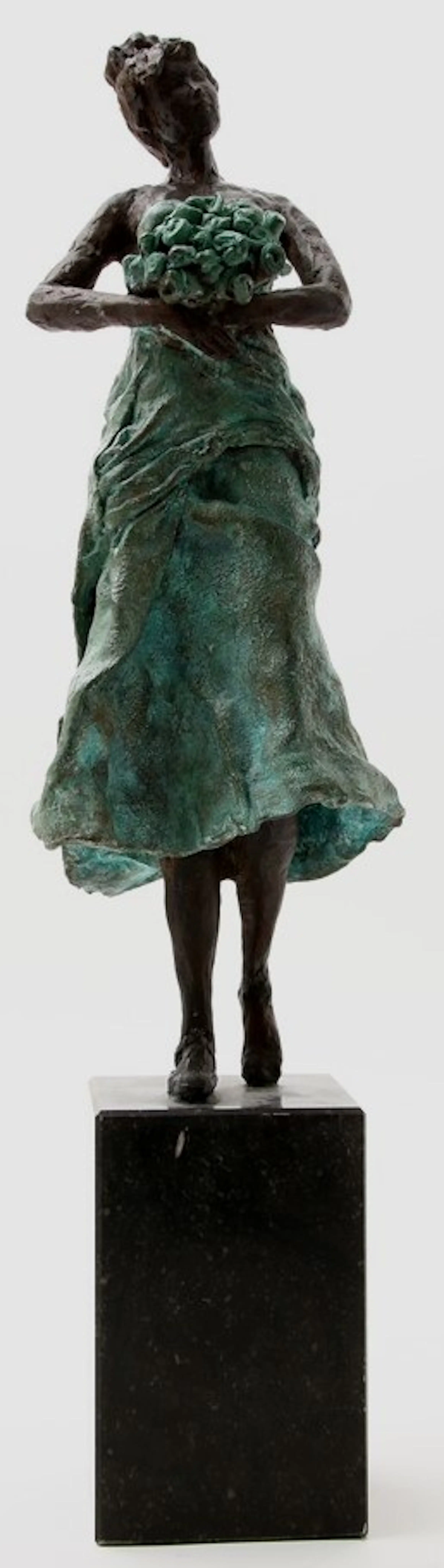 Bronzen sculptuur met groen platina, op marmeren basement, van Marianne Houtkamp (1948-). 'Dame met bloemen'. Hoogte 58cm. De authenticiteit van het aangeboden werk wordt volledig gegarandeerd. Een certificaat van echtheid kan, op aanvraag, worden gemaild.