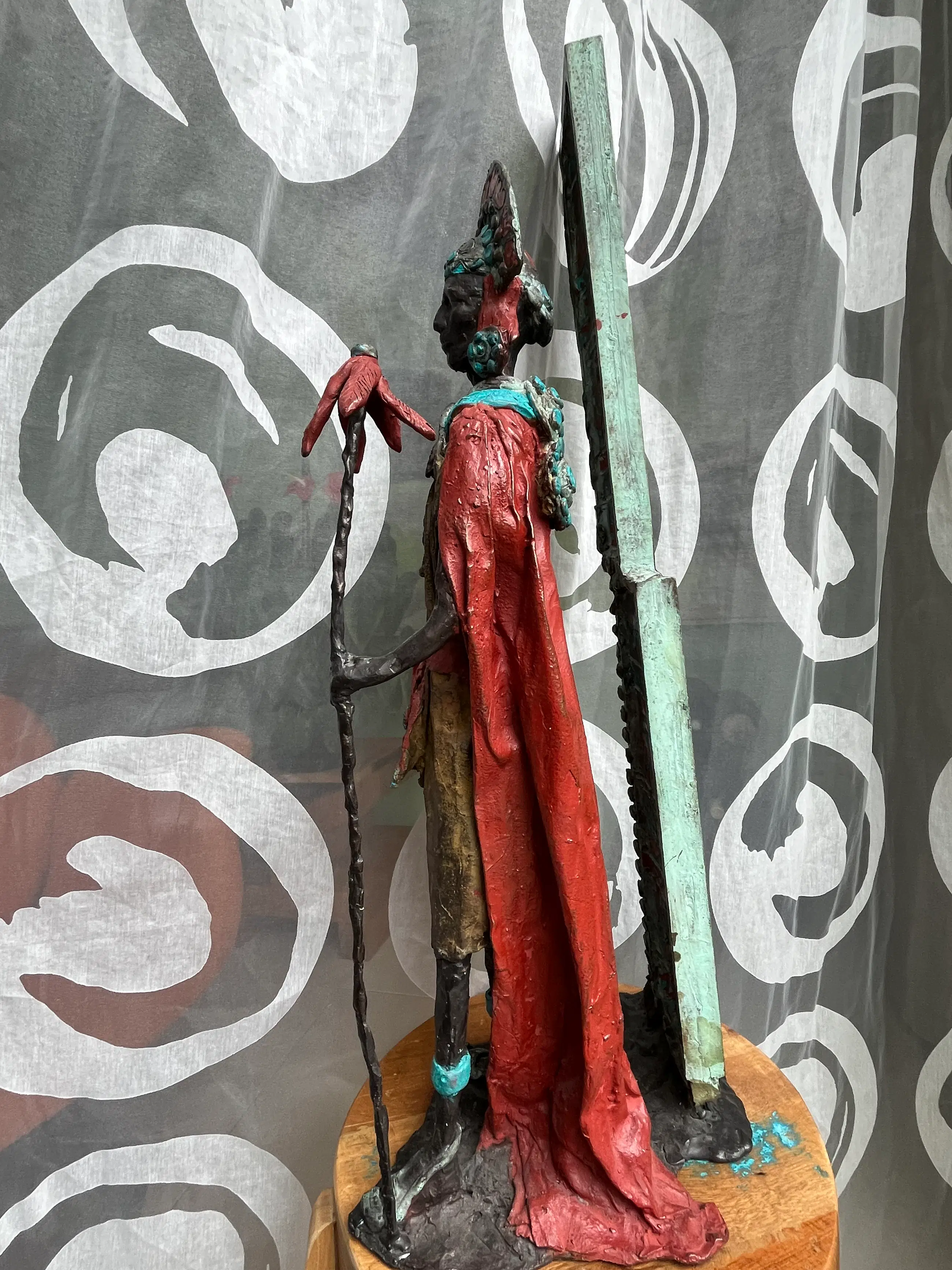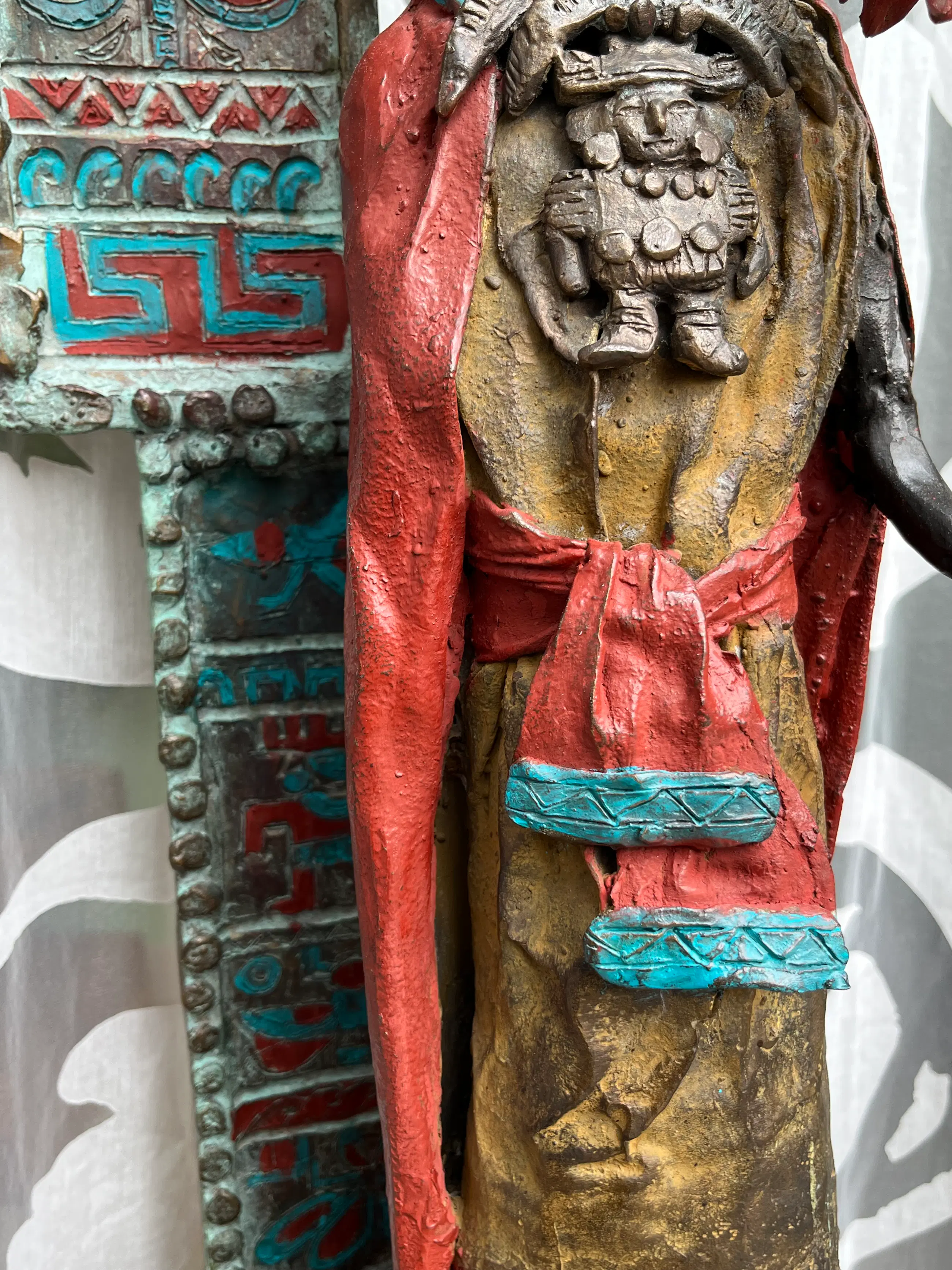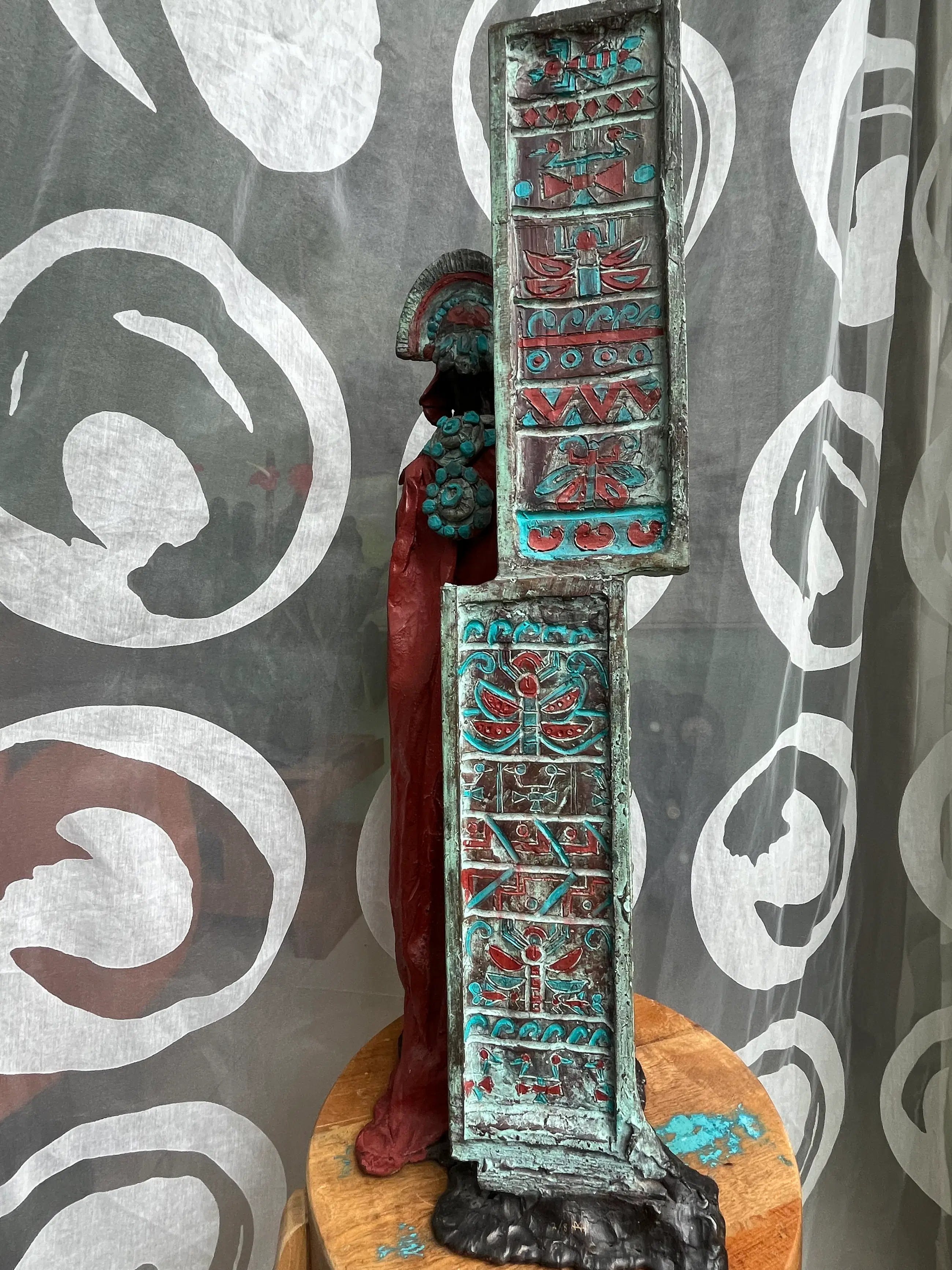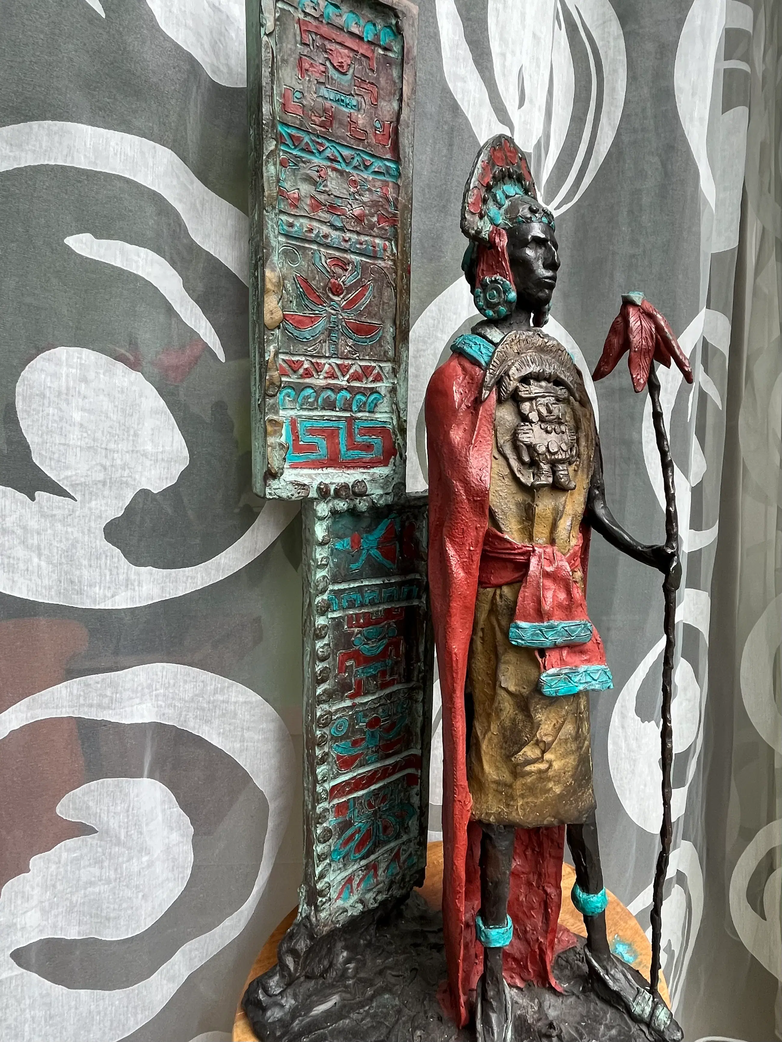 Fraai kleurrijk gepolychromeerd brons. Hoogte 67,5 cm. Breedte 24 cm. Diepte 24 cm. Gewicht 19,9 kg.