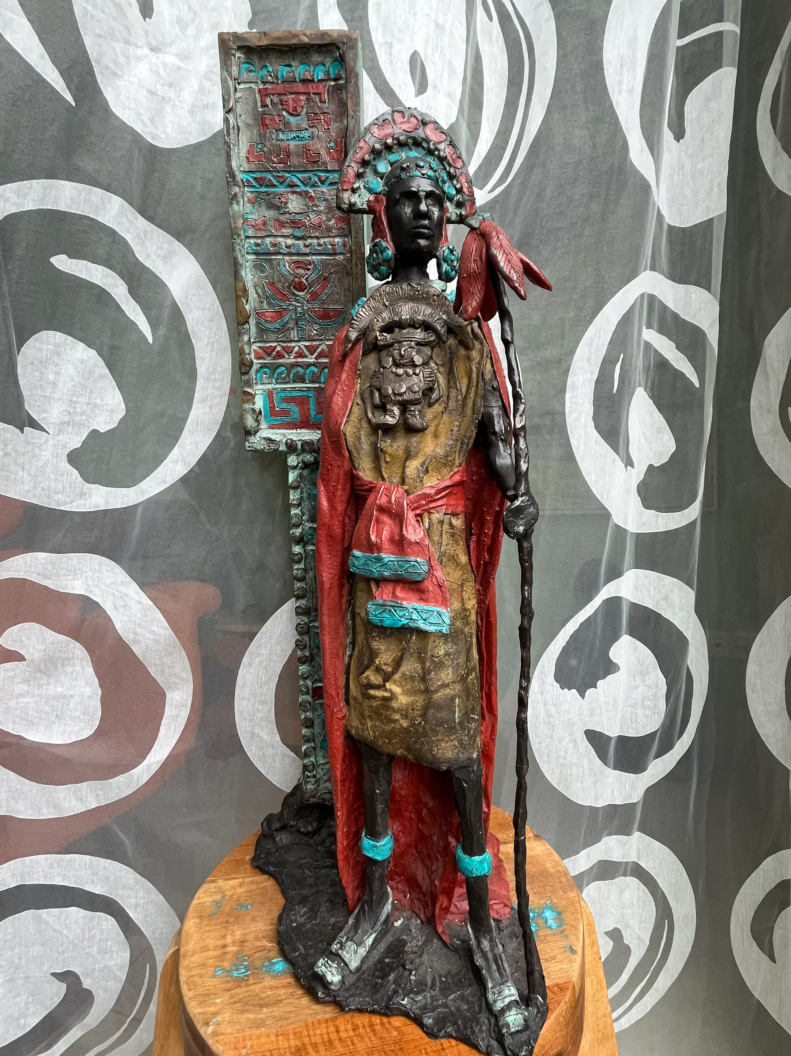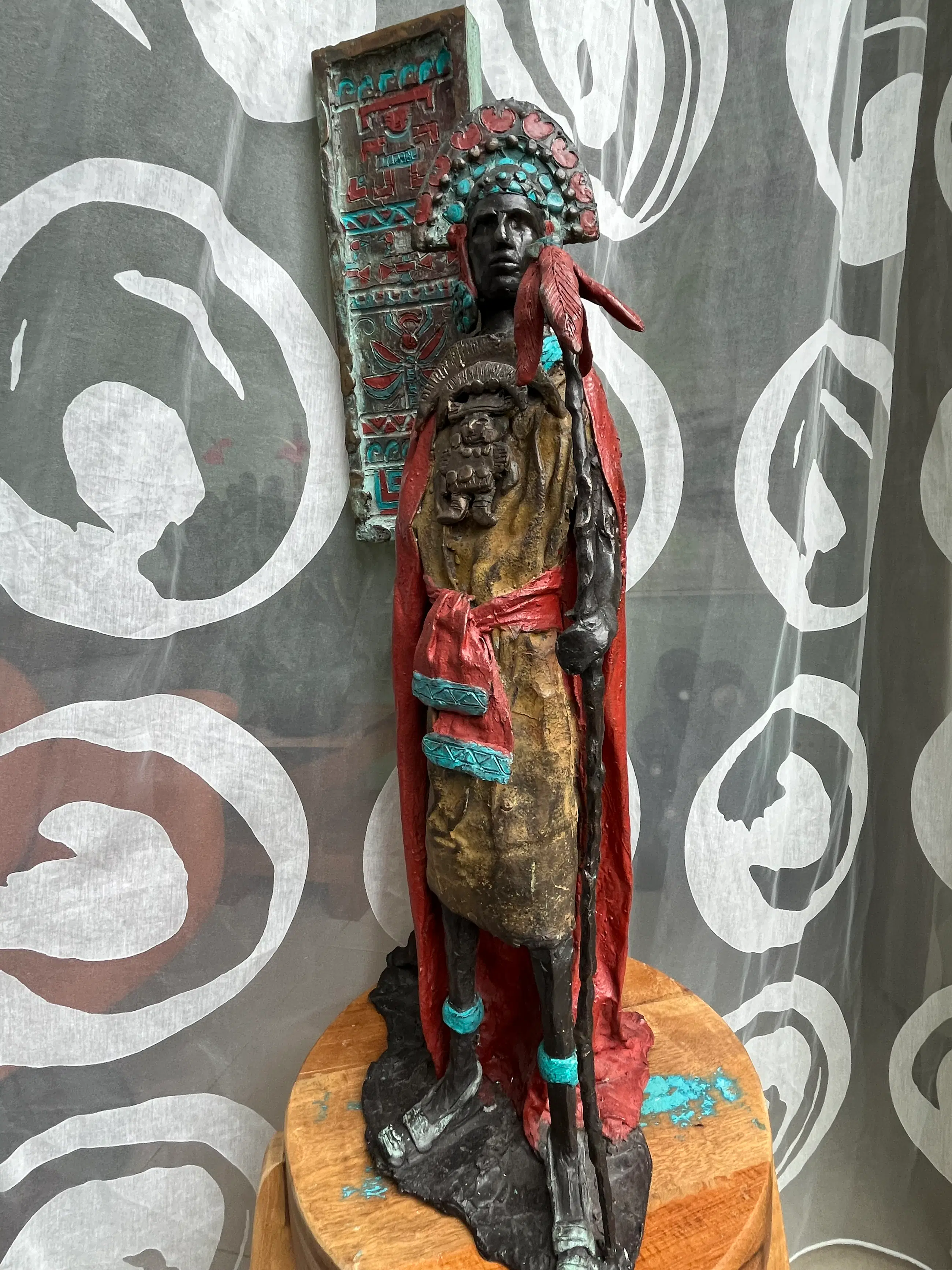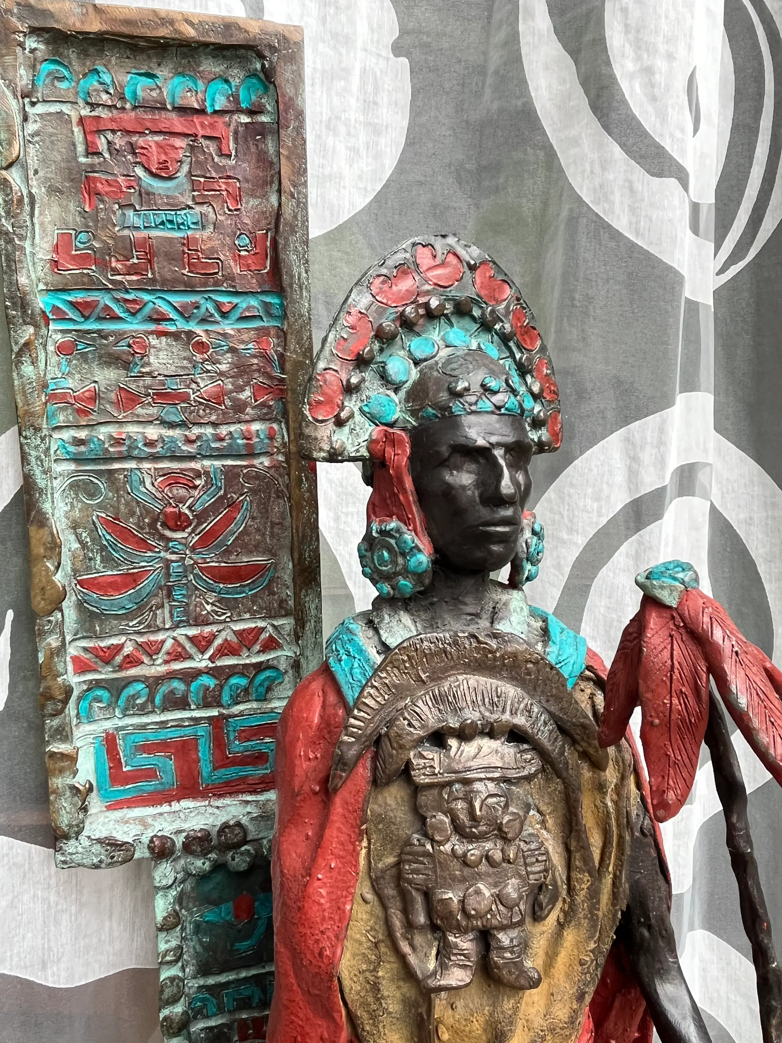 Fraai kleurrijk gepolychromeerd brons. Hoogte 67,5 cm. Breedte 24 cm. Diepte 24 cm. Gewicht 19,9 kg.
