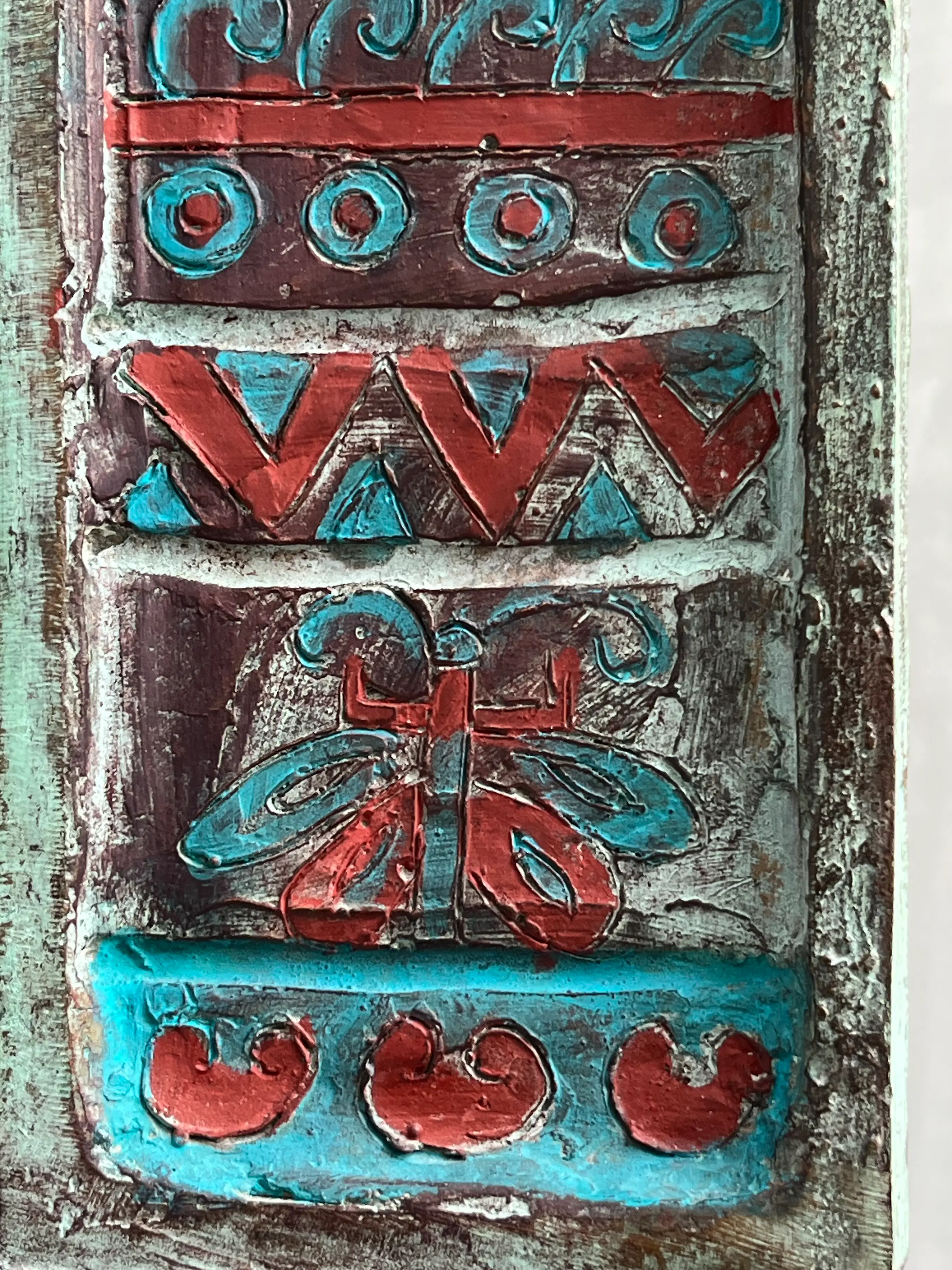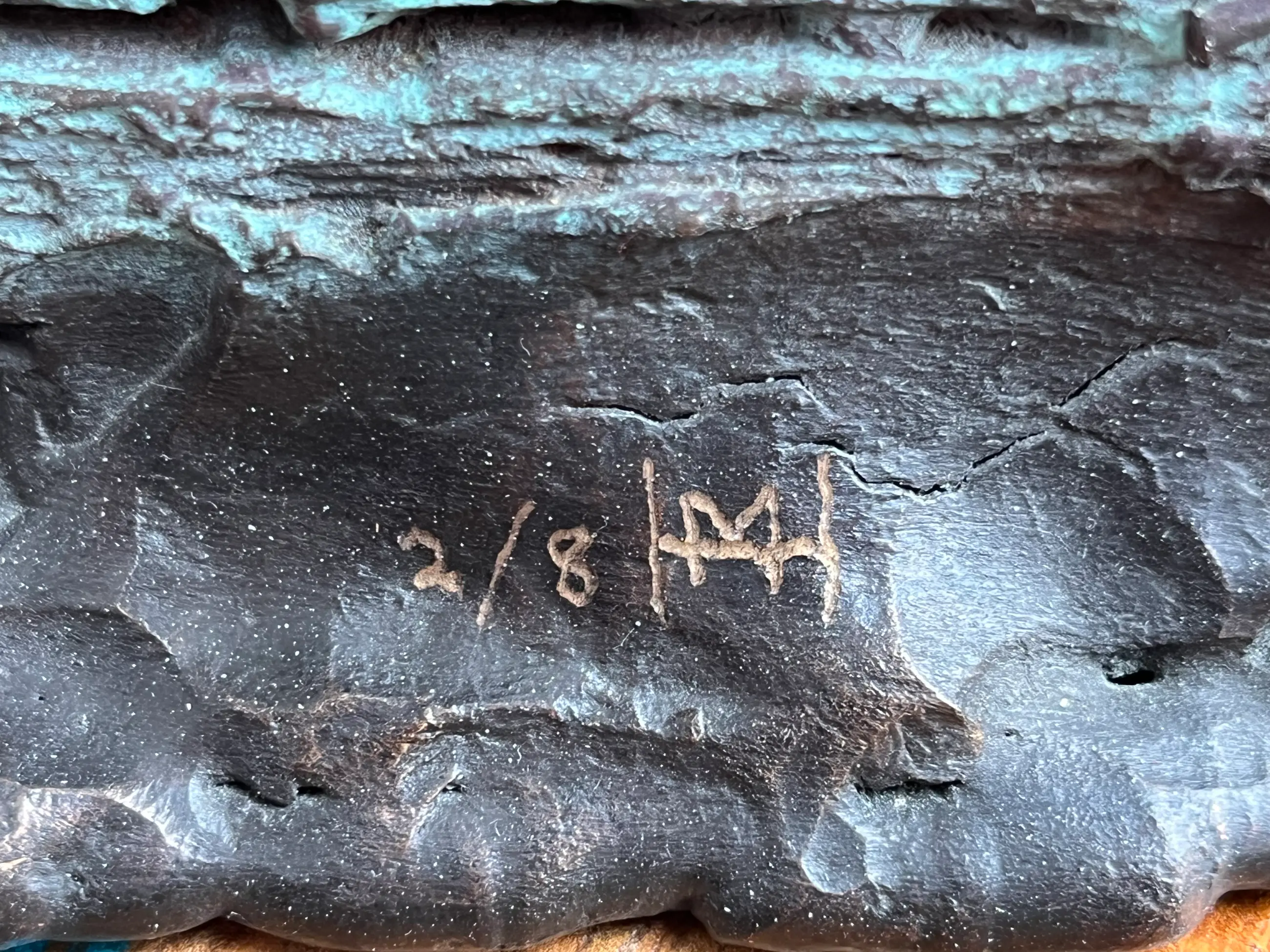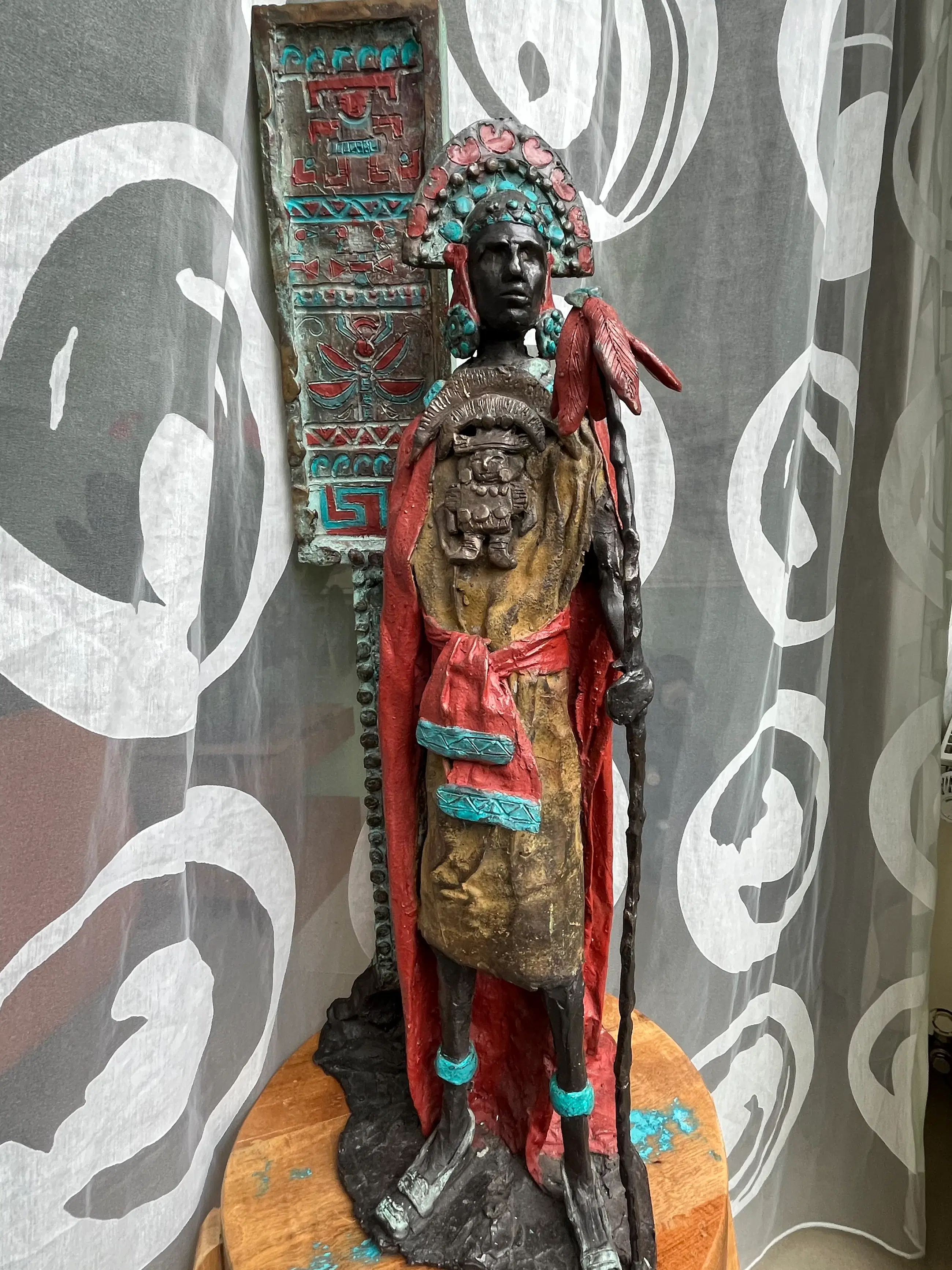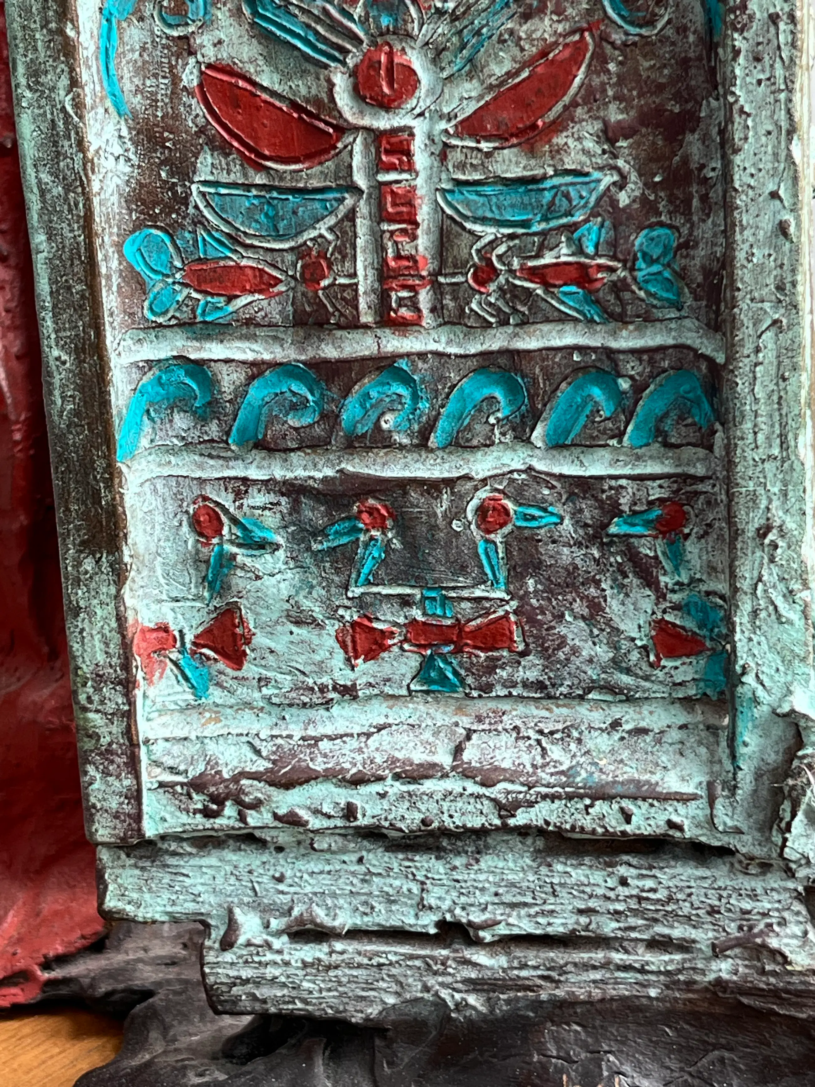 Fraai kleurrijk gepolychromeerd brons. Hoogte 67,5 cm. Breedte 24 cm. Diepte 24 cm. Gewicht 19,9 kg.