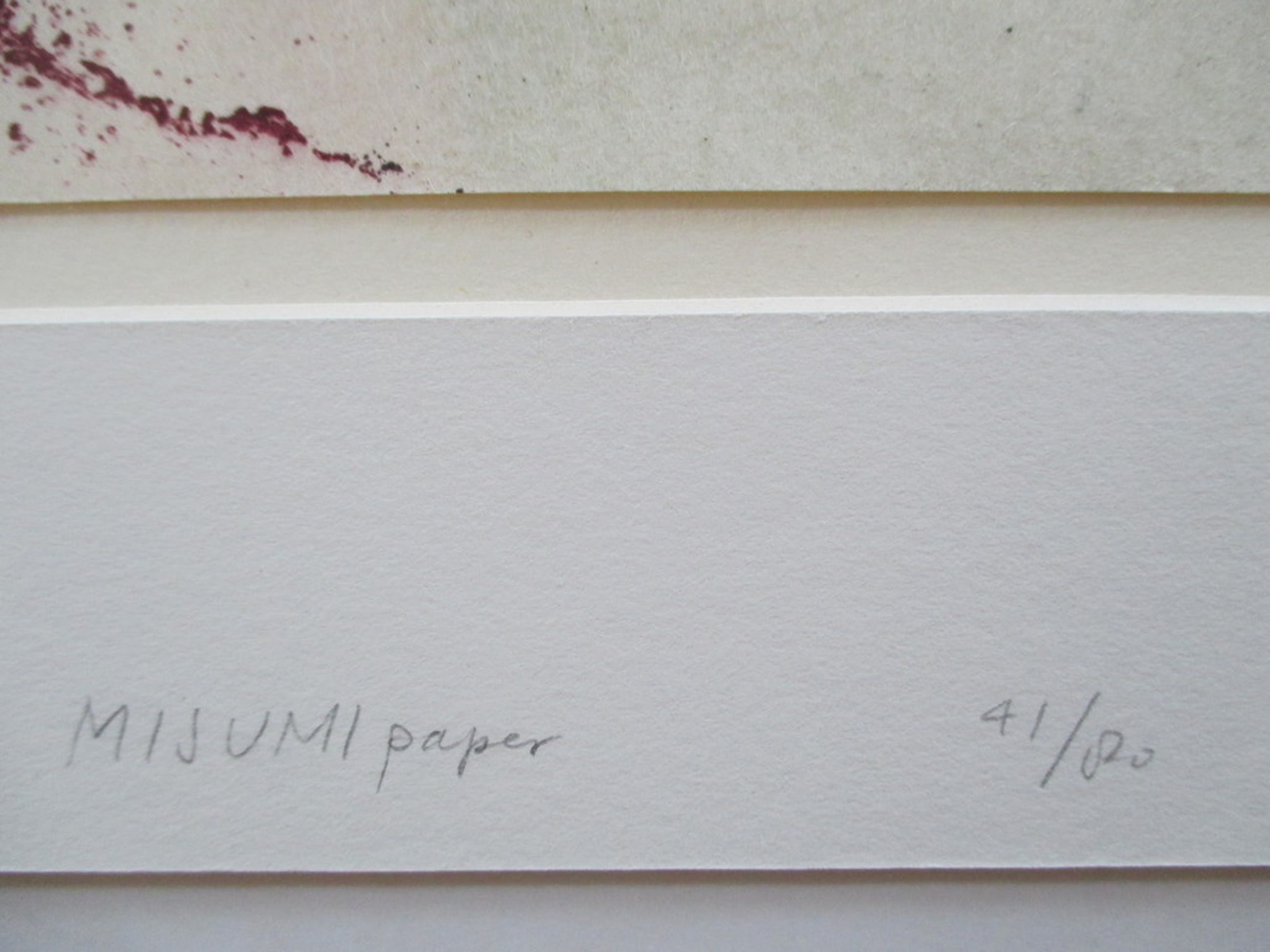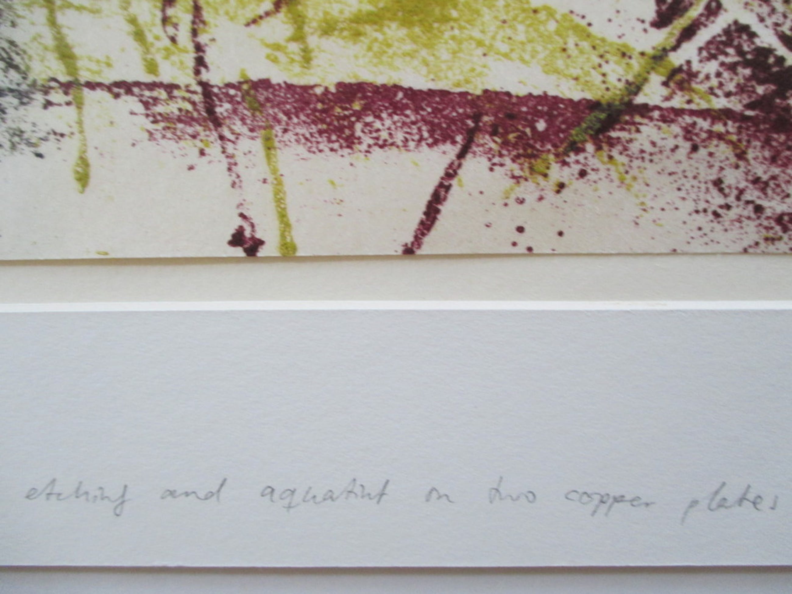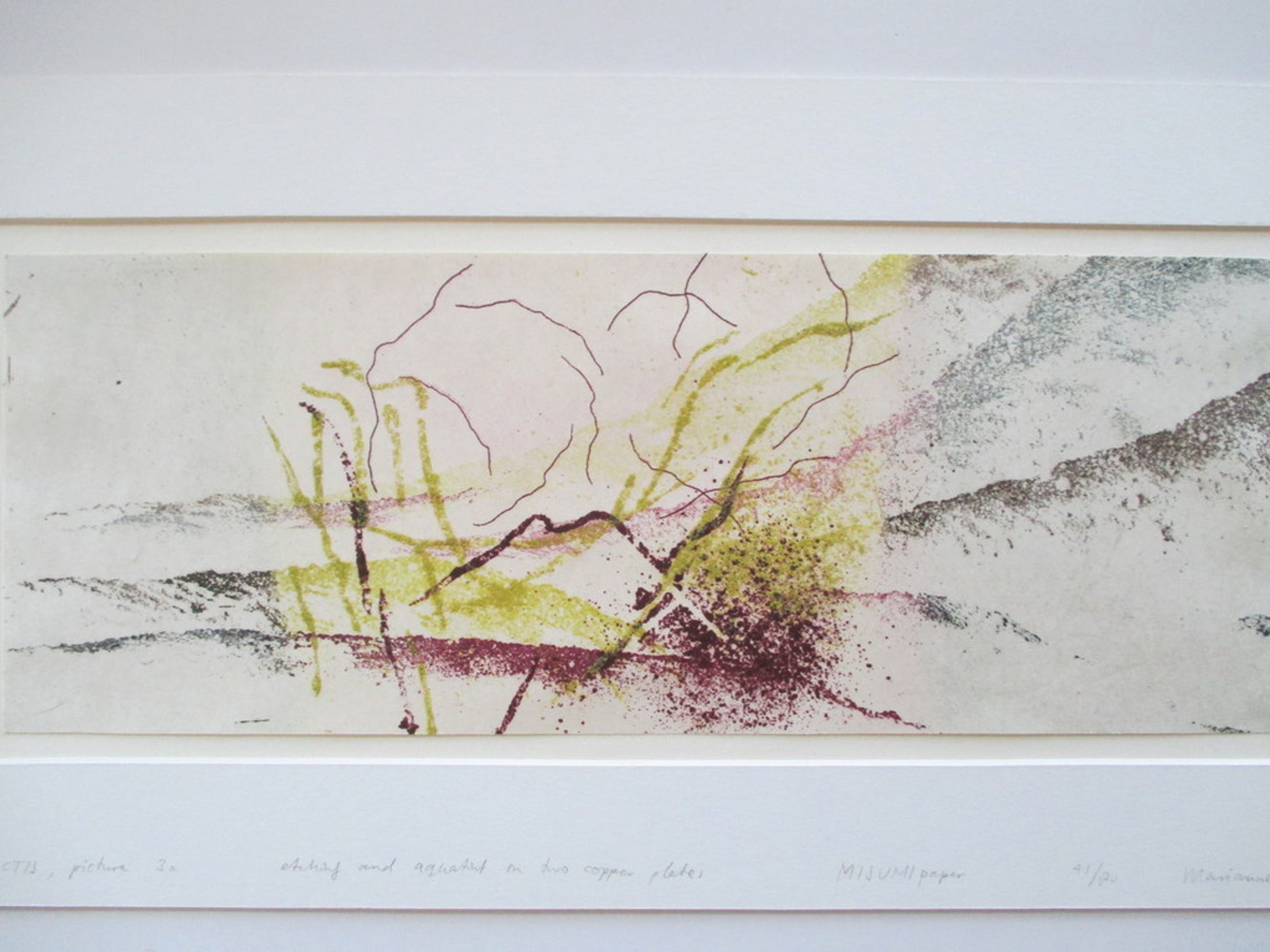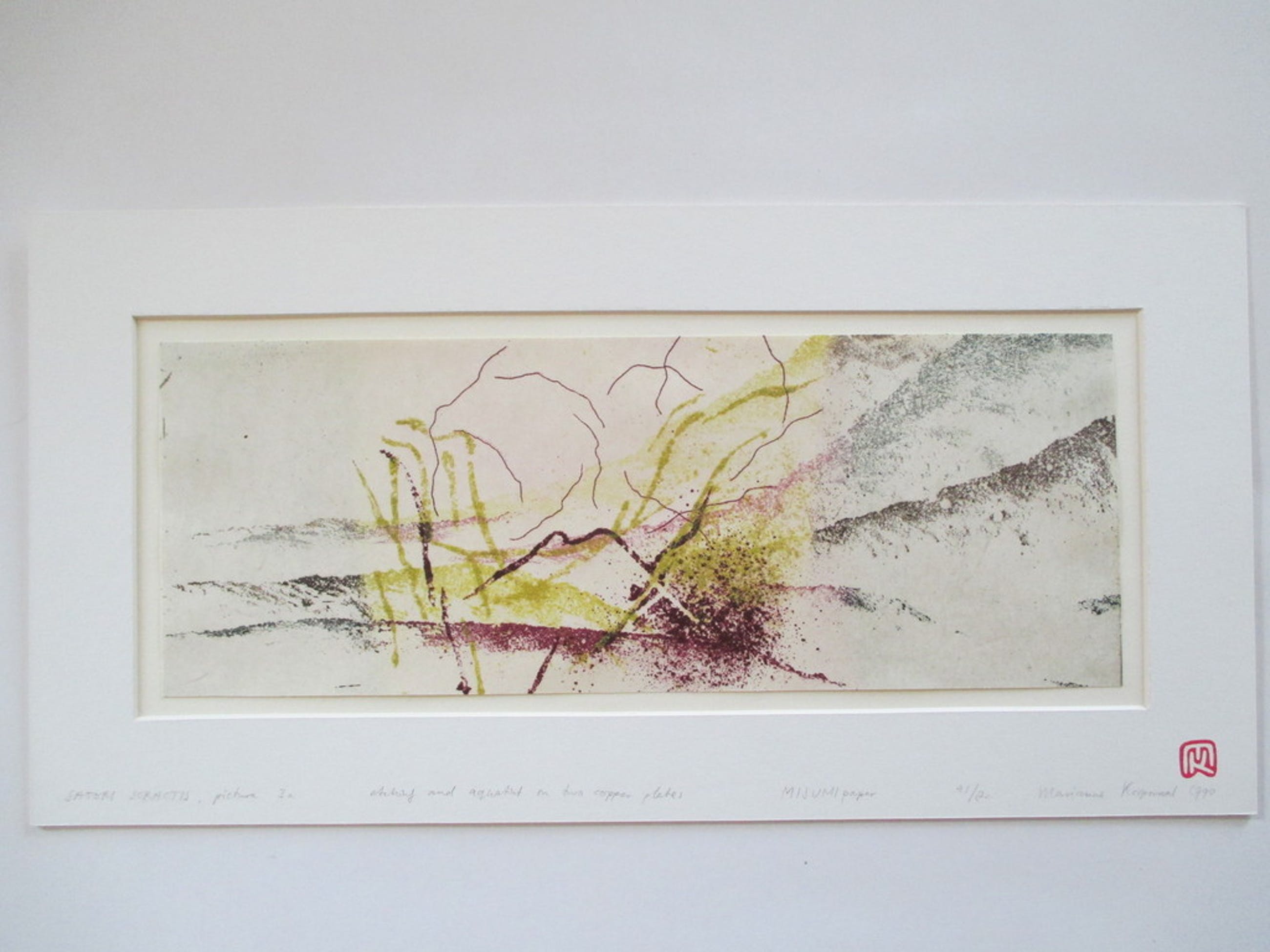 Ets van Marianne Korporaal getiteld "Satori Soractis, pictura 3a", etching and aquatint on two copper plates, op Misumi papier, genummerd 41/80, r.o gesigneerd op passepartout. Het blad is door de kunstenaar geplakt op een ander wit blad, hetgeen achter passepartout is geplaatst (met stempel kunstenaar). Het geheel is in perfecte staat. Afm. passepartout 50x25 cm, blad 39x14,5 cm.