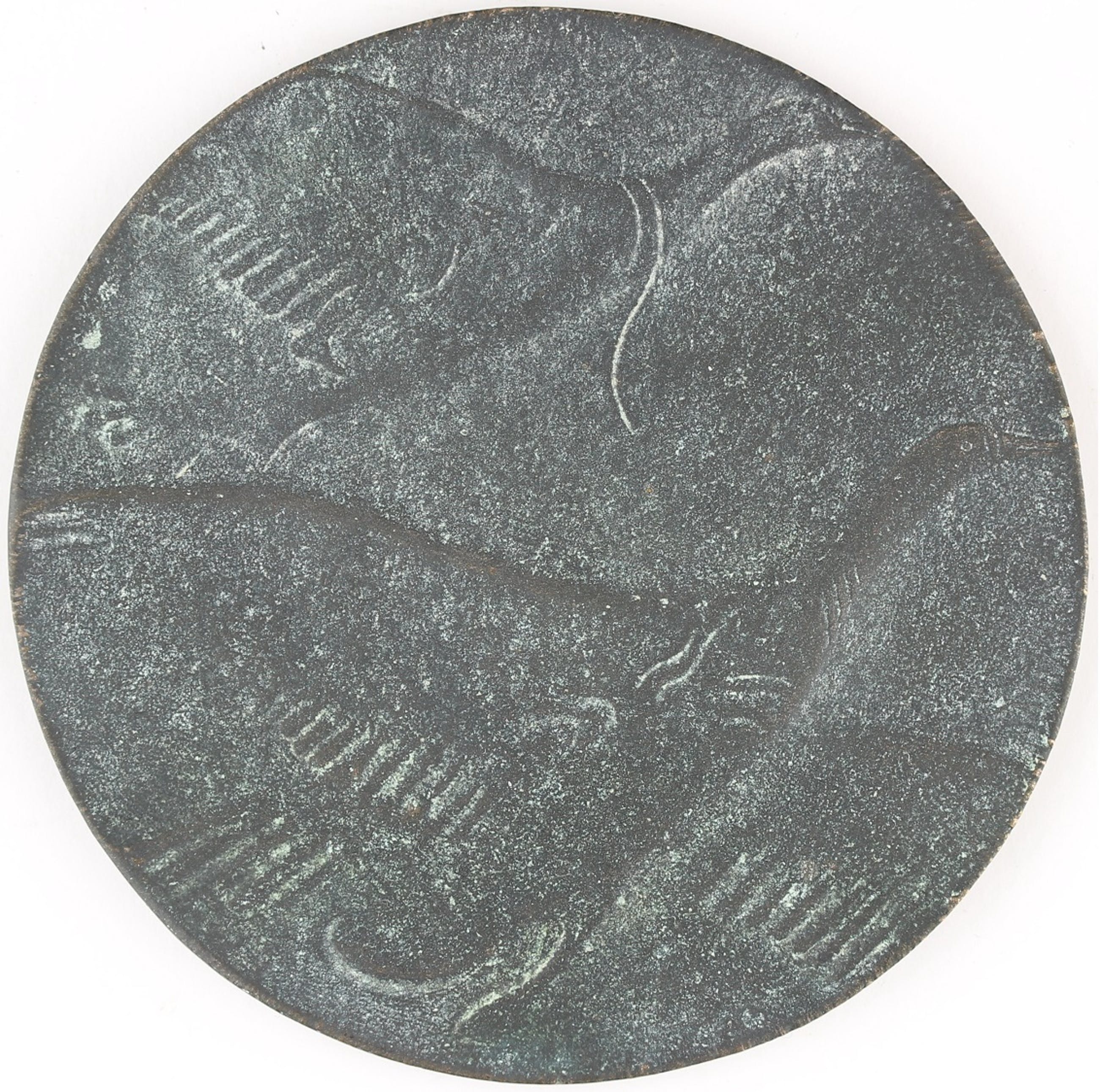 In jaren had een Verenigingspenning niet zo'n prachtig vlak als de Ganzevlucht van Letterie. Een minimum aan verhoging, een zeer licht, korrelig oppervlak waar op de ene zijde een vliegende gans opdoemt, op de andere zijde twee met de vleugel van een derde. De lijnen vloeien ritmisch en krachtig; aan de onderrand van de vleugels zijn met parallelle incisies de veren en staart weergegeven. Het net niet gladde oppervlak geeft een suggestie van mist en wolken: herfsttij als de vogels gaan trekken naar warmer streken. Op de zijde van de ene vogel - en de titel - is een Jugendstilachtige lijn ingebracht met een elegante krul om het penningrond niet te star te maken en een visueel ant-woord te geven op de gebogen plaatsing van de letters. Het ontwerp bezit zo'n prachtige verstilling dat de literaire verwijzing naar Niels Holgersson, de jongen uit het boek van Selma Lagerlof, niet opvalt. Hij is tot kabouterformaat omgetoverd, vliegt mee op de rug van de ganzerik en beleeft zo zijn avonturen in heel Zweden. Zijn voetje steekt onder de vleugel van de bovenste gans uit. #Louk Tilanus, Handzame Sculptuur