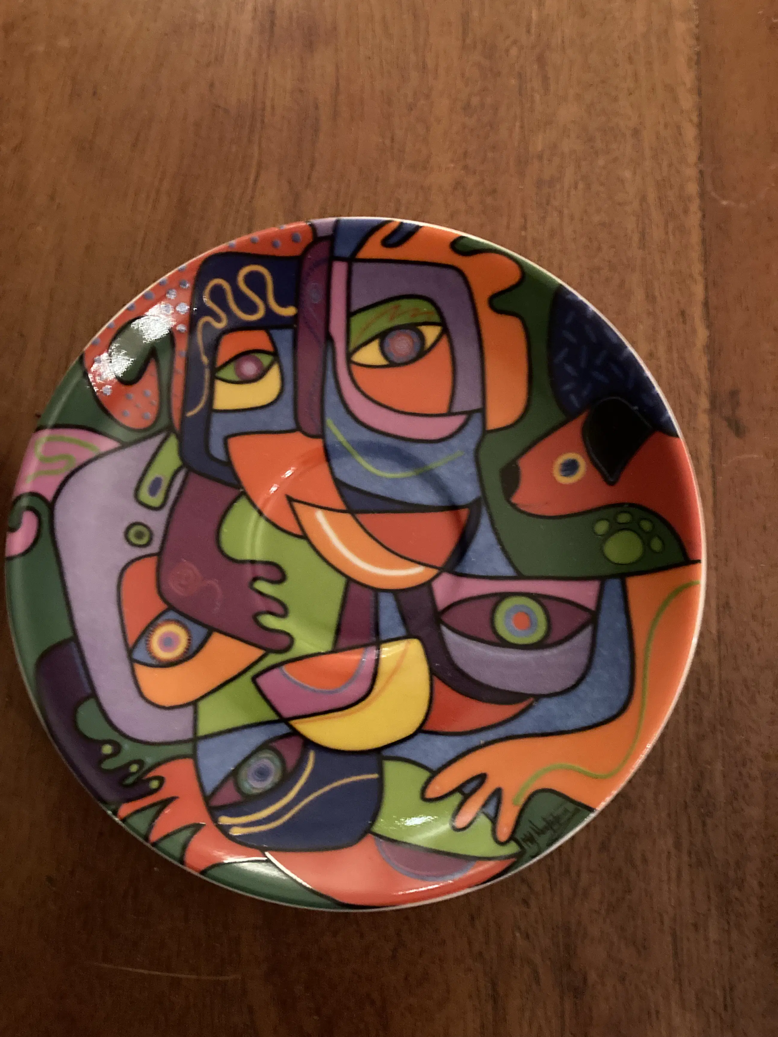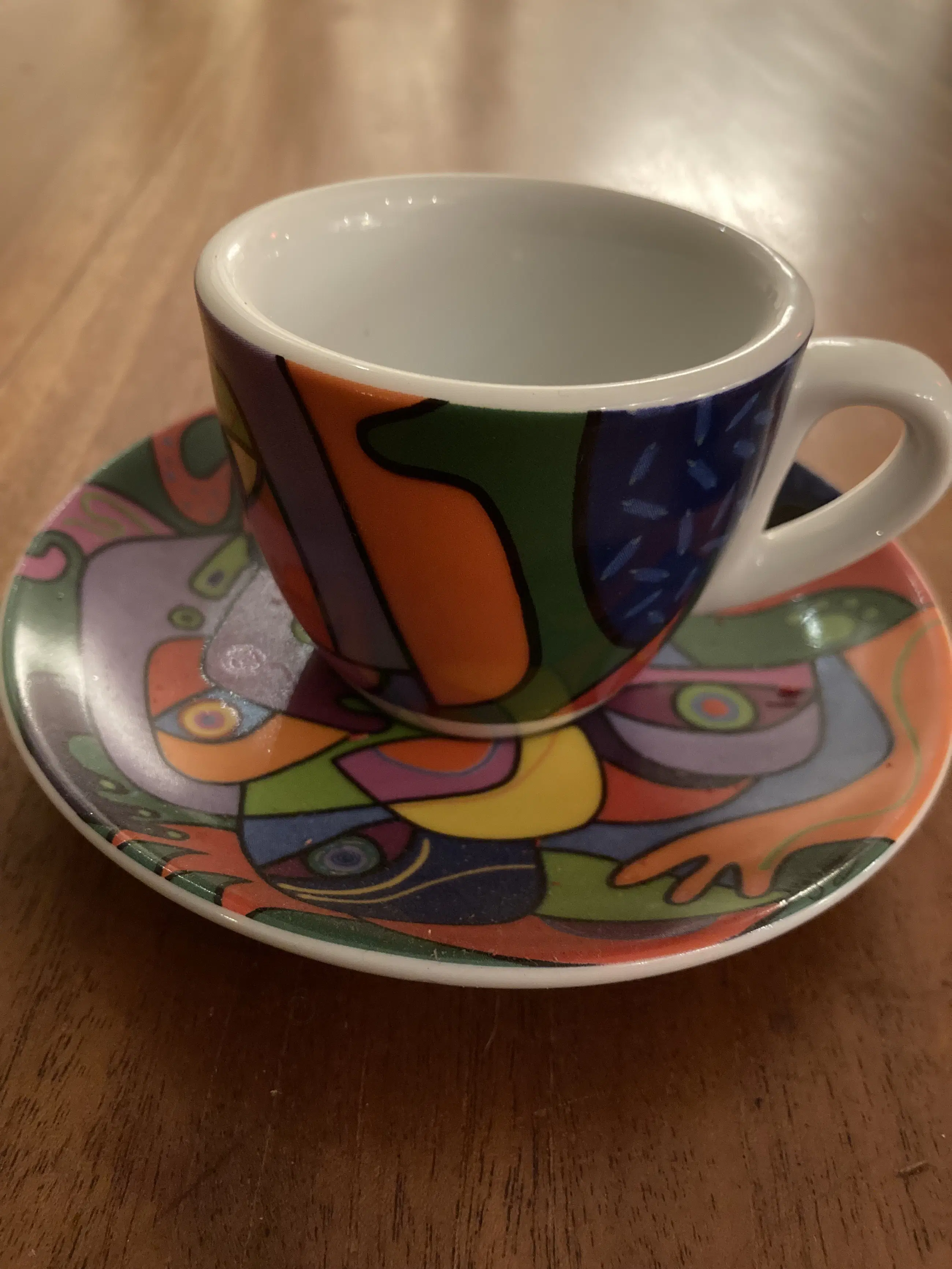 2 mokkakopjes 5cm hoog , op onderkant 'Taste of Art' 2 schoteltjes 12cm doorsnee, op onderkant 'Perfect Match' by Marianne Y.Naerebout