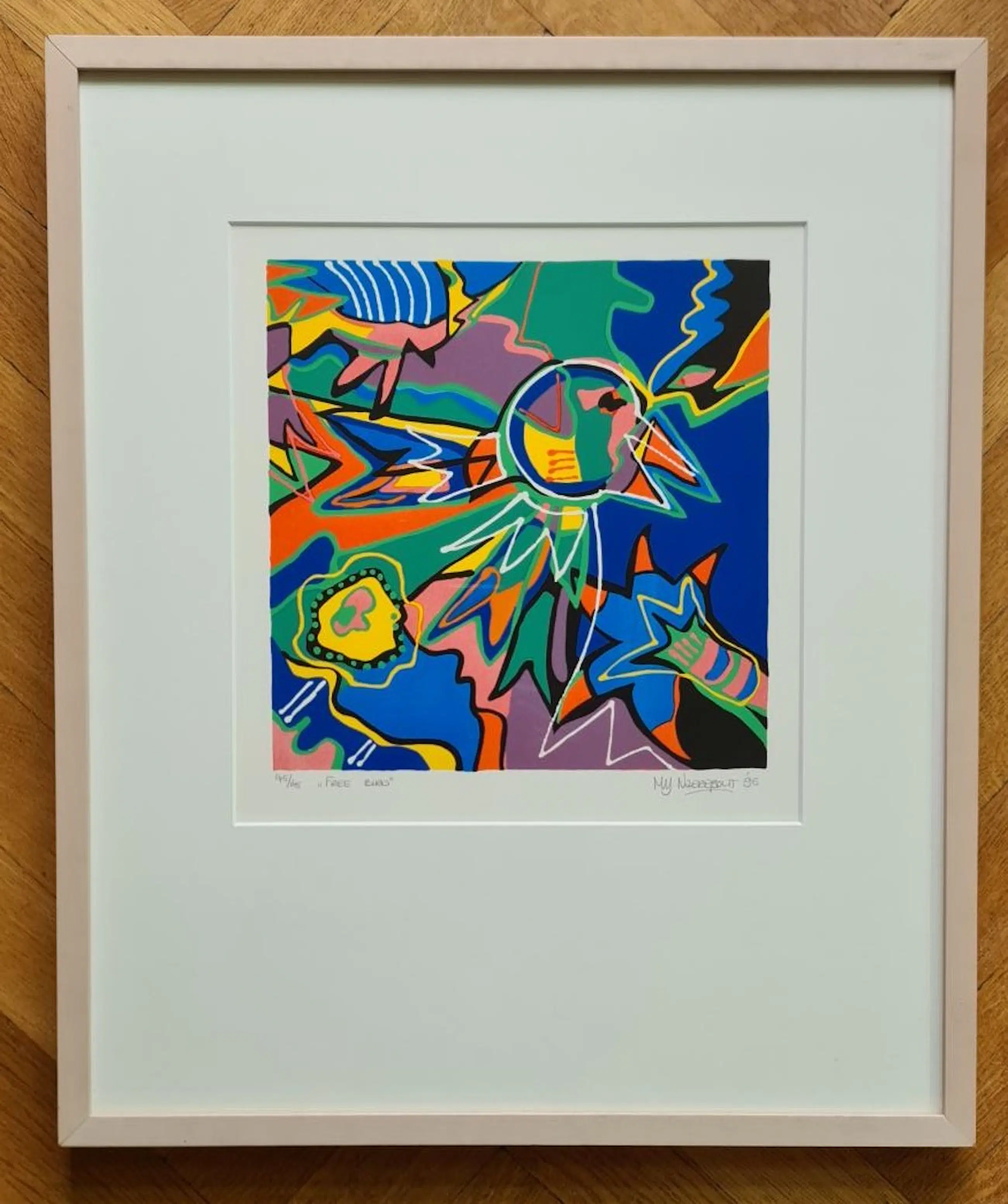 Zeefdruk in houten lijst. Aankoopprijs destijds euro 410,00.