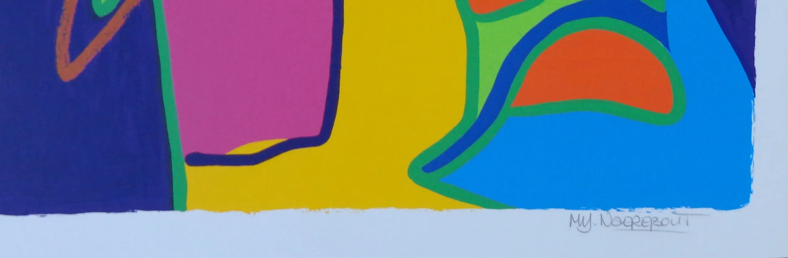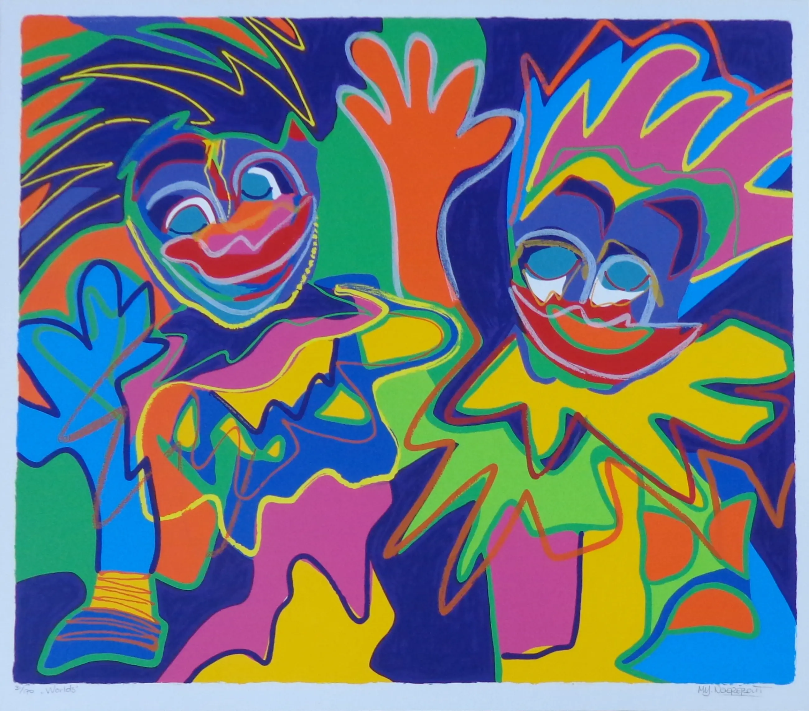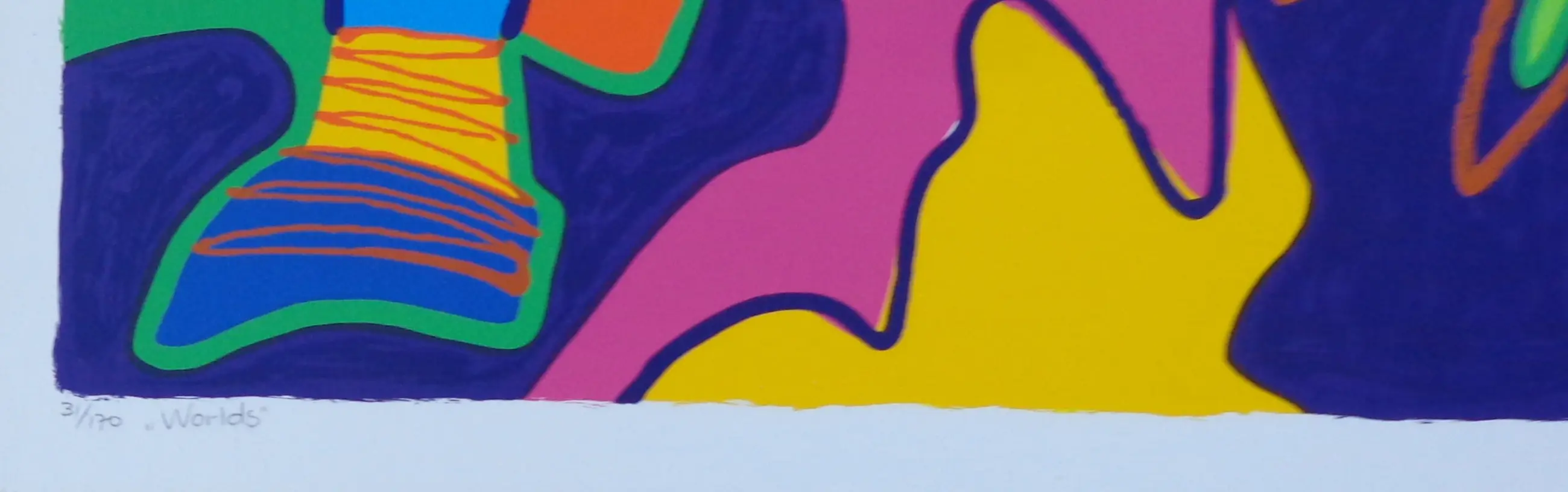 Marianne Naerebout (°1958). Titel: "Worlds". Kleurzeefdruk op papier. Gesigneerd met potlood. Ex.nr. 31/170. Gemonteerd op karton. Karton: 69x78cm. Proper blad. Vlakke verzending.