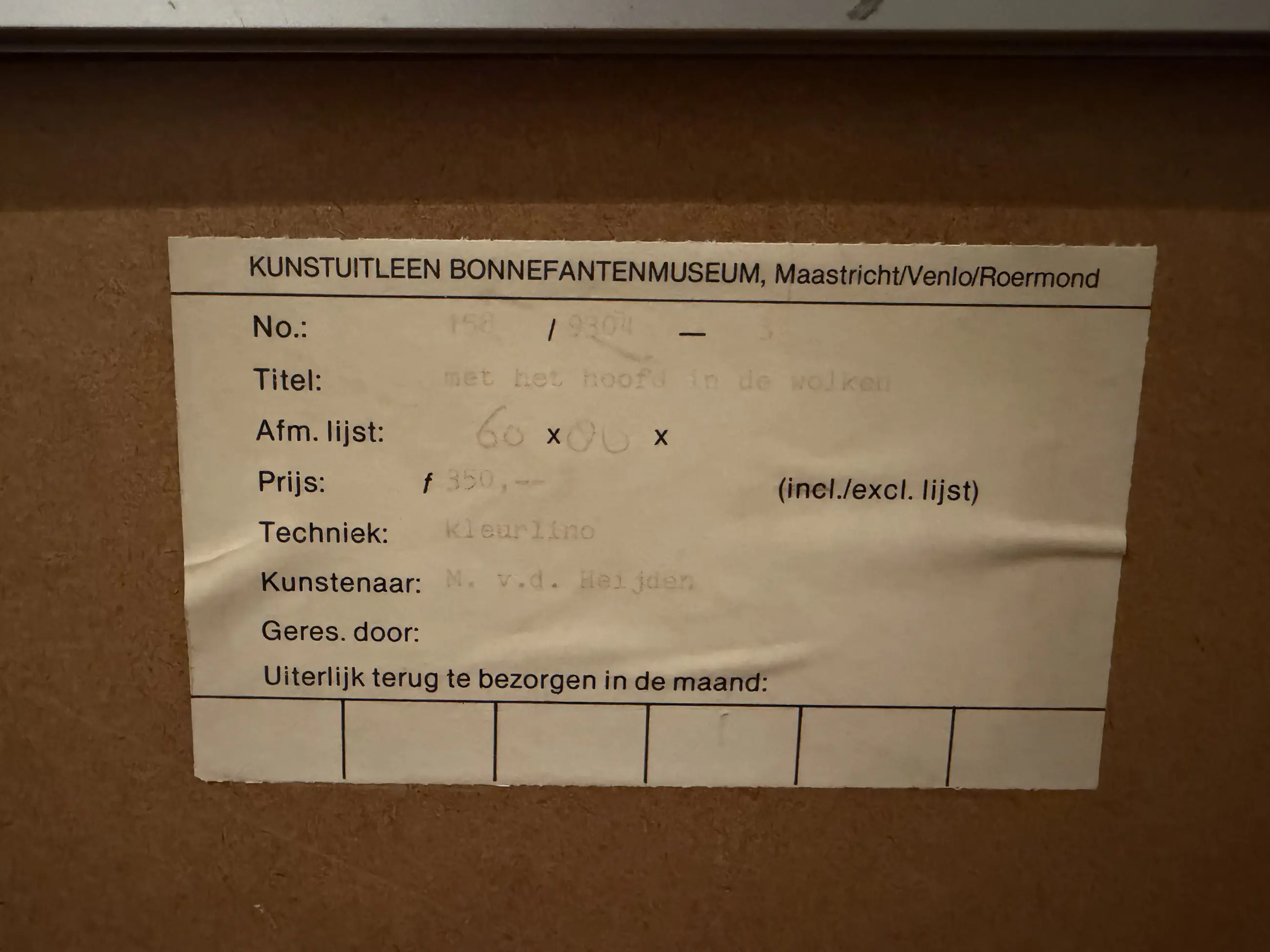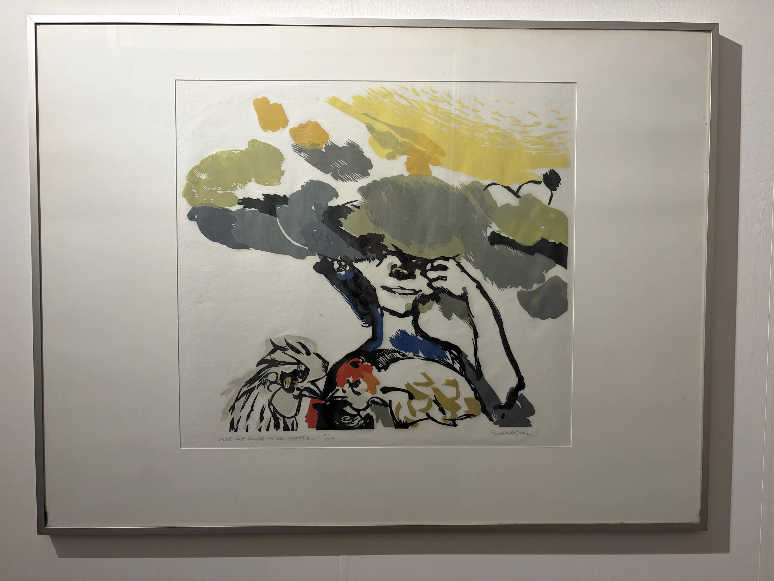 Titel: Met het hoofd in de wolken Techniek: Kleurlinoleumsnede (hoogdruk) Oplage: 5/14 Gesigneerd door de kunstenaar Beeldformaat: 60 × 80 cm Totale lijstmaat: ca. 92 × 118 cm