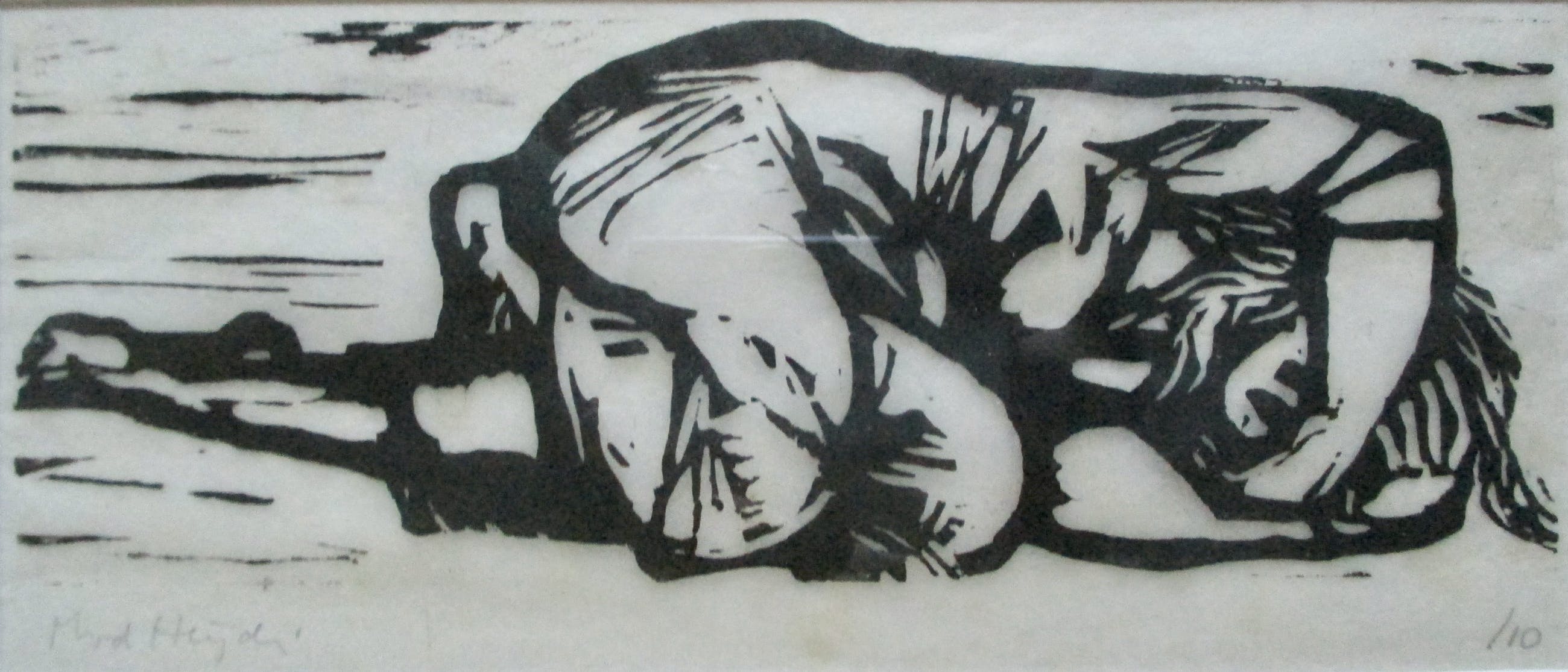 Houtsnede op dun papier van Marianne van der Heijden, gesigneerd in potlood. R.o staat /10 ; dit komt uit een oplage van 10? Ingelijst in metalen lijst achter glas.
