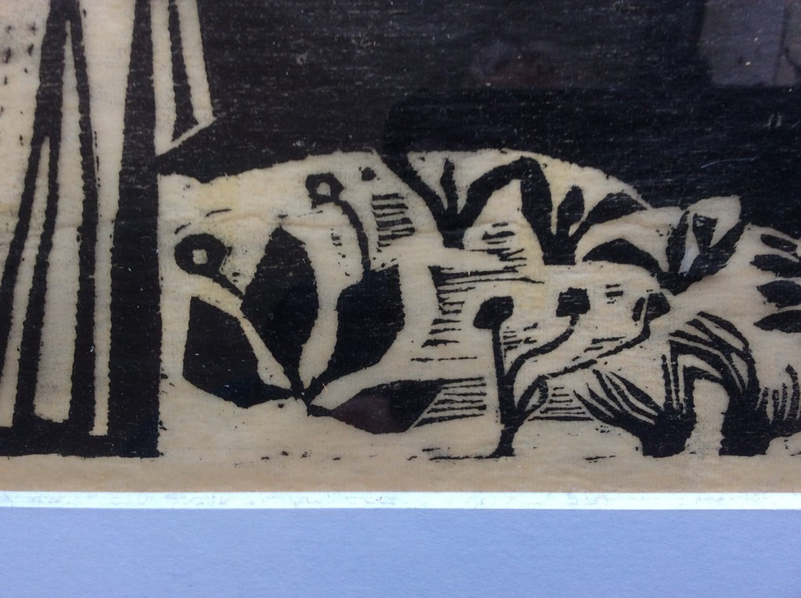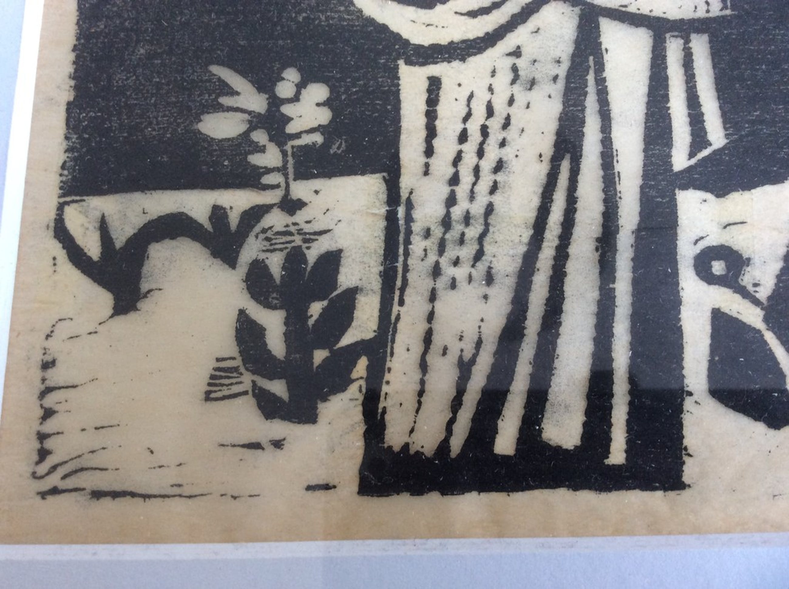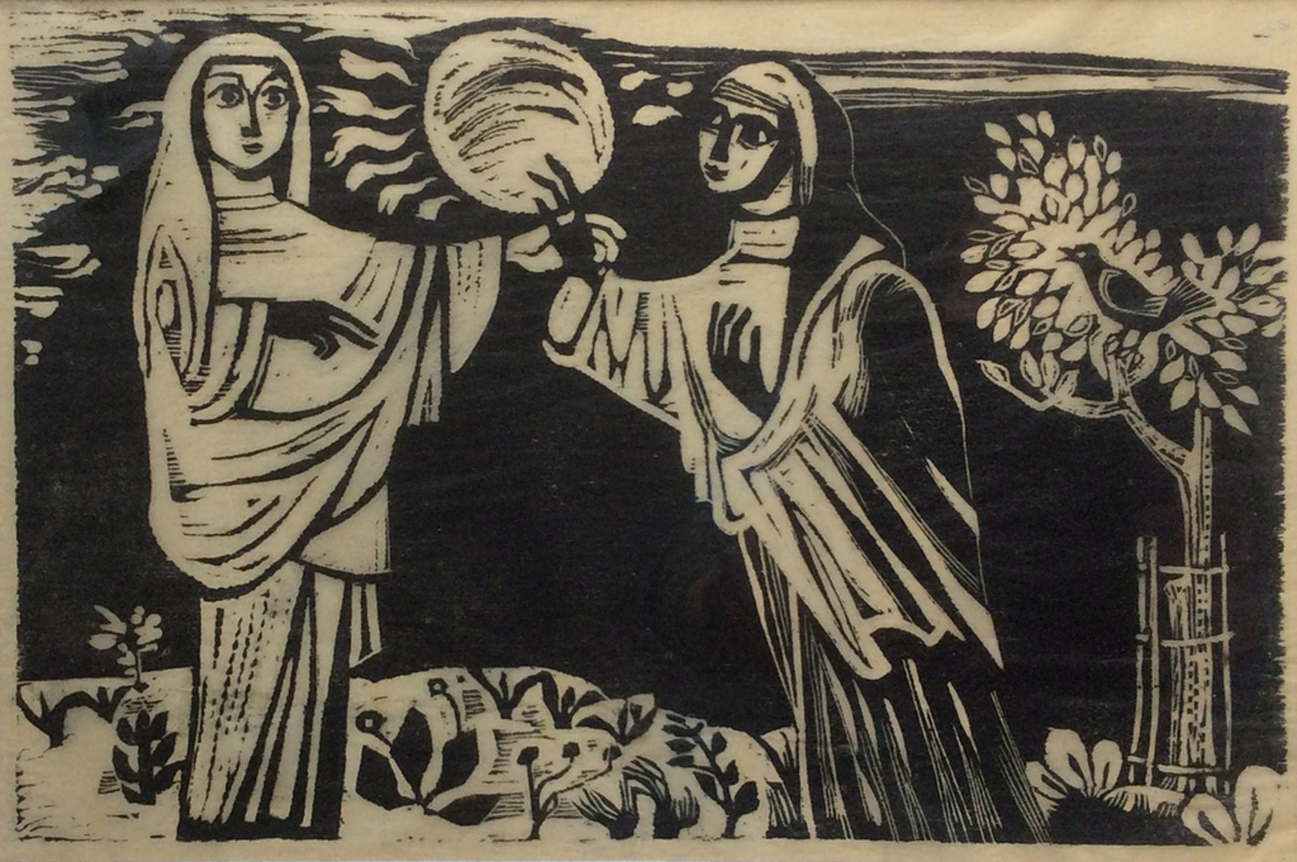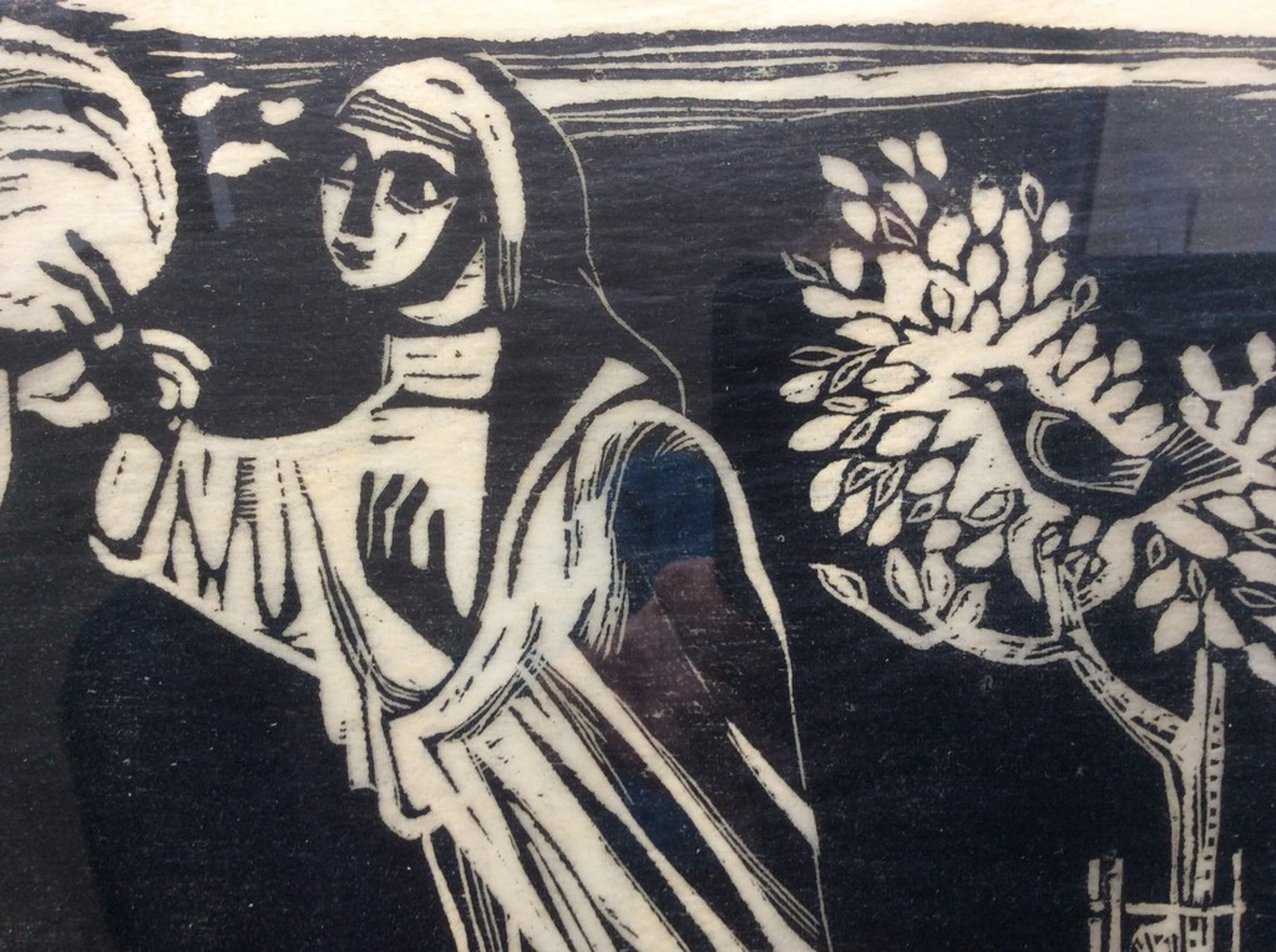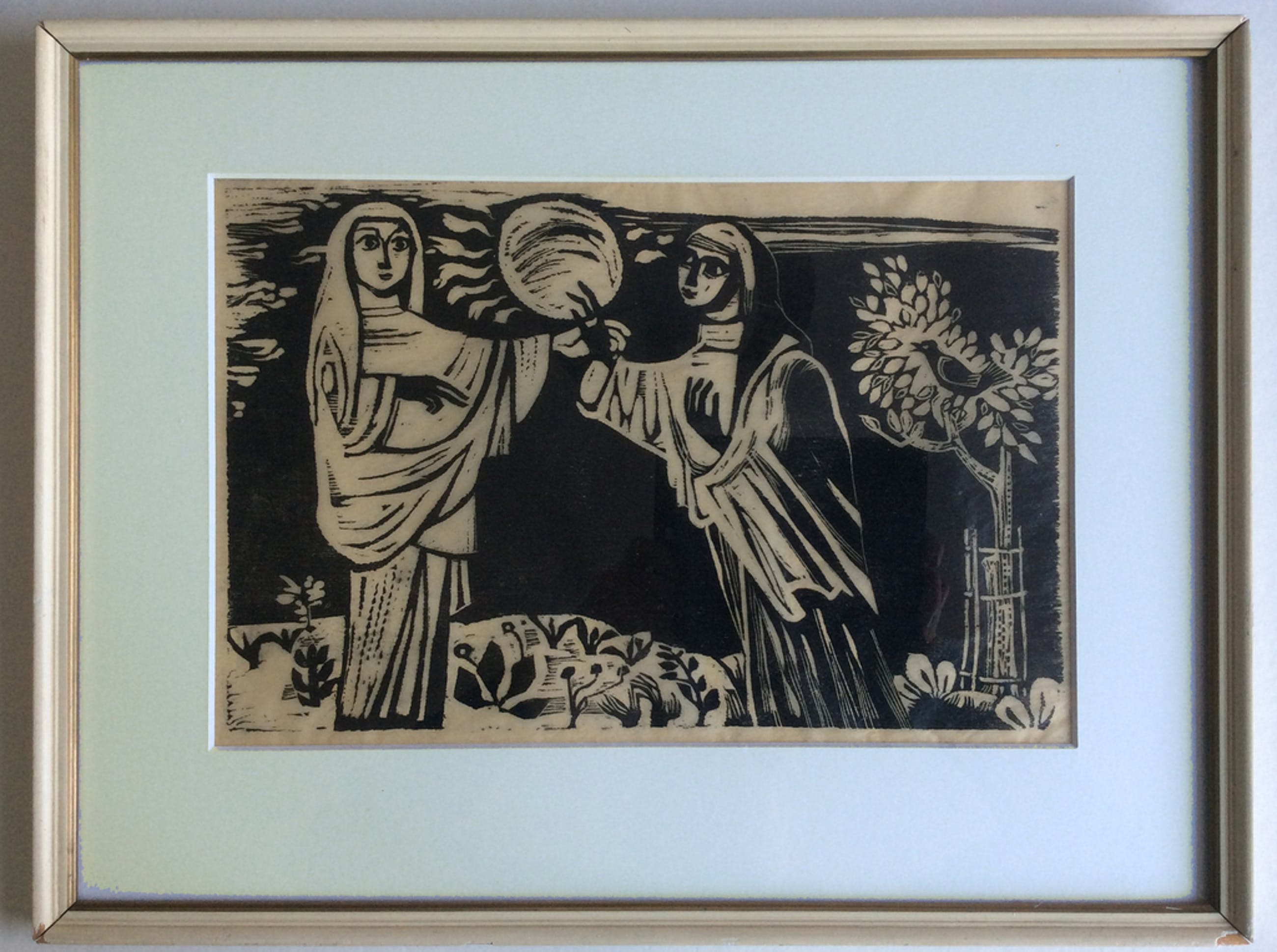 Houtsnede van Marianne van der Heijden, voorstelling van twee vrouwen in gesprek in de buitenlucht. Niet gesigneerd. Ca. 1960. In houten lijst.
