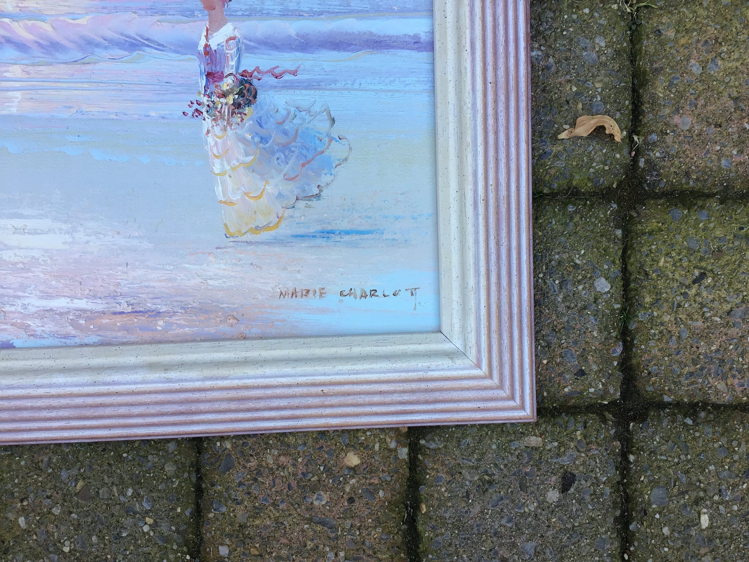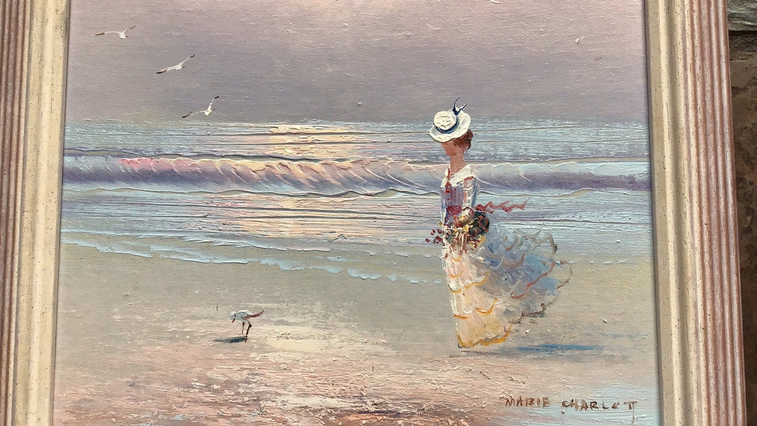 Een erg zoete ‘Marie Charlot’ in zachte pasteltinten en passend ingelijst. Perfect in conditie.