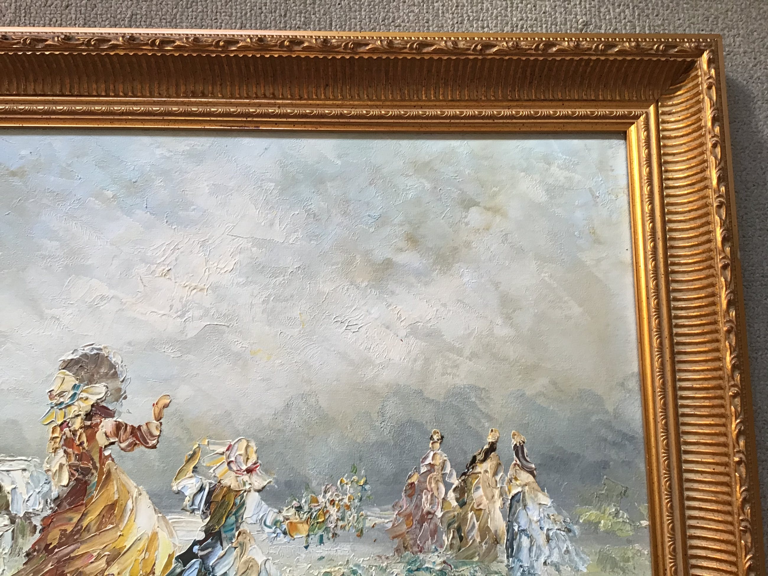 Impressionistisch werk in mooie pasteltinten. Figuren in Victoriaanse klederdracht. Zowel verf als lijst zijn als nieuw.