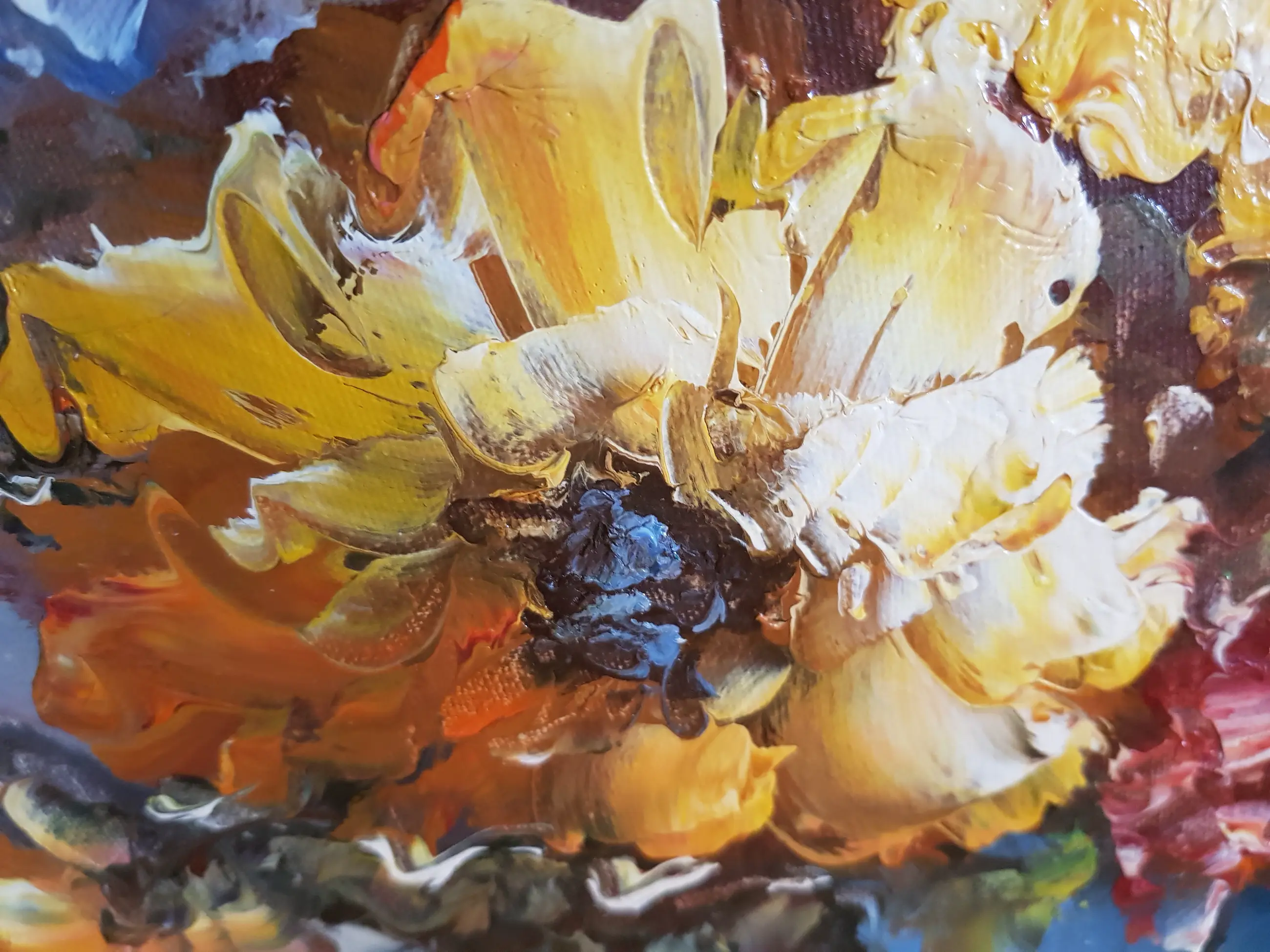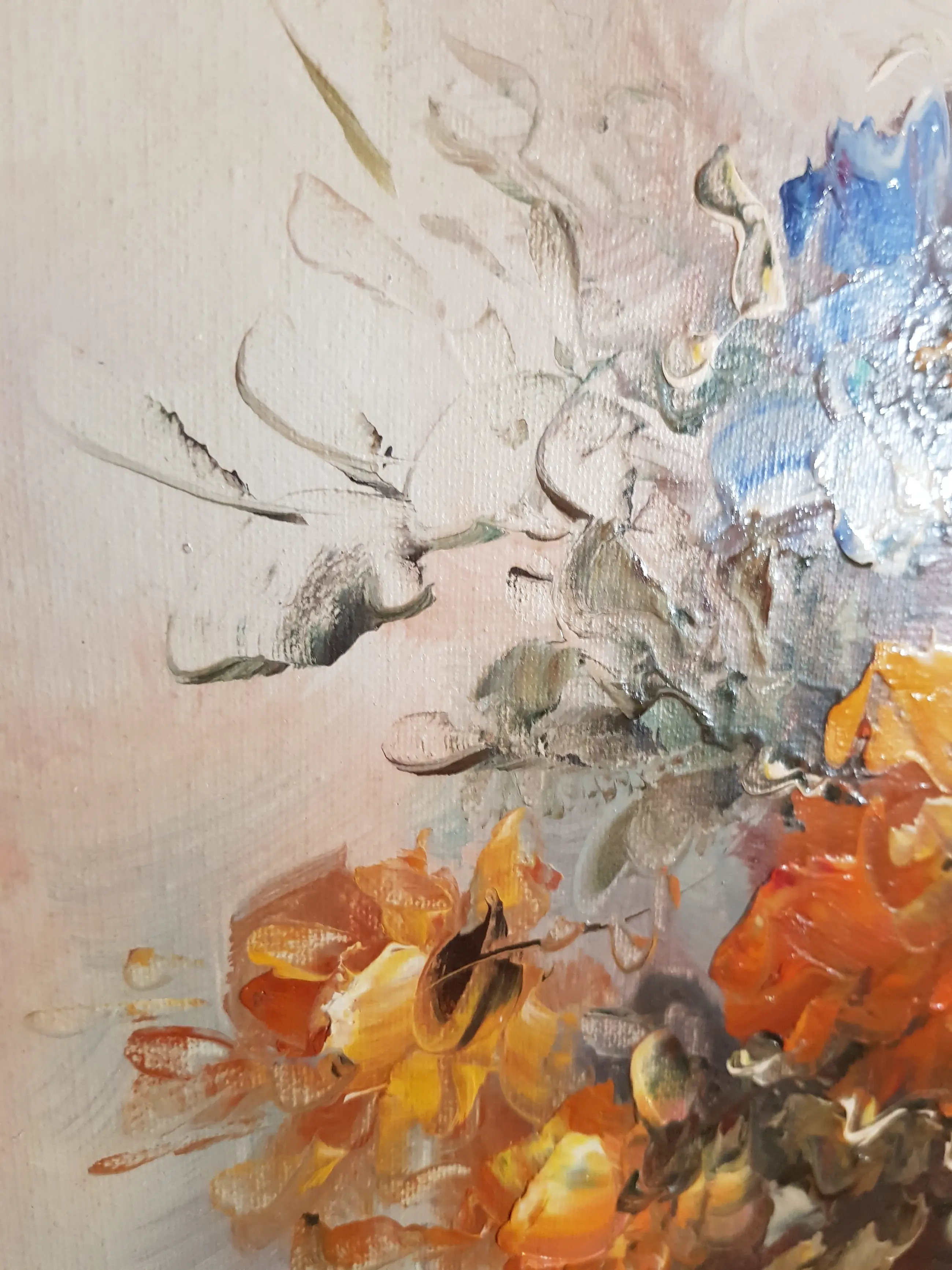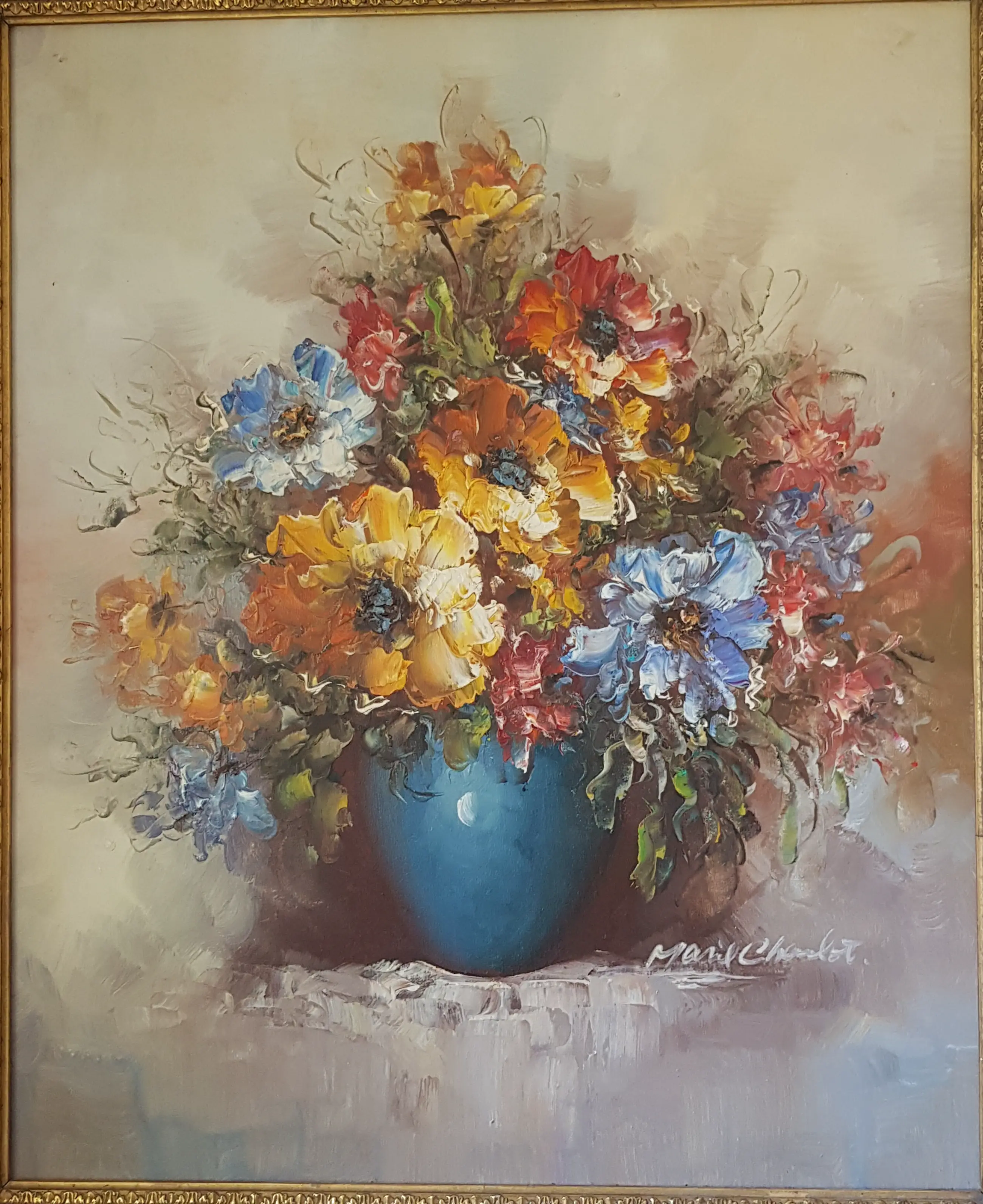 Weelderige boeket bloemen in blauwe vaas. Pasteus geschilderd met vlotheid, kundig en oog voor details. Baroklijst iets beschadigd, daarom niet in veiling. Verzending is incl. verzekering.