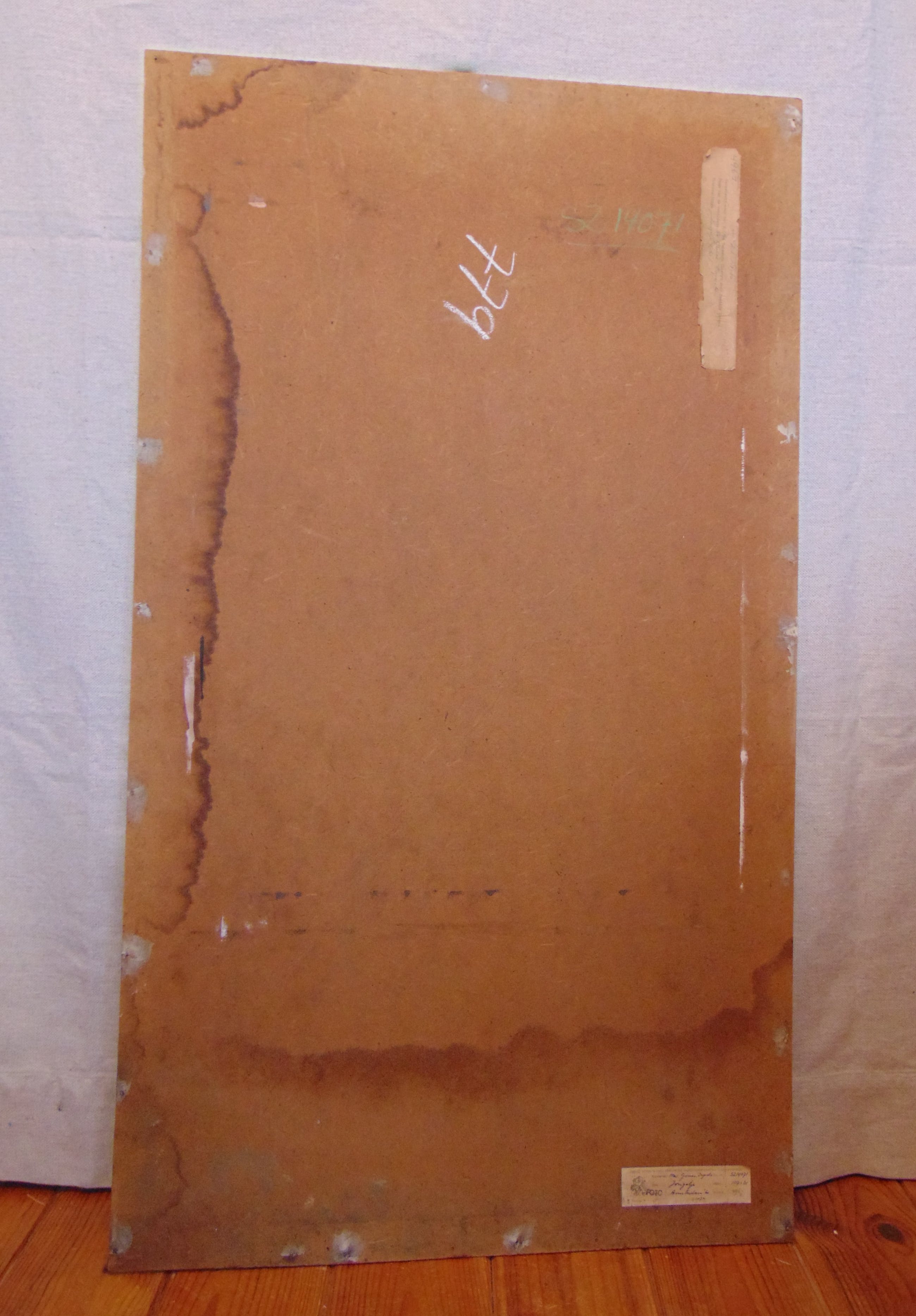 Het board heeft aan de achterzijde waterschade (zie foto), aan de voorzijde is dit niet te zien en is het werk in goede staat.