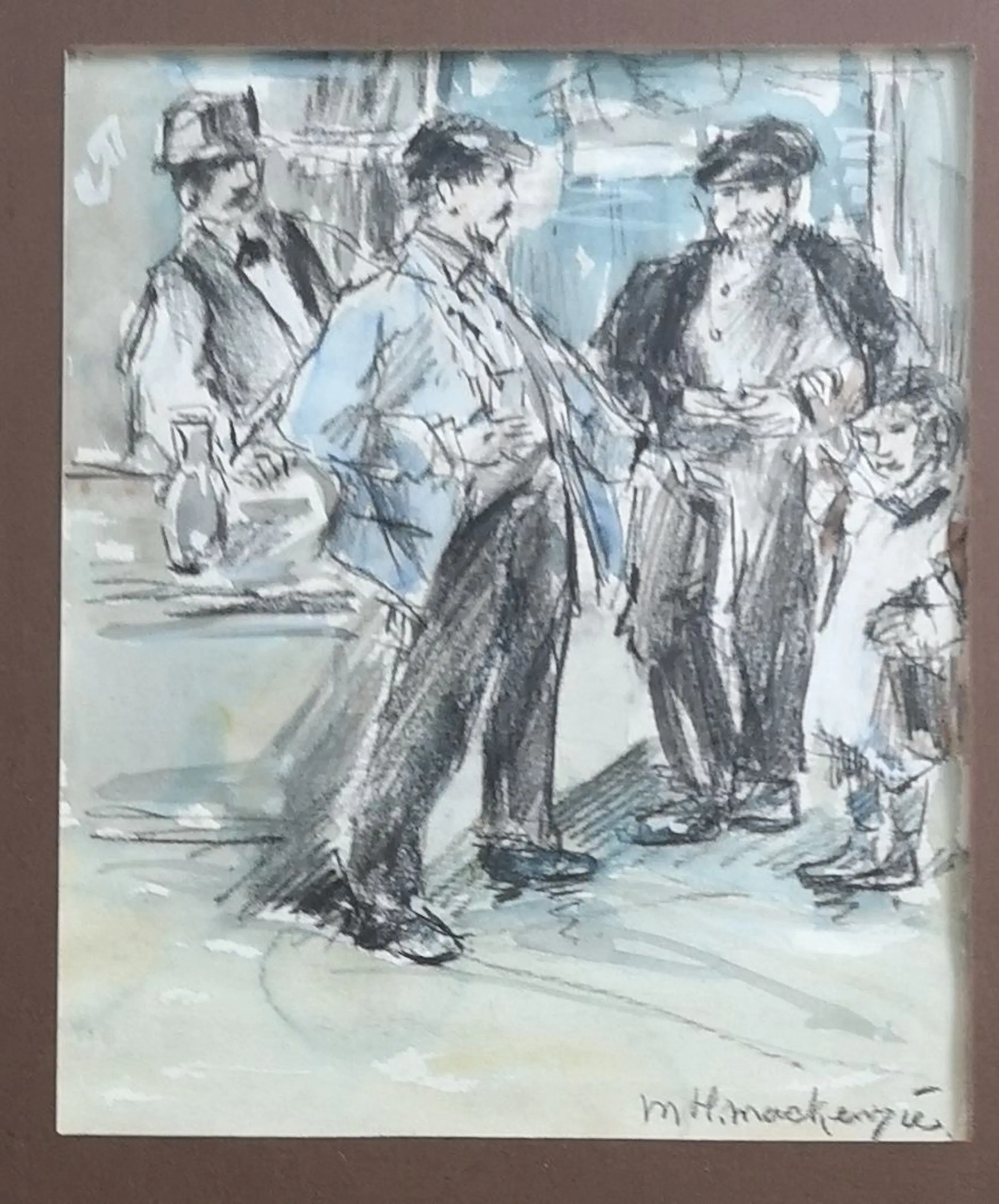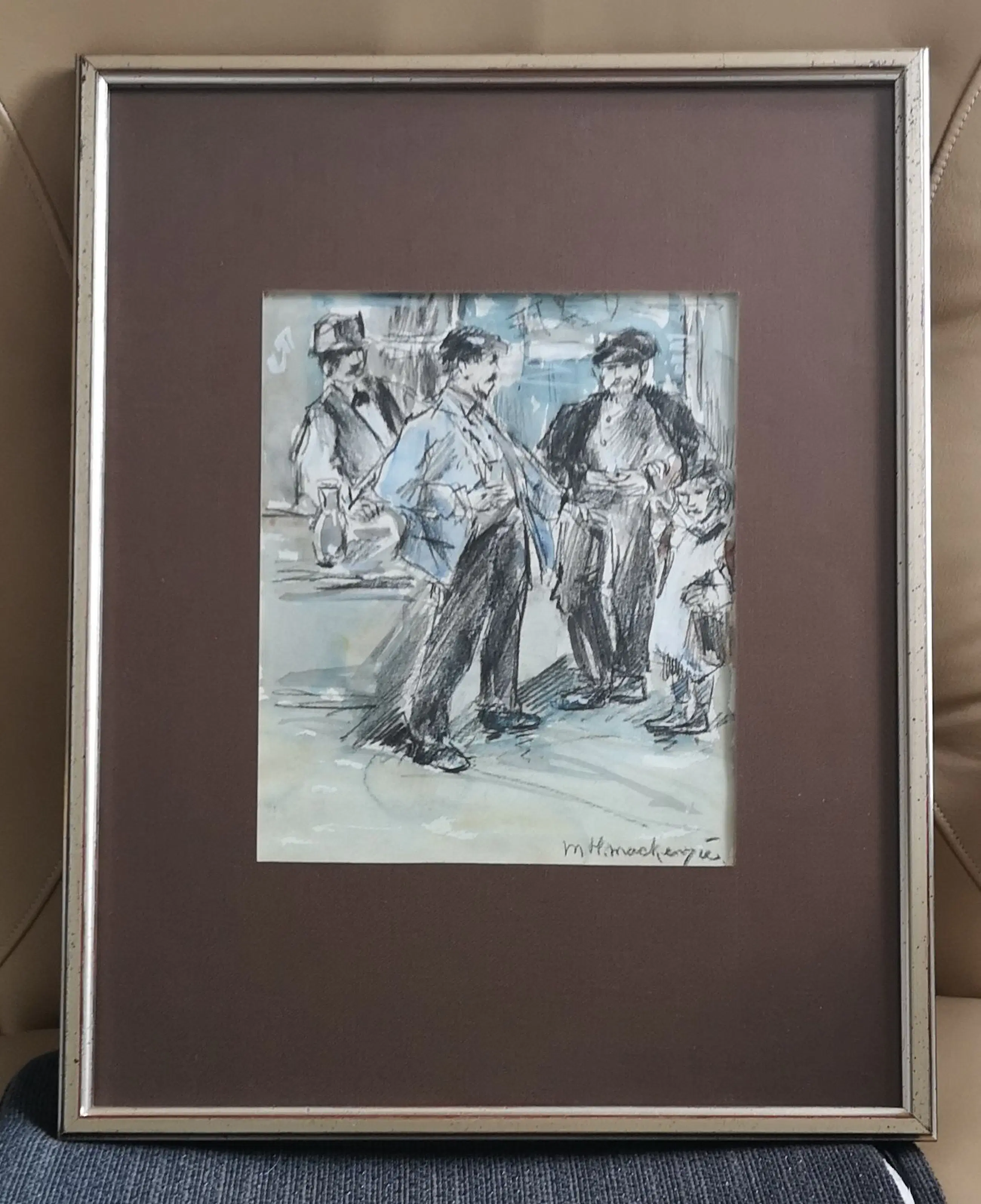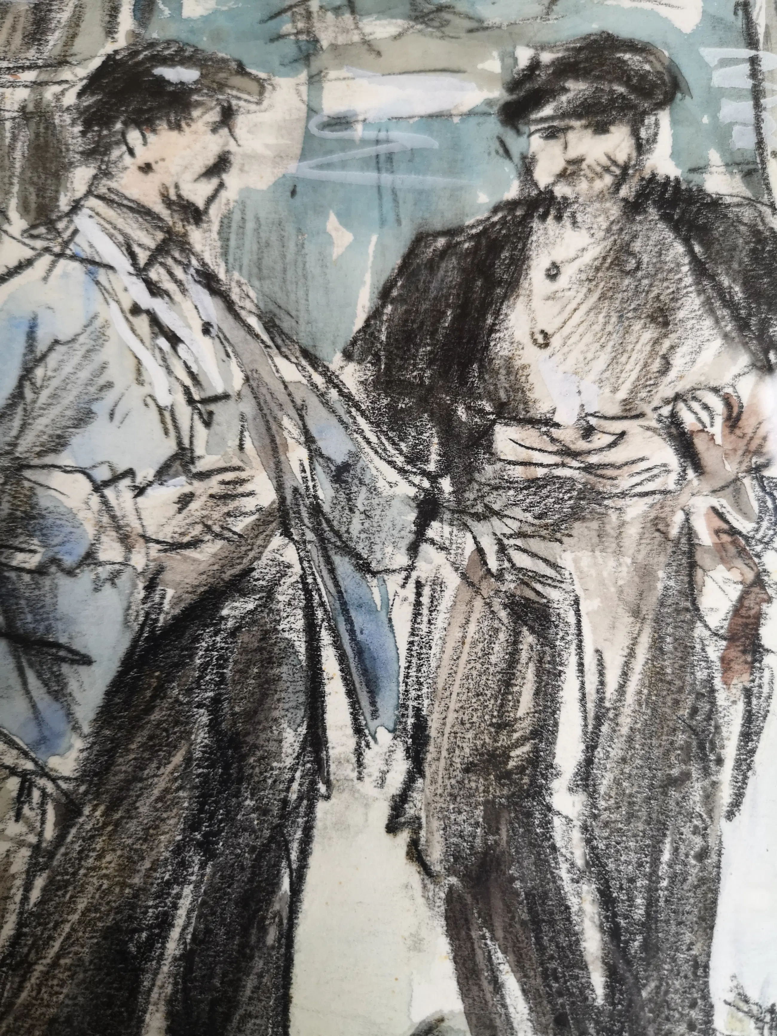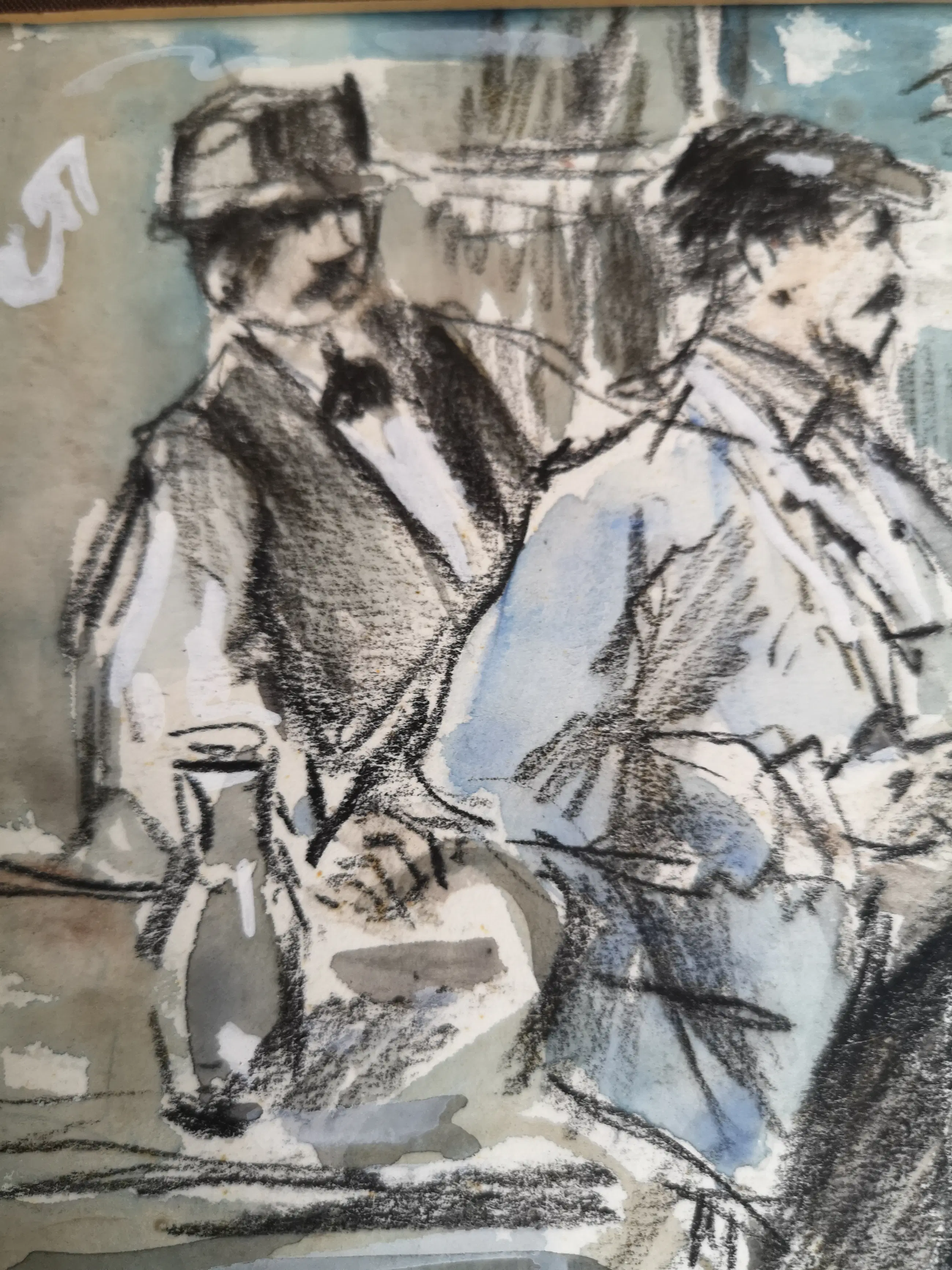 Aquarel van de beroemde schilder met een scène in een bar en verschillende mensen