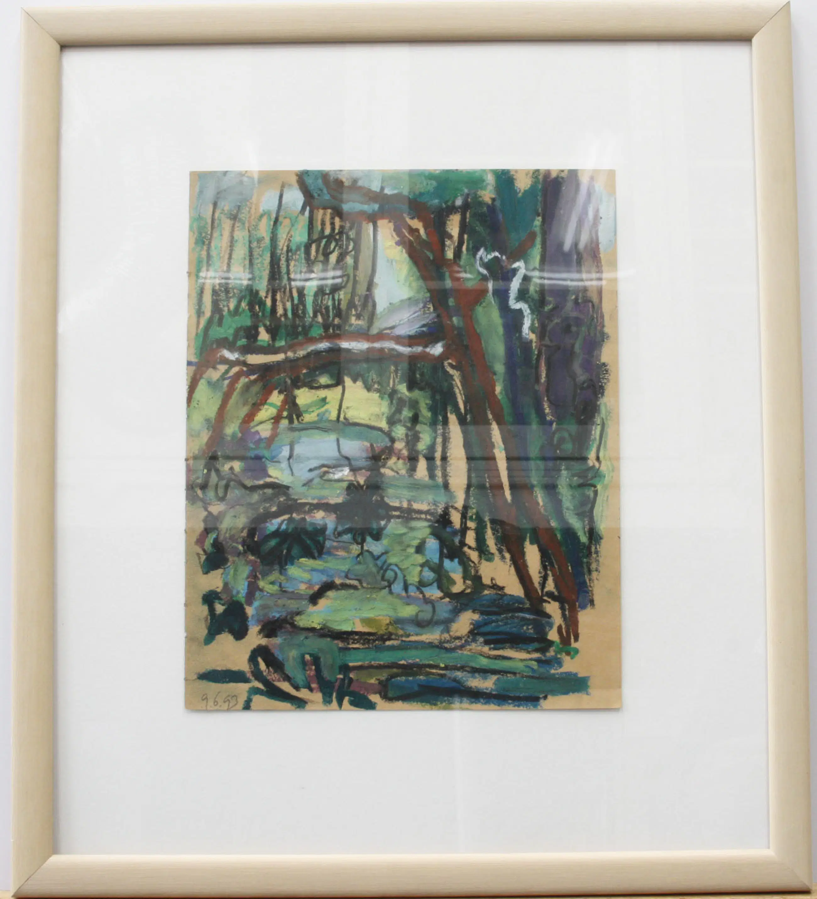 Fraai ,met pastel getekende natuur. Patel en op papier. Originele stickervan de SBK, aan achterzijde met naam kunstenares en titel. Prijs in 1993 van de kunstuitleen SBK : € 310,00