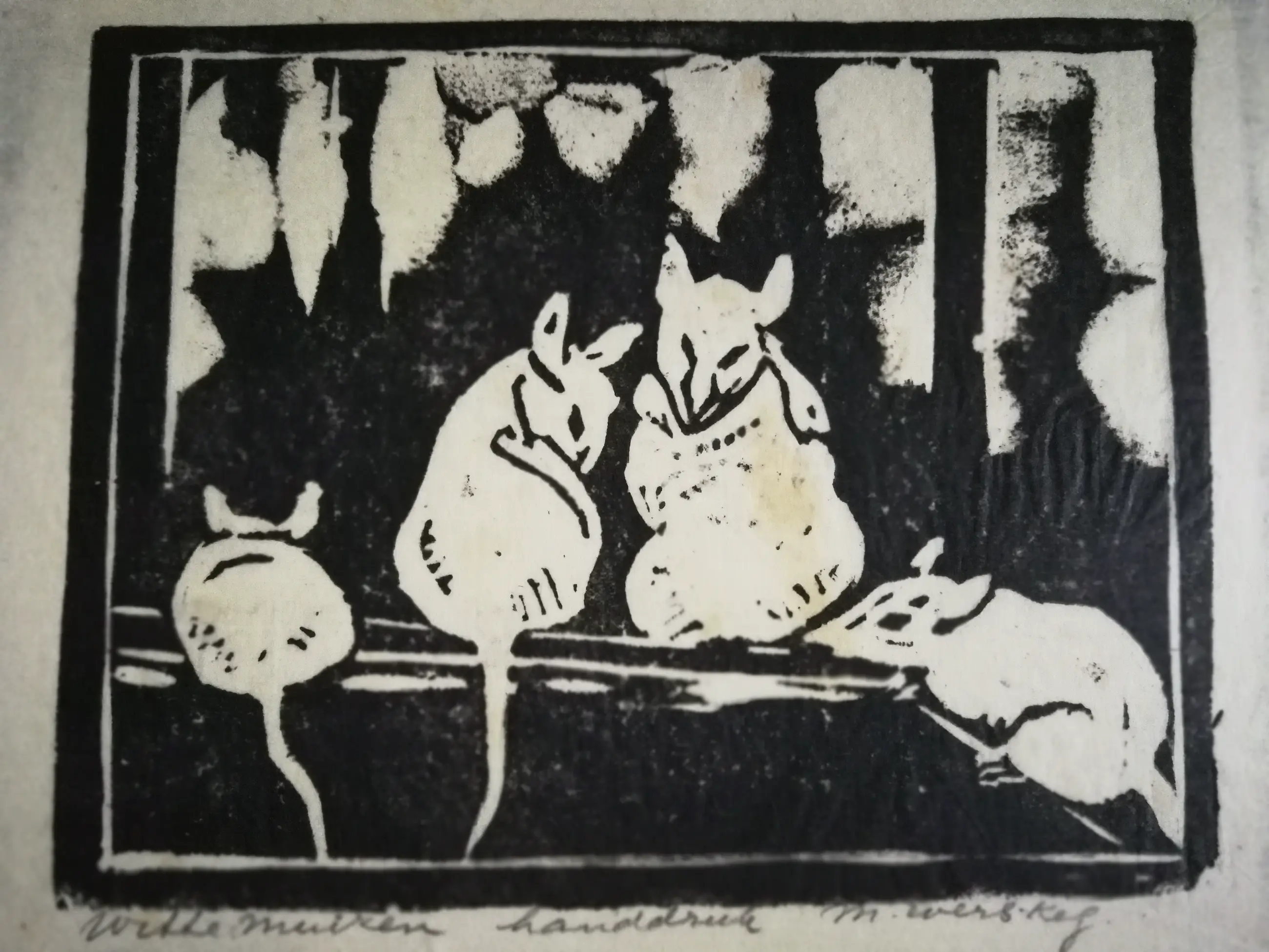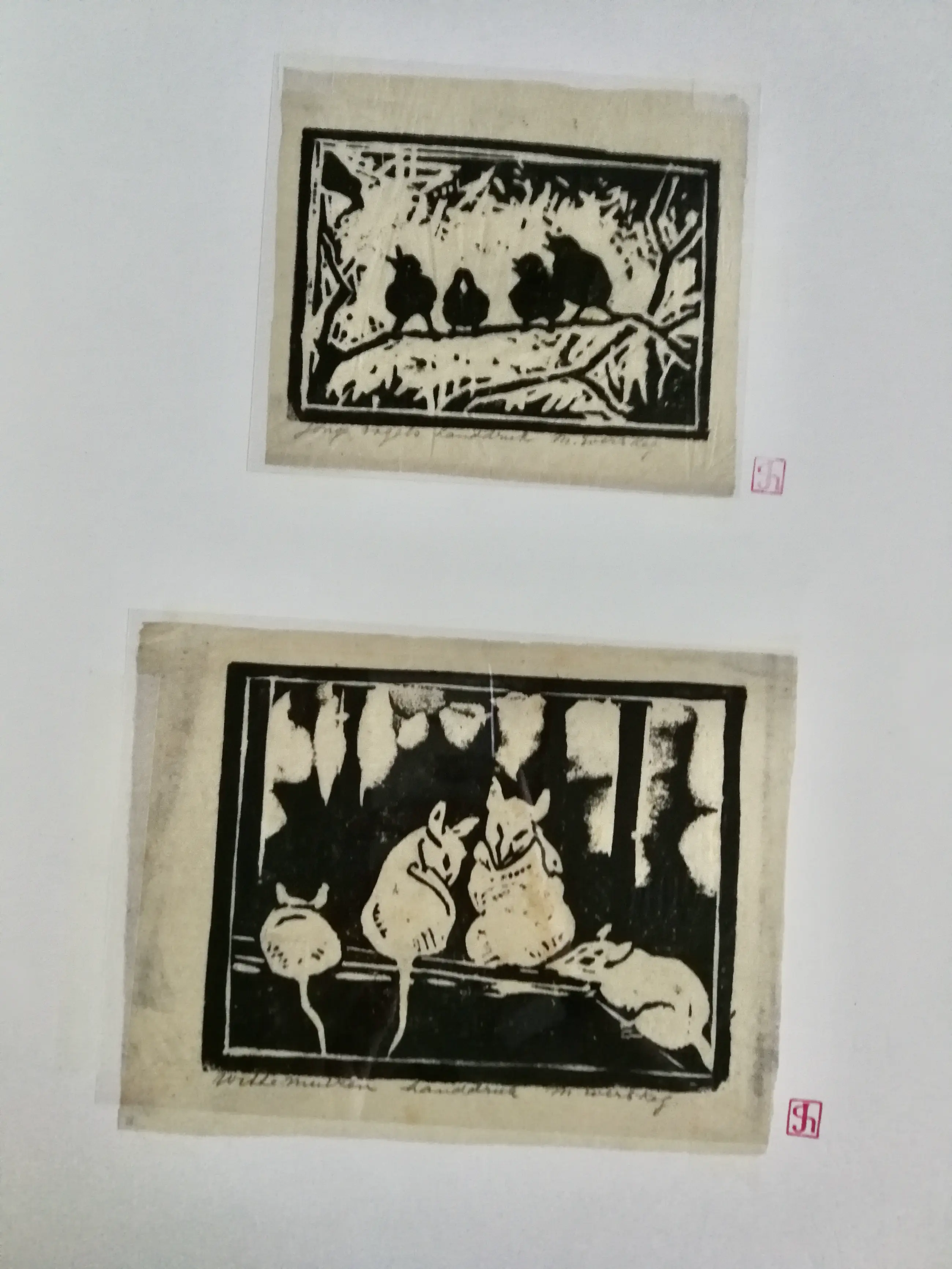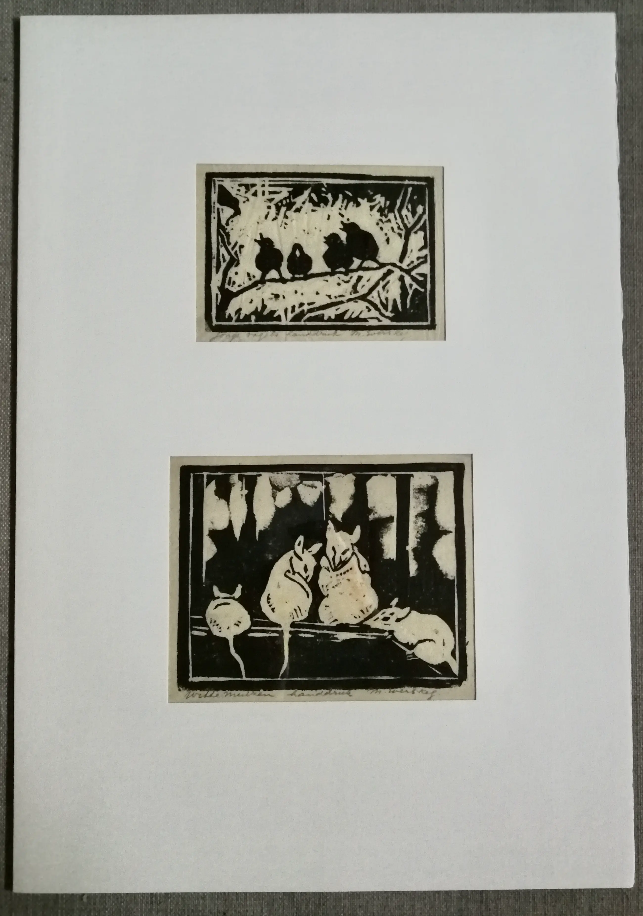 Twee houtsneden van Marie Evers-Keg, gesigneerd en getiteld in potlood. De kleinste is 12x13,5 cm. Samen geplaatst in papieren passe-partout.