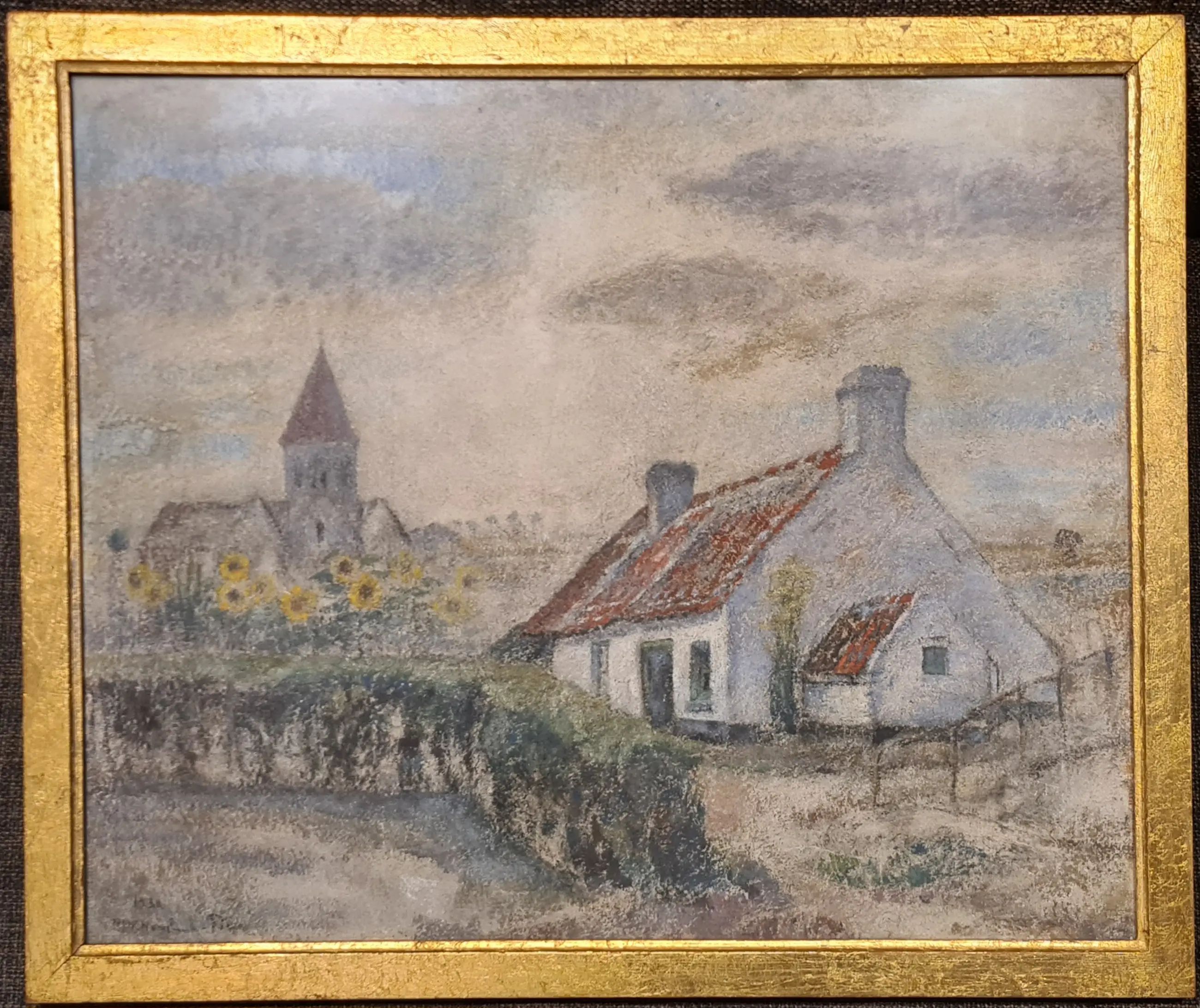 Schilderij in olieverf op doek achter glas, goudkleurige houten omlijsting.