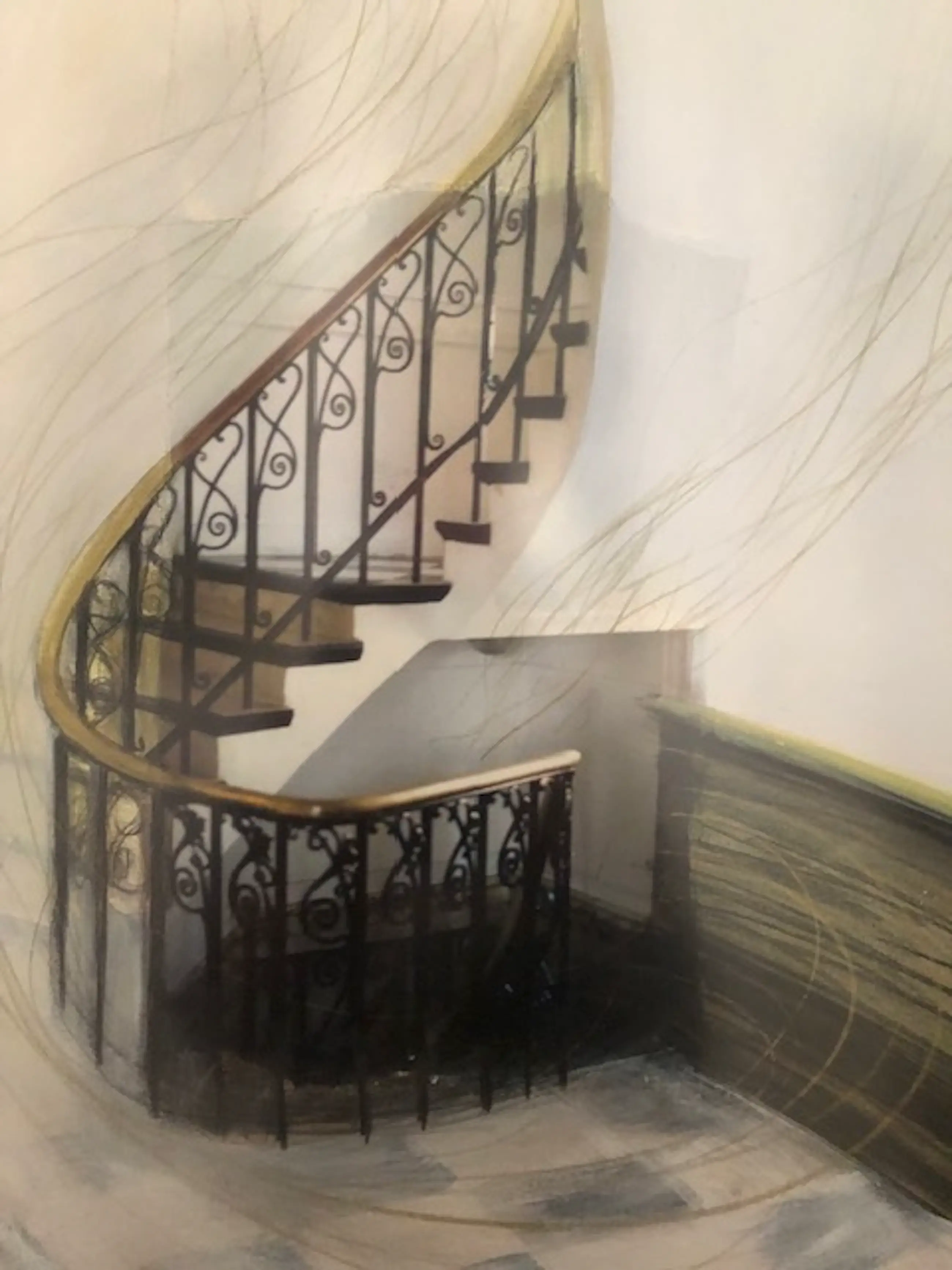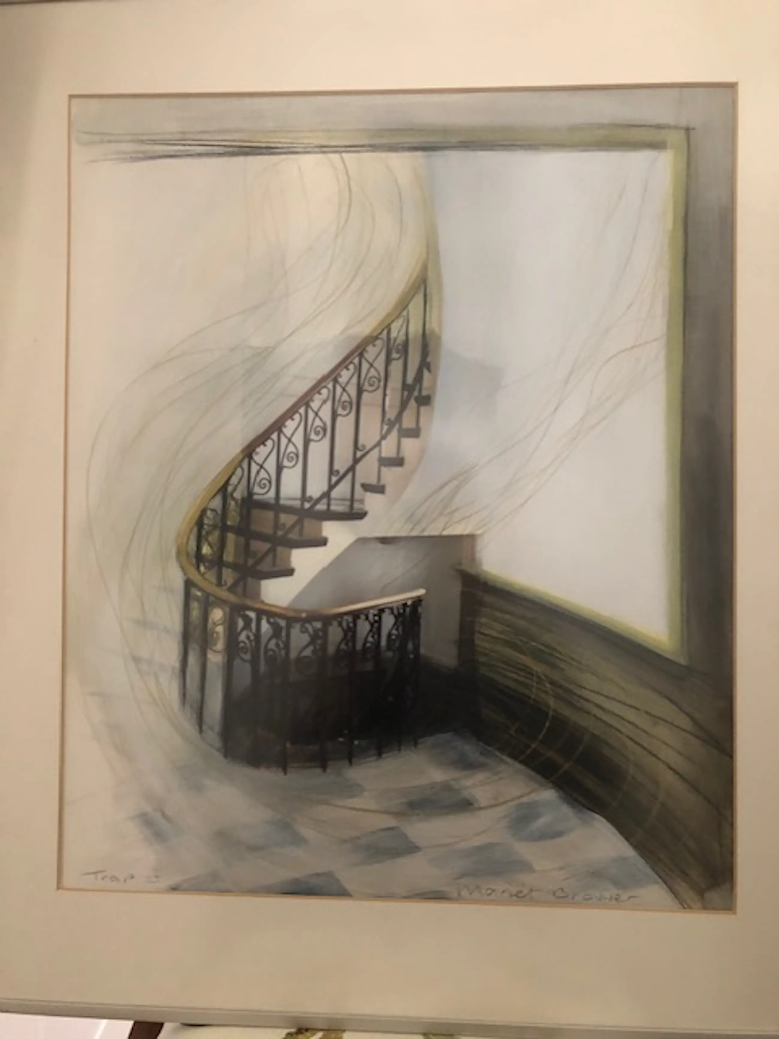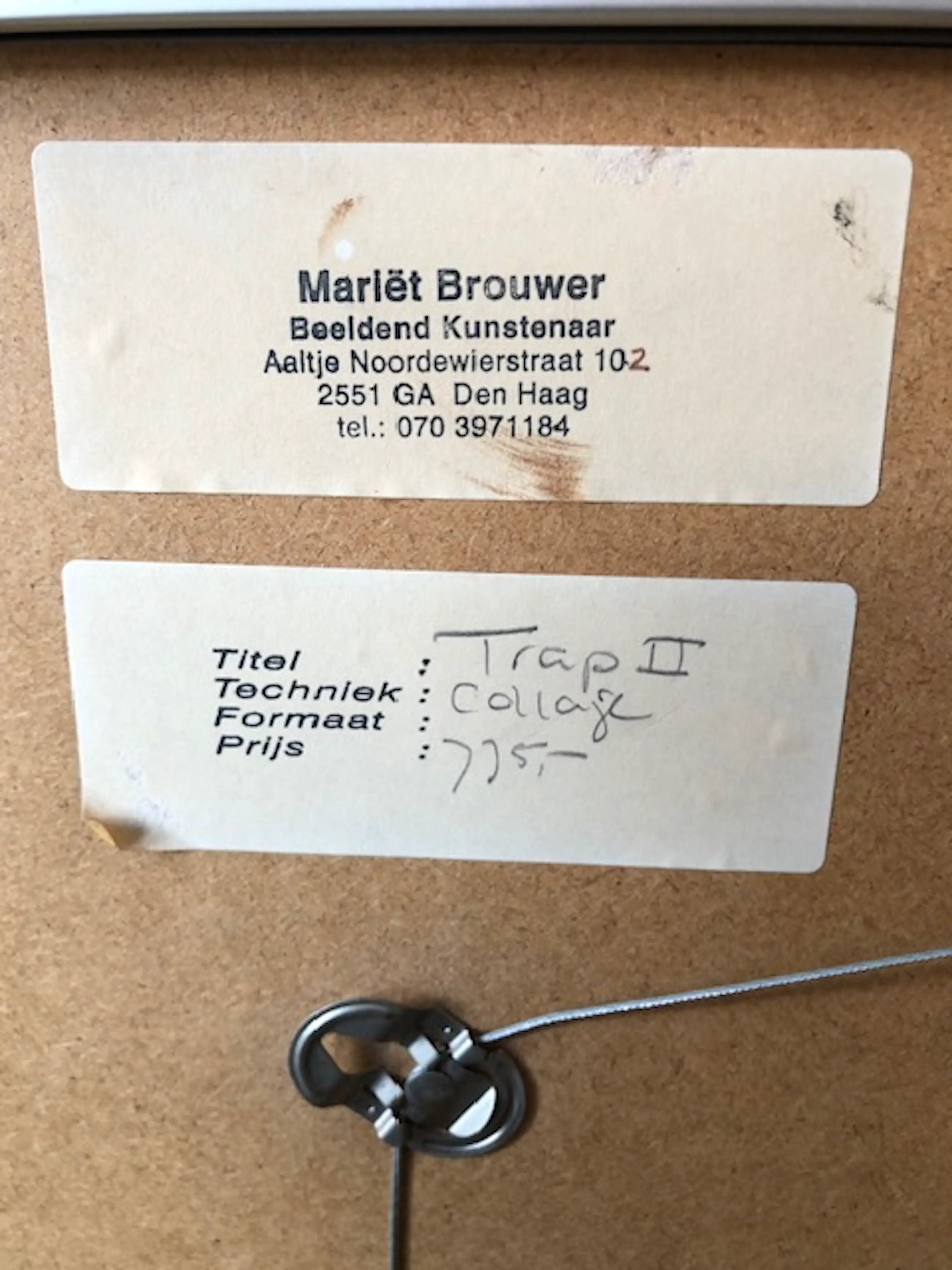 Modern vormgegeven collage schilderij van Mariët Brouwer, De Trap II Ingelijst met een passe-partout, achter ontspiegeld glas. Nieuw prijs € 775,-