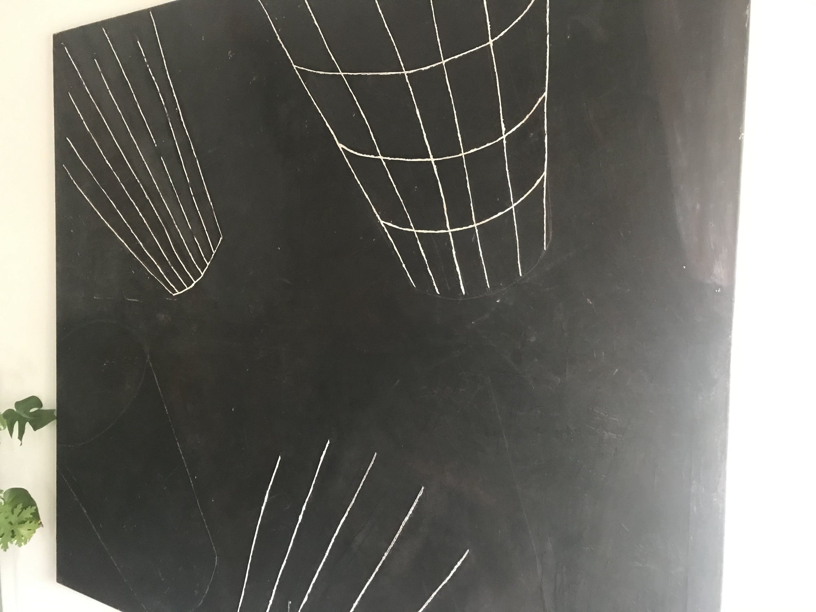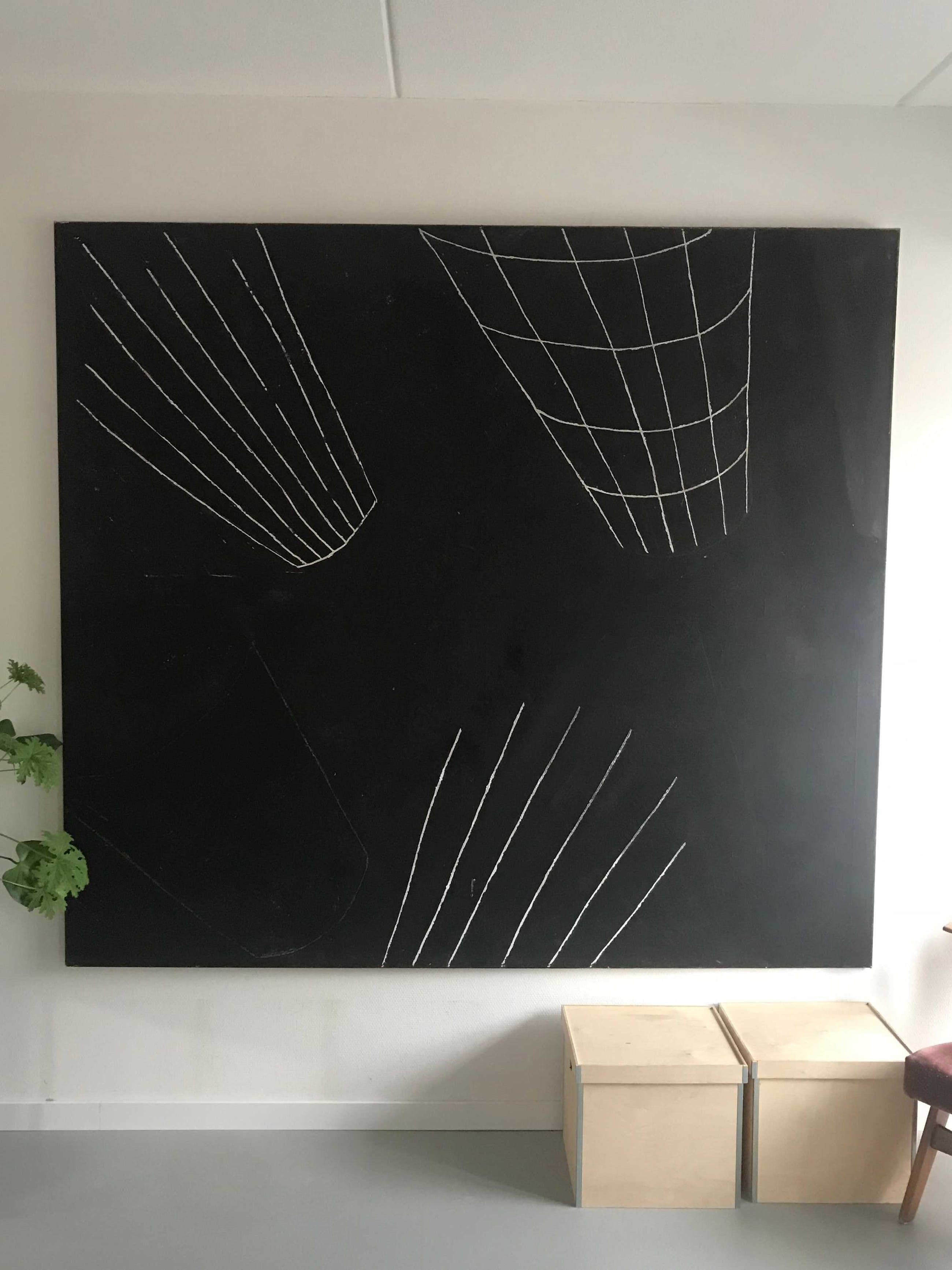 Dit prachtige werk heb ik als oud werknemer van het CBKU in Utrecht kunnen bemachtigen en heeft jaren diverse plekken in ons huis verrijkt. Het is een prachtig donker groot werk met meerdere lagen en heeft een tijdloos strak ontwerp. Het werk heeft ruimte nodig en die kunnen we hem niet meer geven helaas. Ook het centraal museum in Utrecht heeft interesse in het werk maar is nog niet concreet dus wees ze voor en geniet van dit prachtige werk van Mariette Linders.