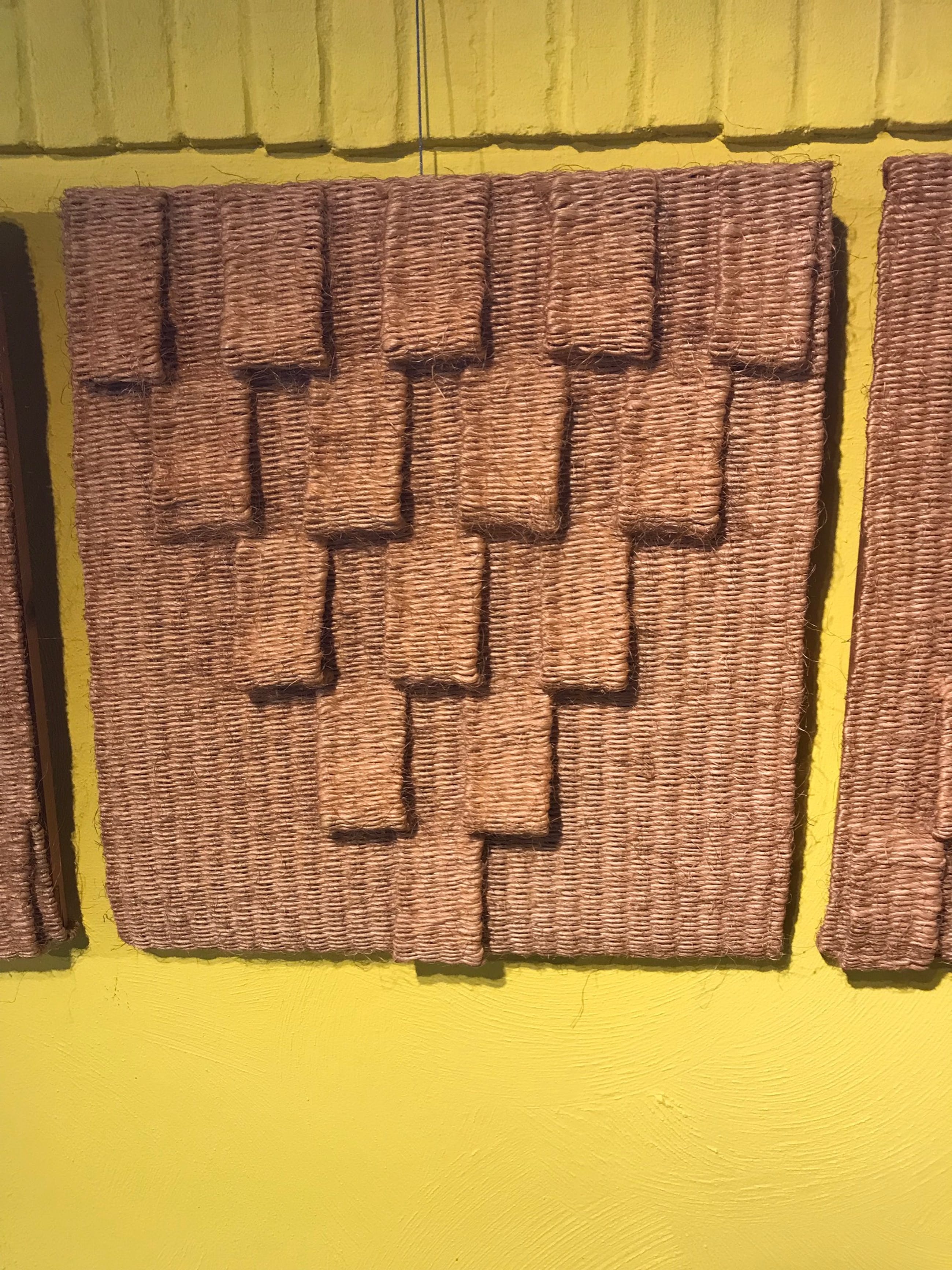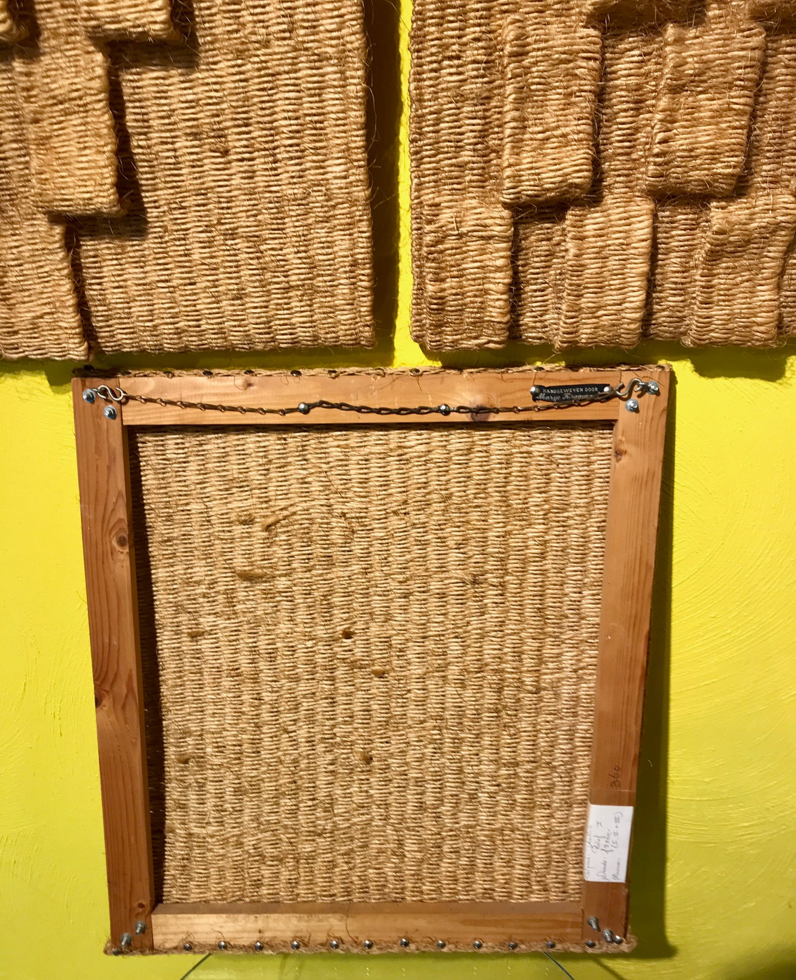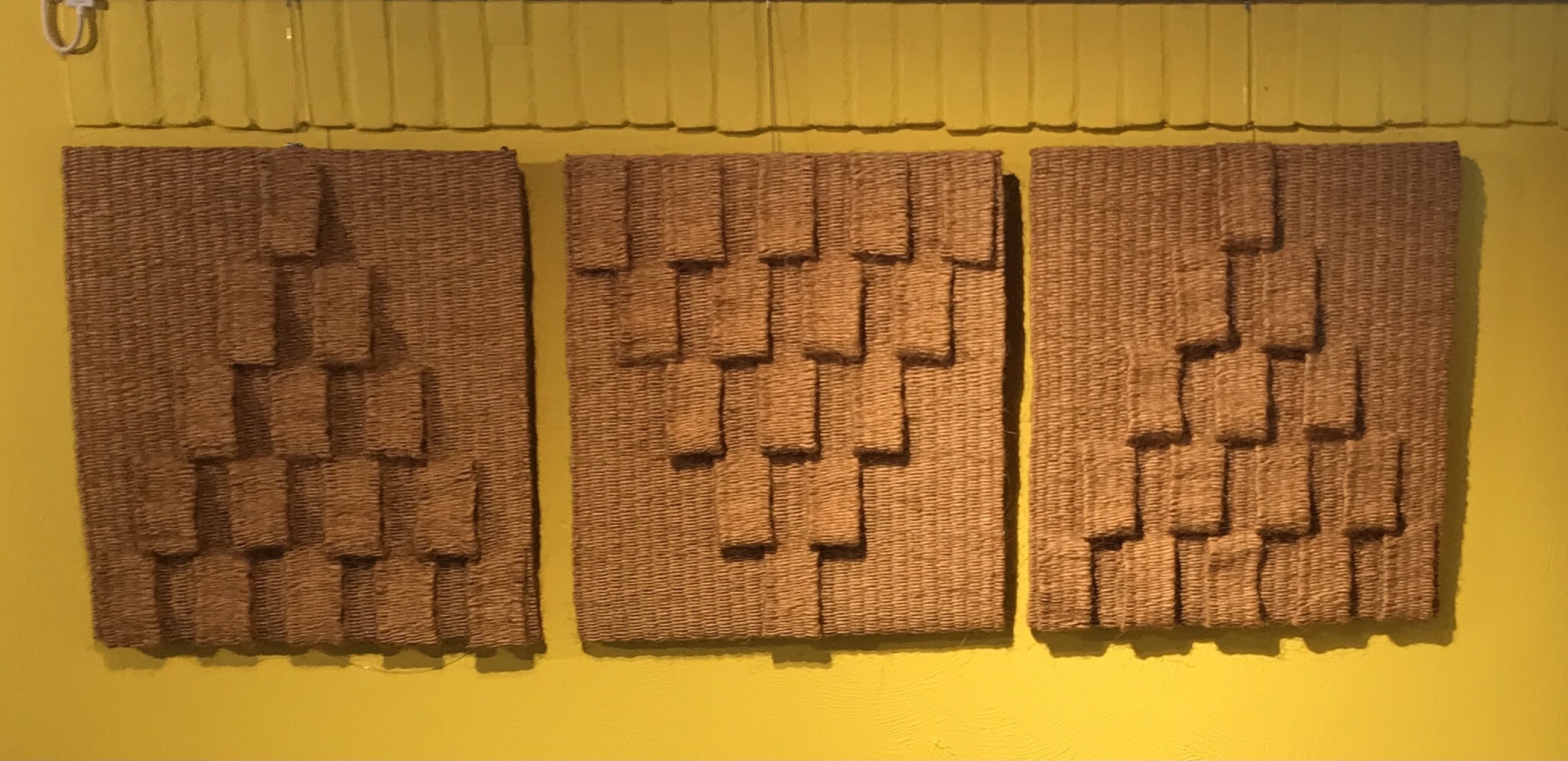 Textieltriptiek van sisal, geverfd in een bad met schillen van blanke uien en gedroogde schildluizen en geweven op de basse-lisse-methode. De drie delen meten elk 62x57 cm.