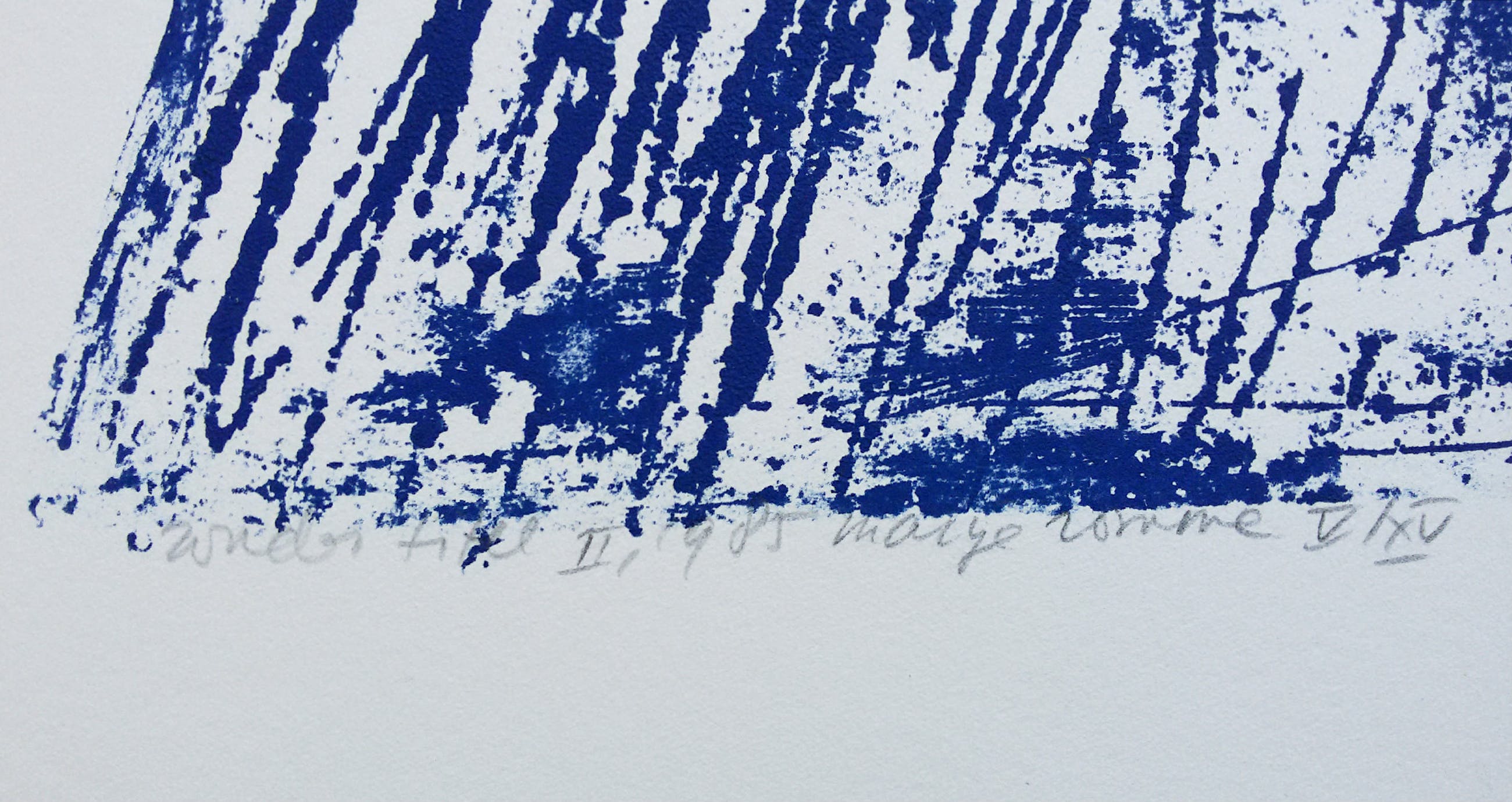Intrigerend, groot werk van Marije Romme uit 1985. “Zonder titel II” heet het en dat vind ik dan weer leuk want dat is ook een titel natuurlijk ;-) Droge naald(?) aquatint(?) ets op papier, met potlood gesigneerd, gedateerd, “getiteld” en genummerd (V/XV = 5/15). Afkomstig uit de kunstcollectie van ABNAMRO, in goede conditie. Er zitten twee geisoleerde oxidatie stipjes middenboven en rechtsonder het beeld (net te zien op de foto’s), maar die zijn niet echt storend naar mijn mening.