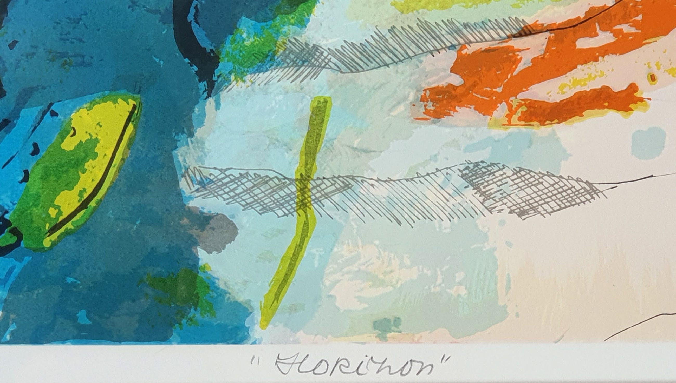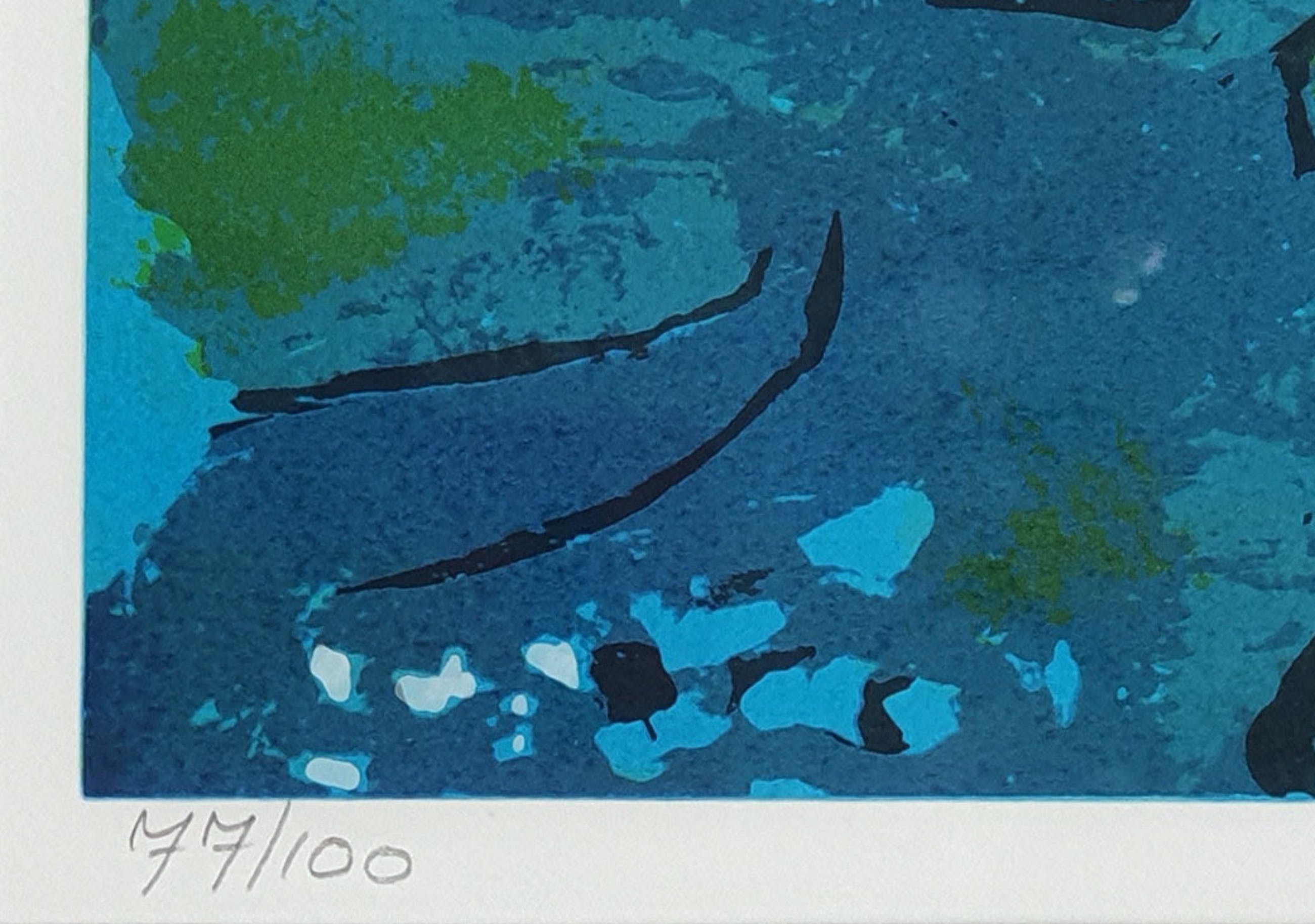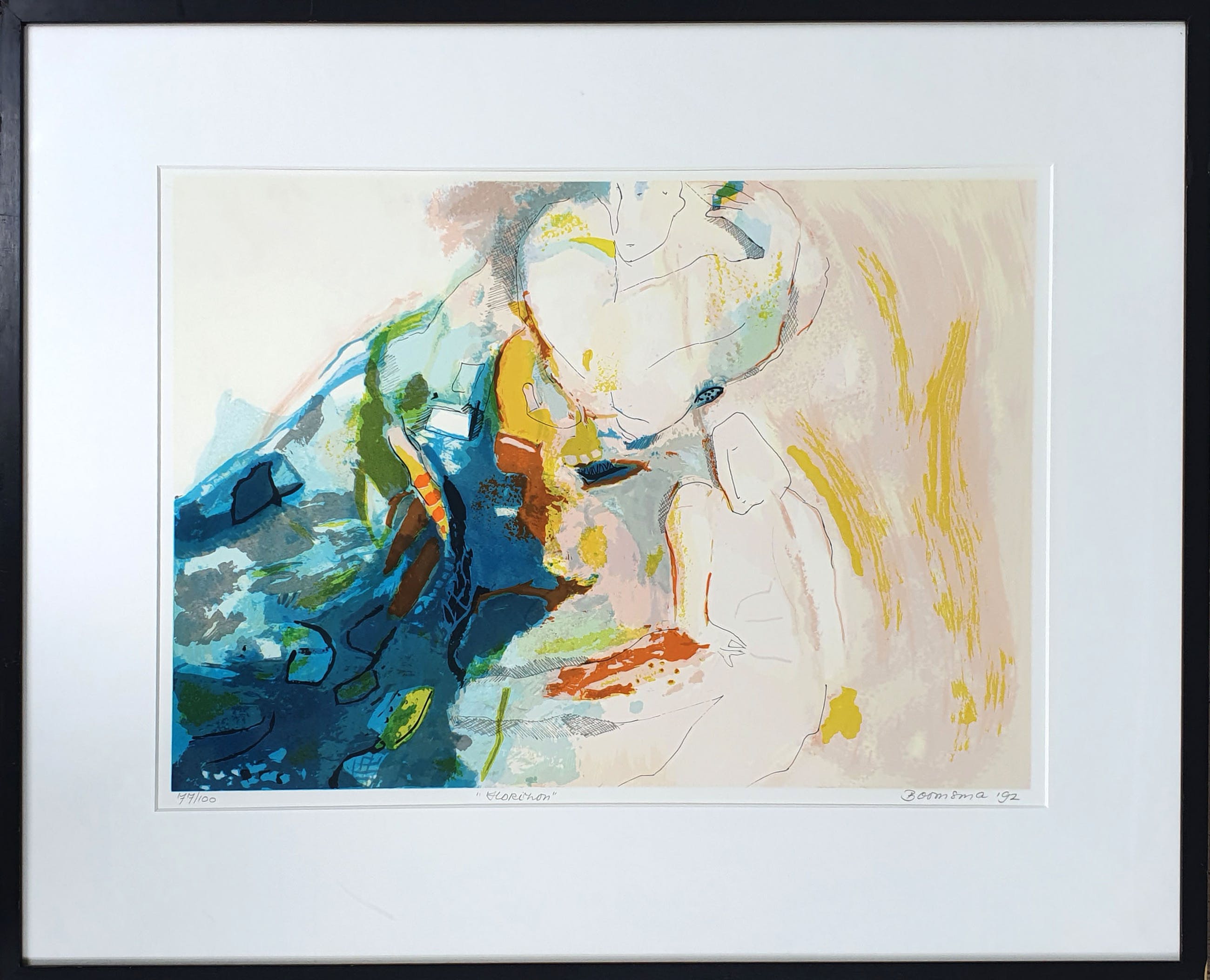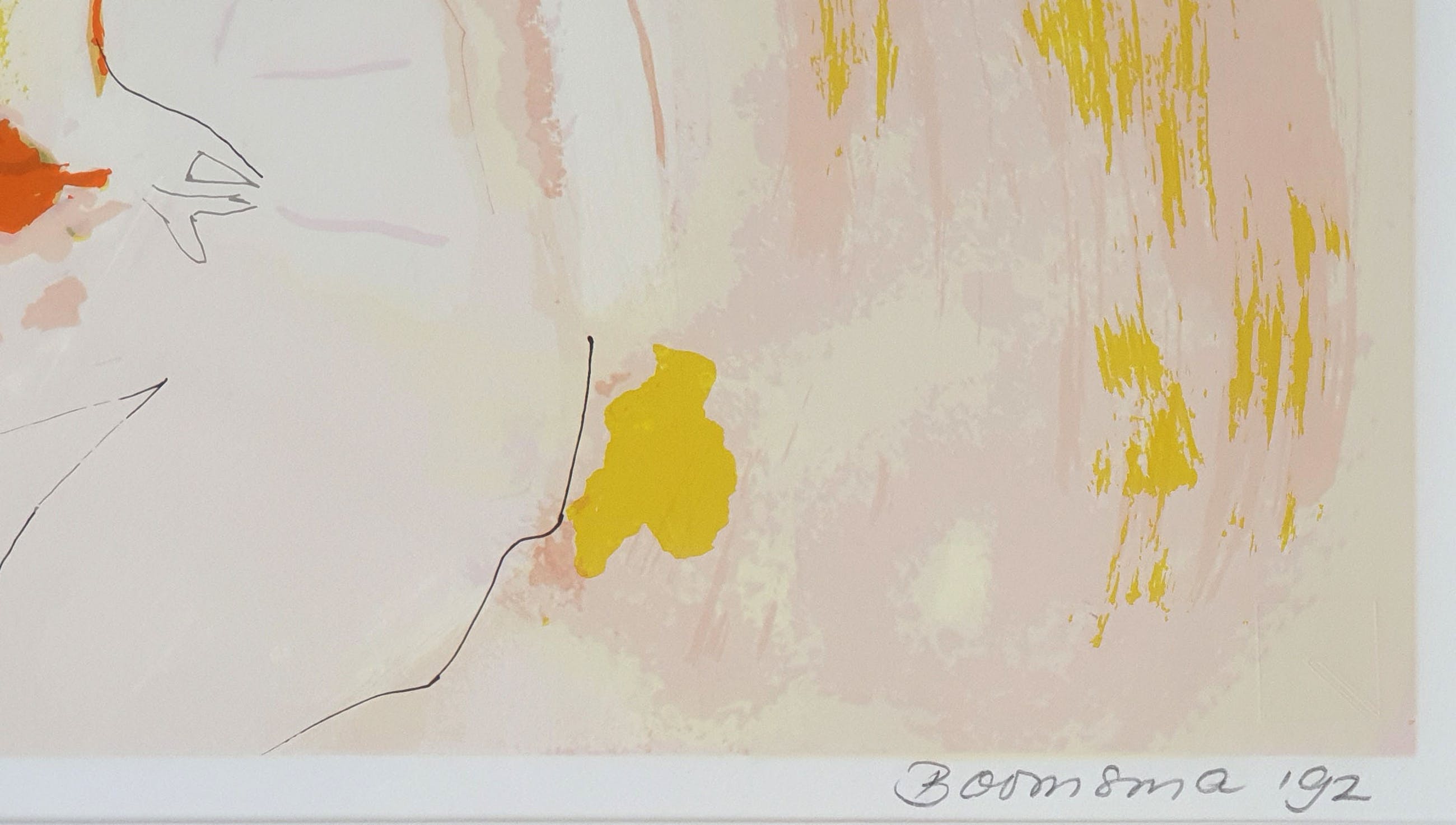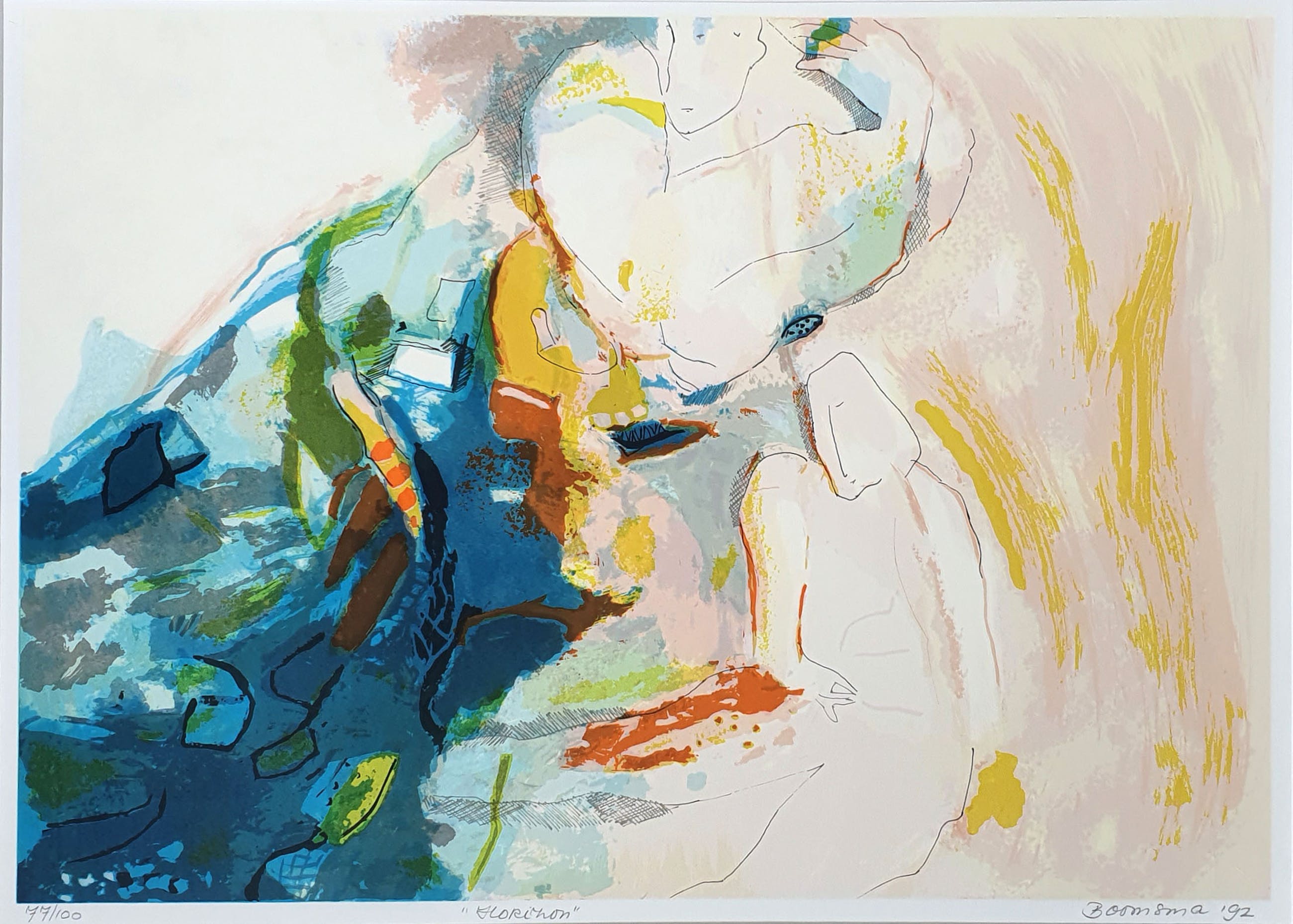 Mooi abstract werk van Marijke Boomsma uit 1992. De zeefdruk is genummerd (7/100) en handgesigneerd door de kunstenaar.