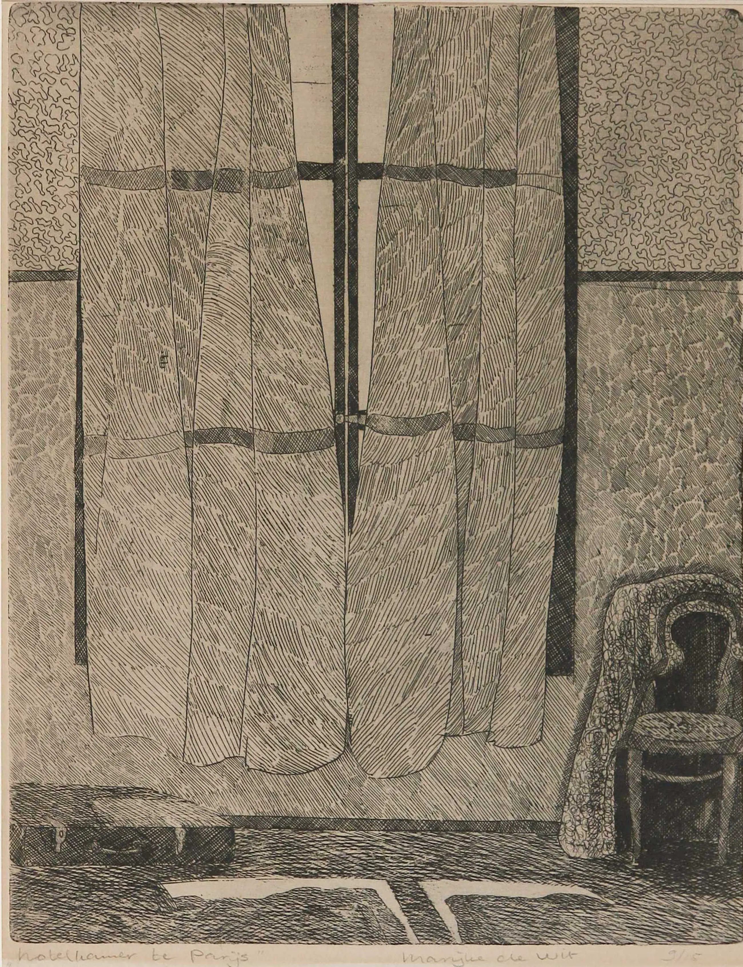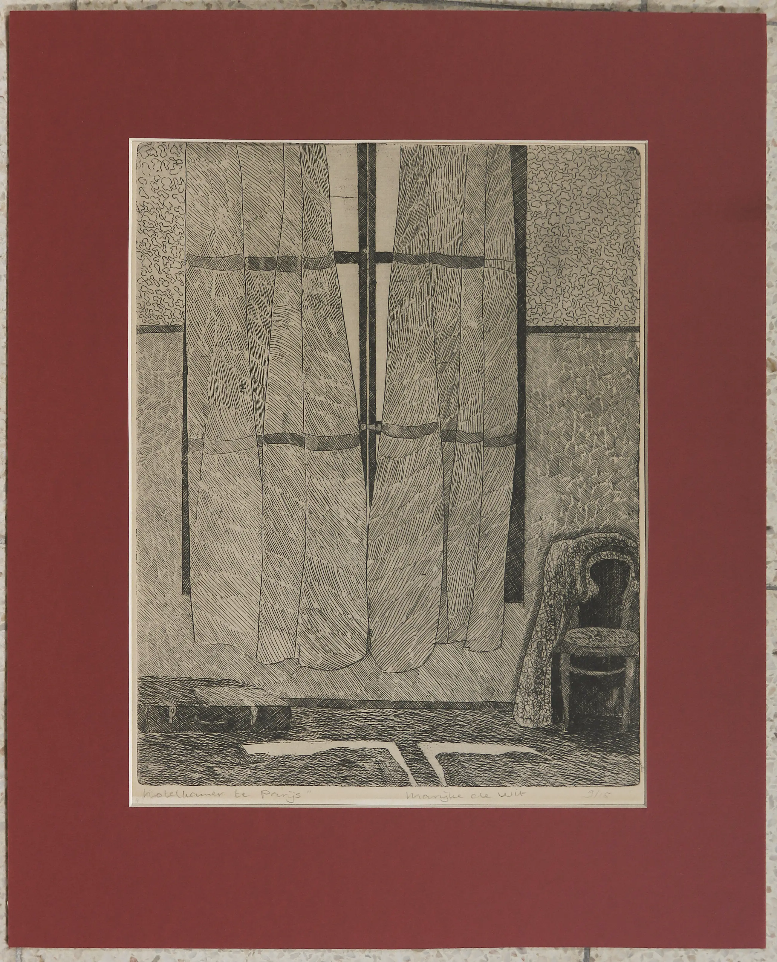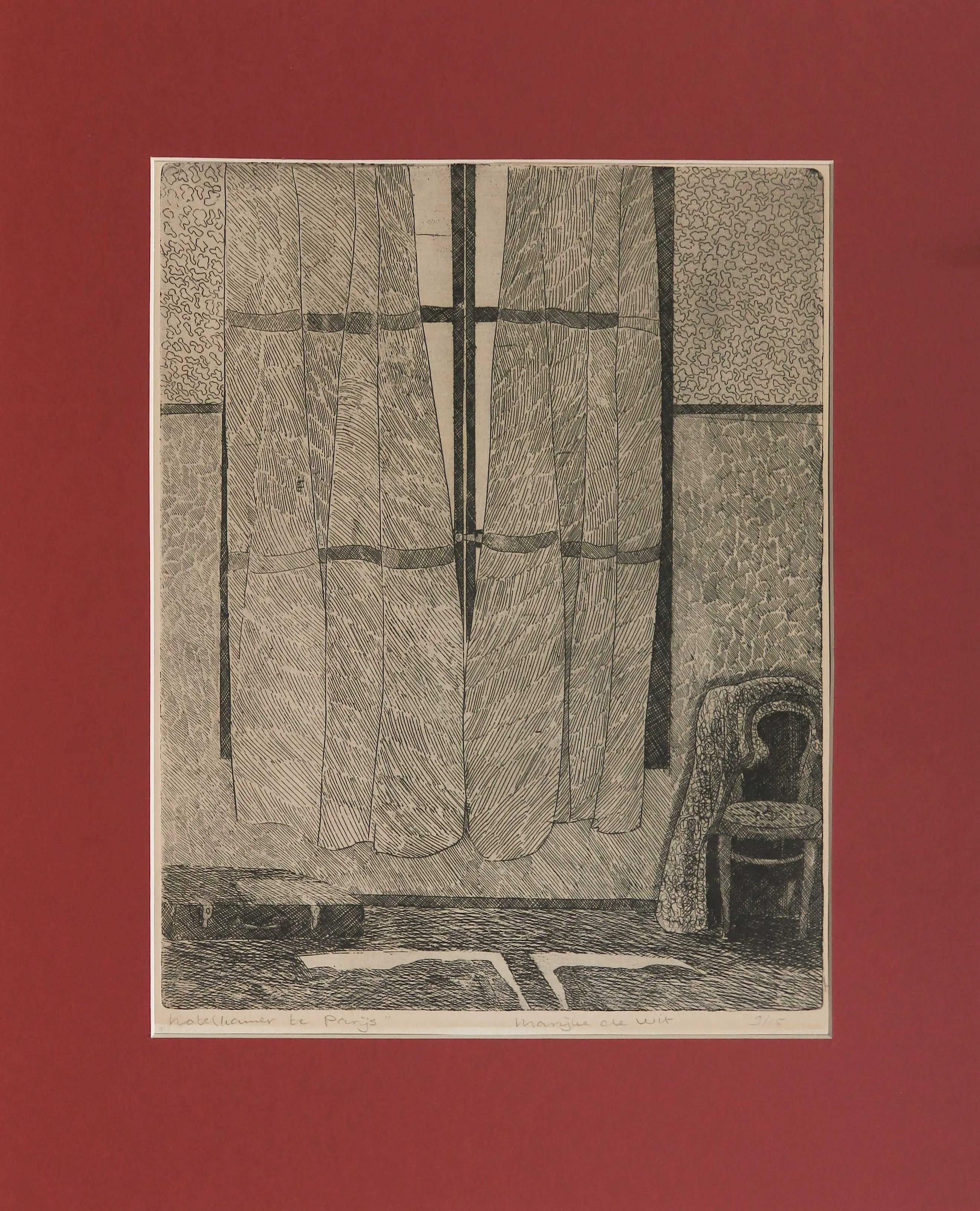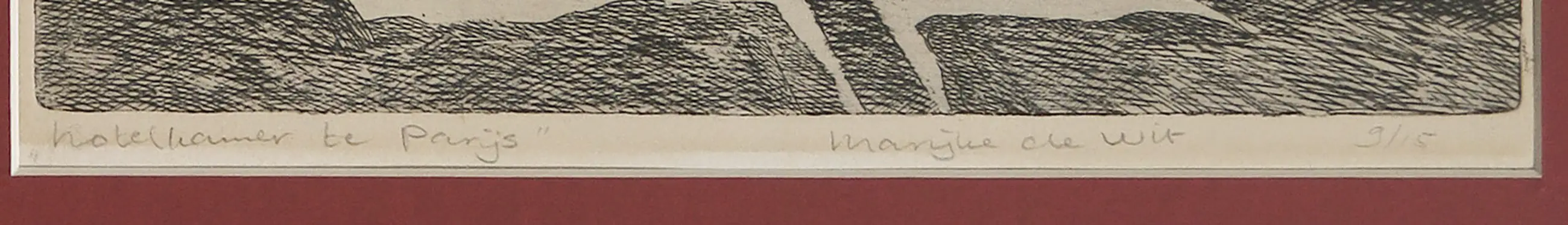 Ets met titel 'Hotelkamer te Parijs' door Marijke de Wit, in een net rood passe-partout geplaatst dus kan zo worden ingelijst.