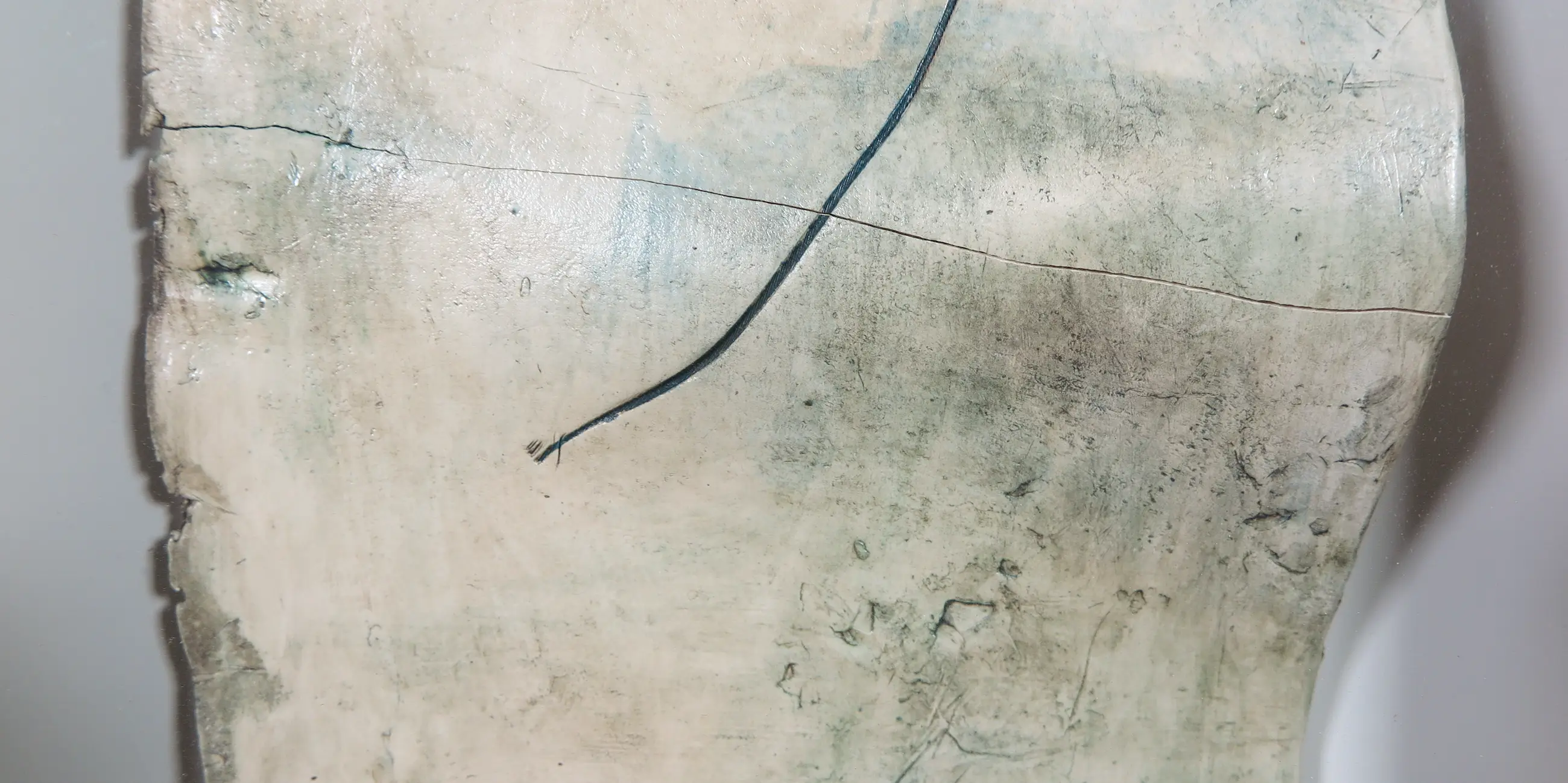 Er loopt een breuklijn van links naar rechts door het object. Verder is de voorstelling in zeer goede conditie. Eén hoek van de lijst is los. | |