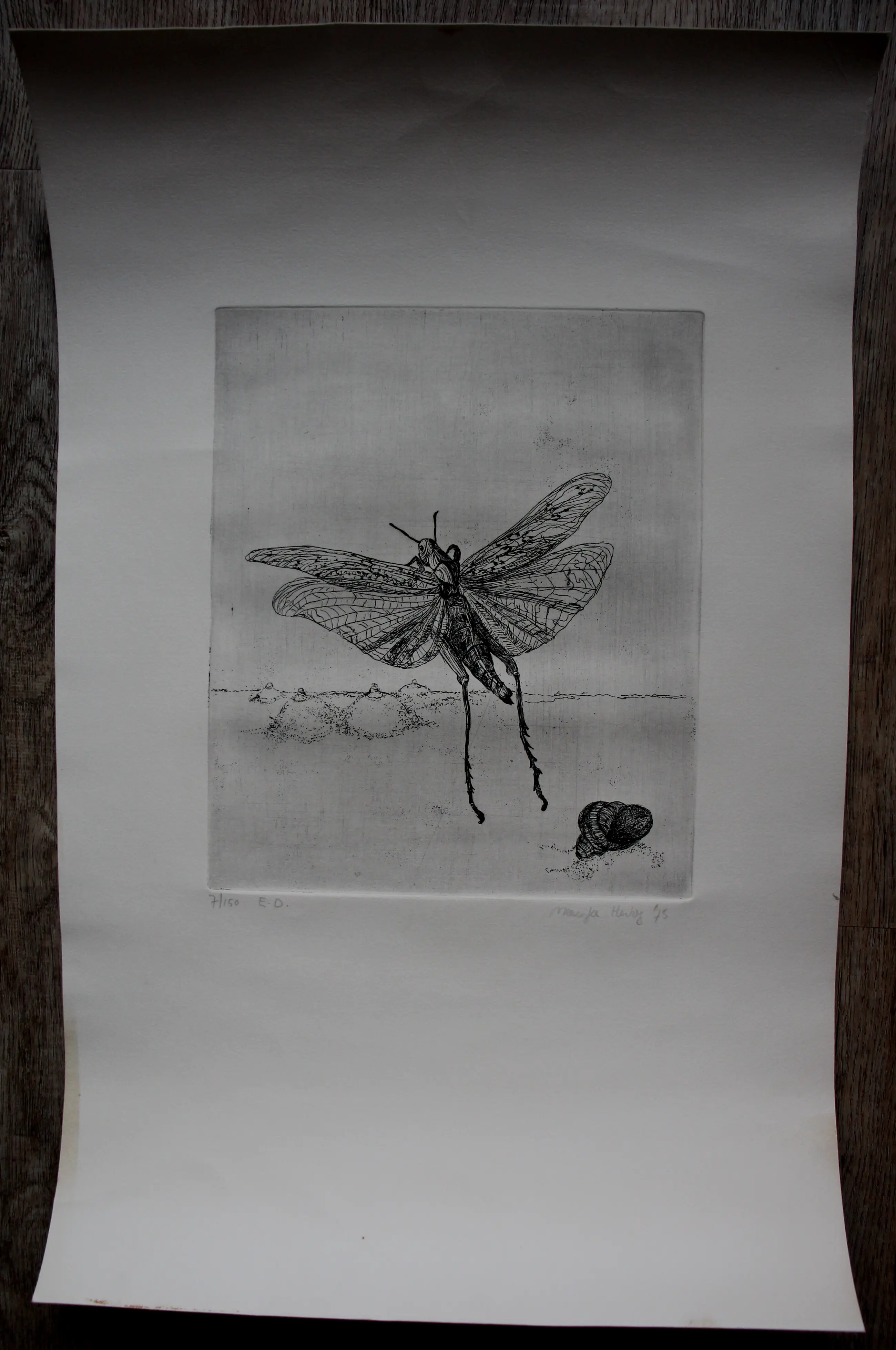 Ets van Marijke Hertog. Titel: libelle. Jaar: 1975. Nummer: 7/150, E.D. Afmetingen blad : H65 x b40cm. Afmetingen voorstelling: H30 x b24.5cm. Het werk is rechtsonder, met potlood, gesigneerd door de kunstenaar. De authenticiteit van het, aangeboden, werk wordt volledig gegarandeerd. Een certificaat van echtheid kan, op aanvraag, worden gemaild.
