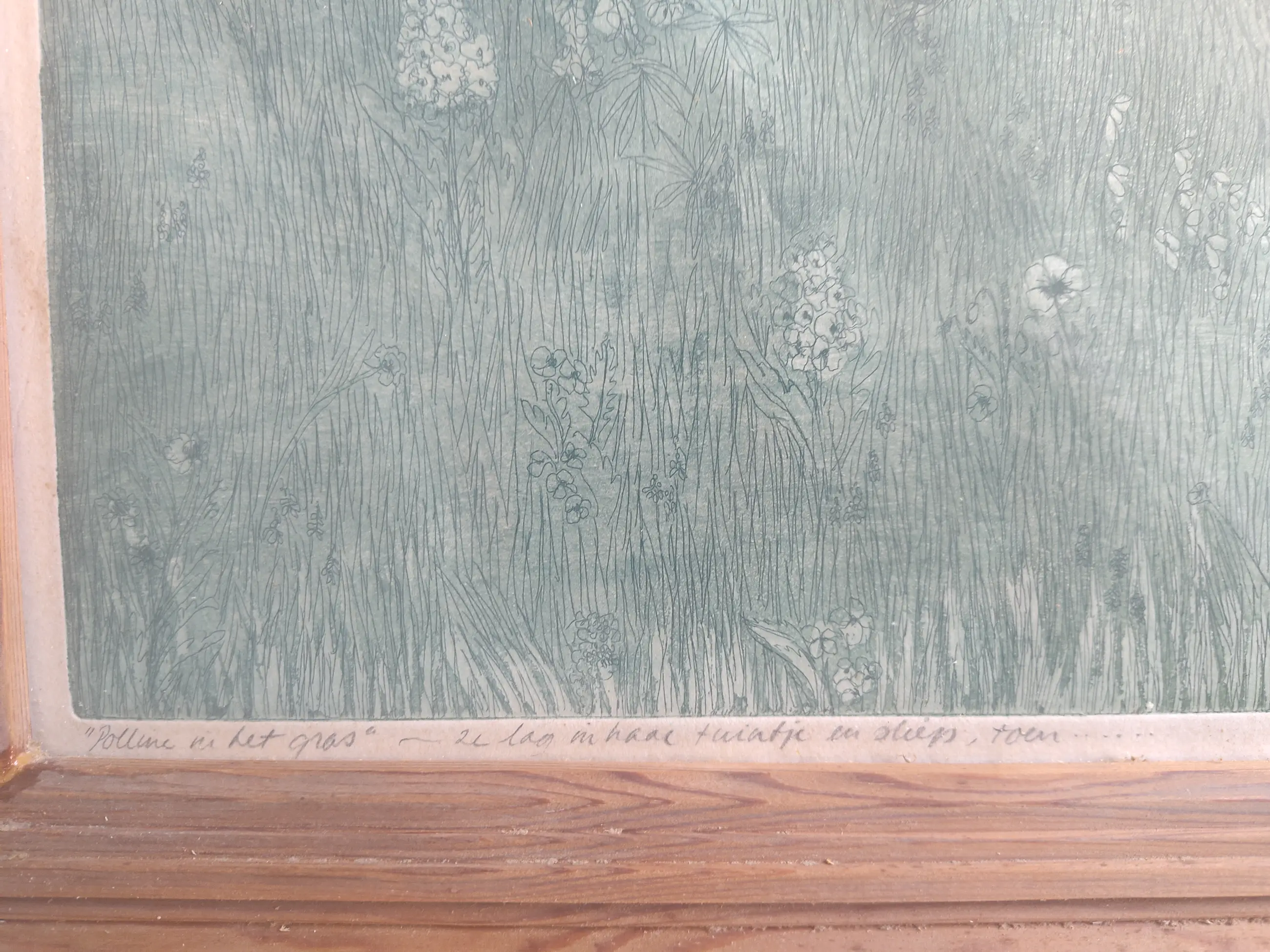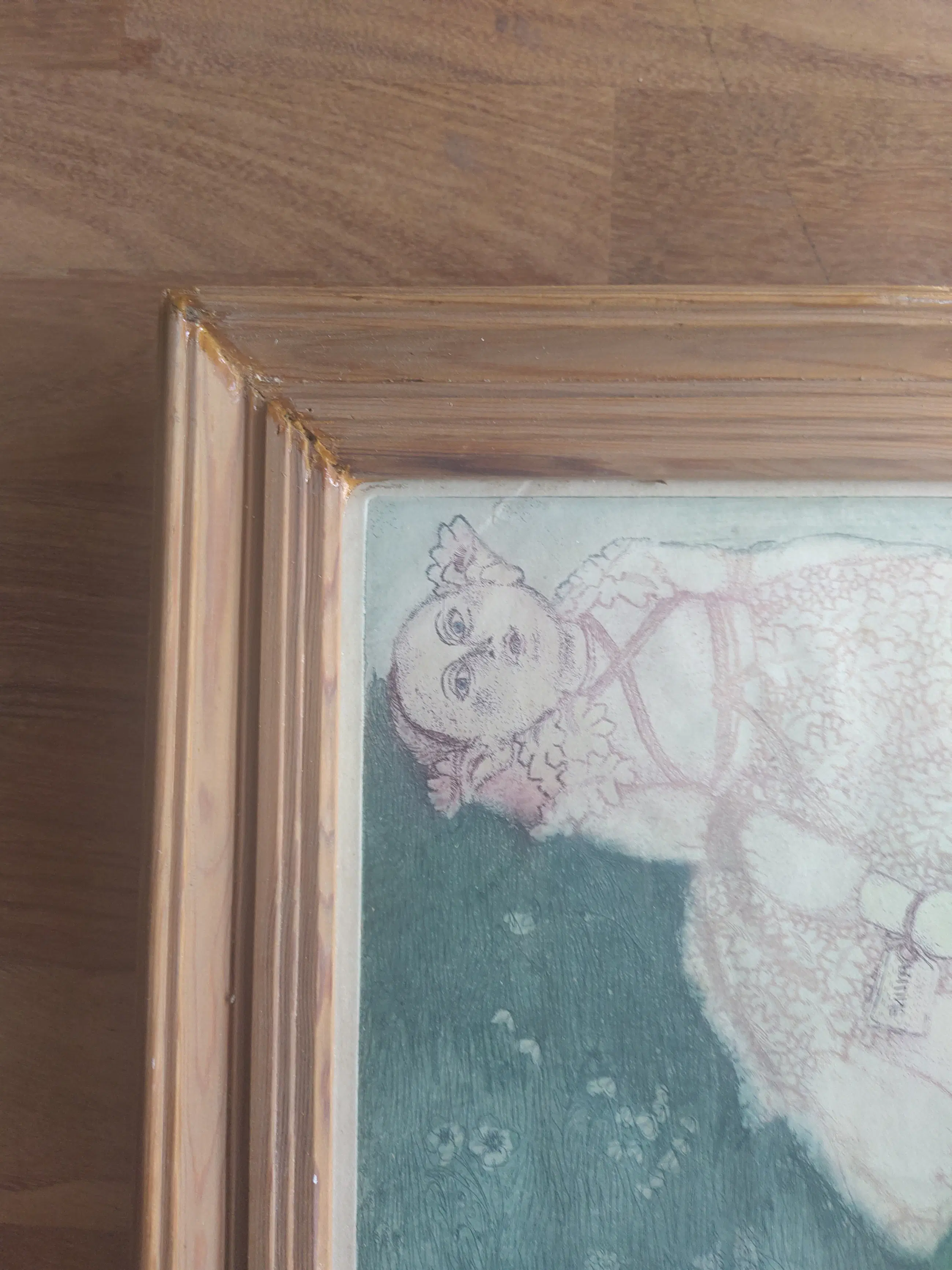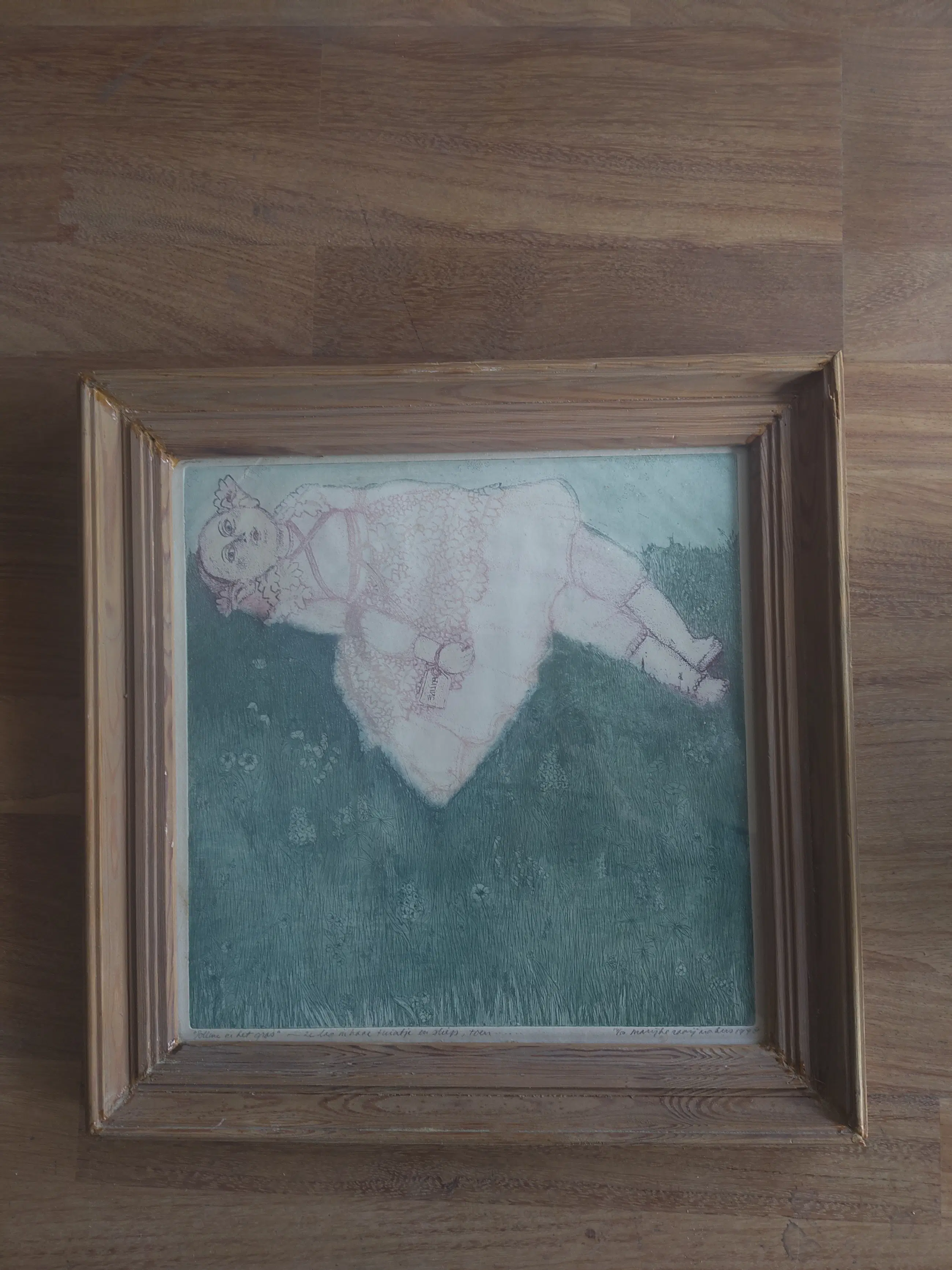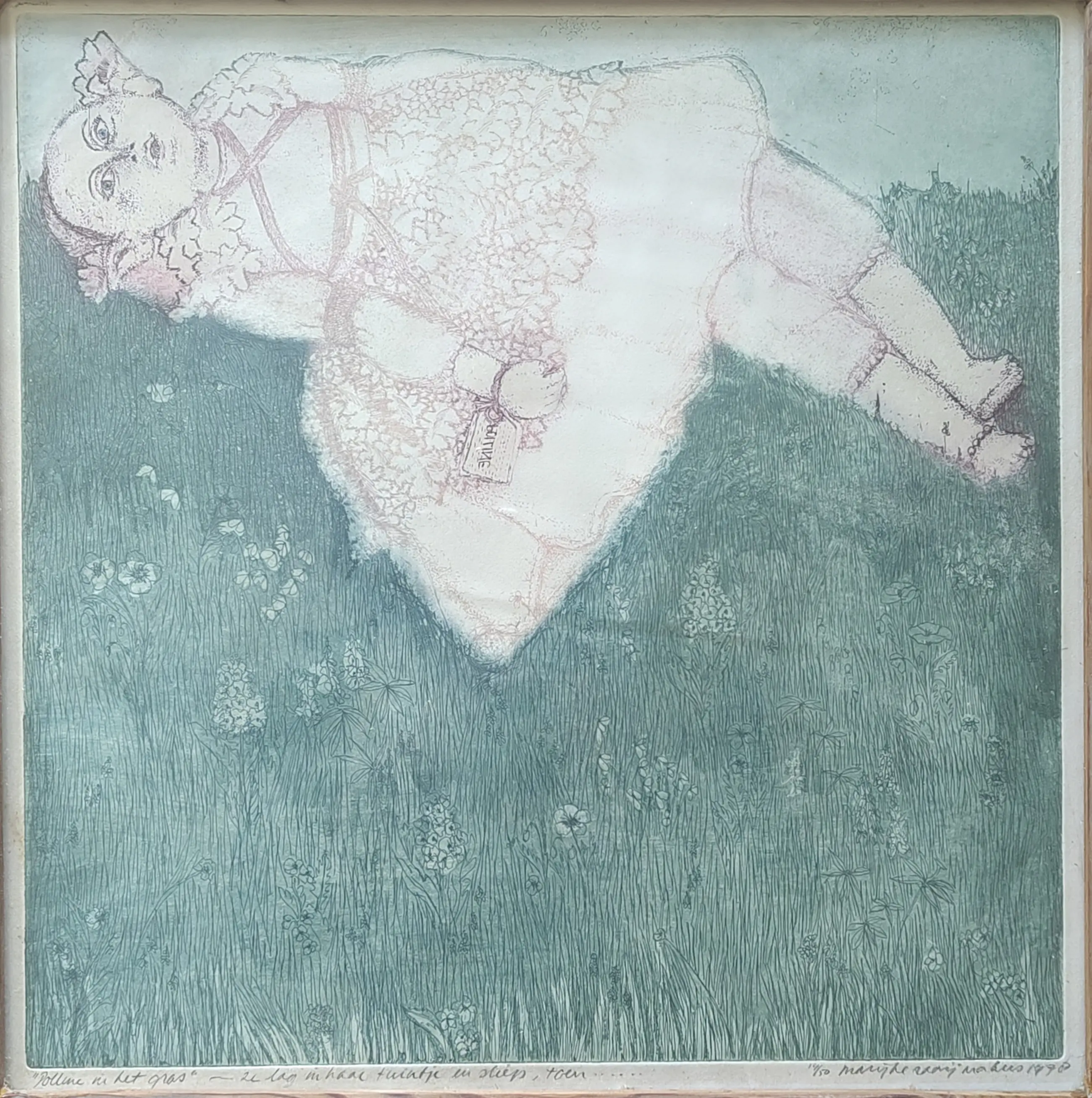 Een lieflijke afbeelding van een meisje, of een pop in het gras. Ik ken de techniek niet zo goed, vermoed dat het ets met aquarel is,aar ik kan ernaast zitten. Ik heb het zelf een lijst gegeven; ik denk dat je zelf graag opnieuw laat inlijsten.