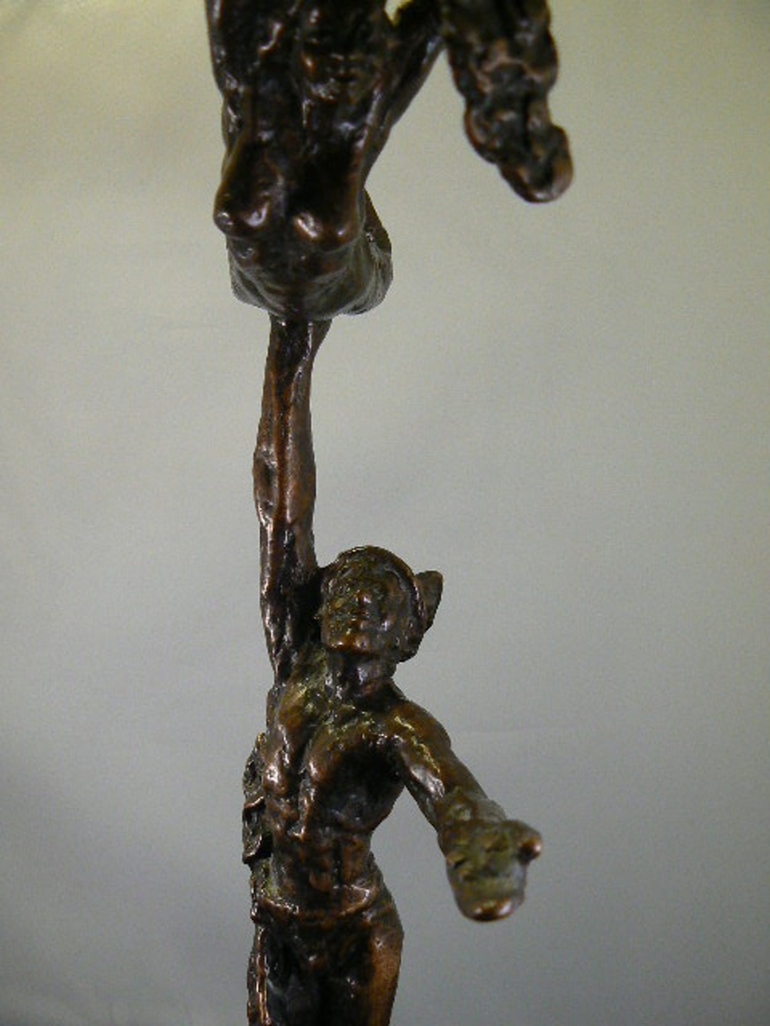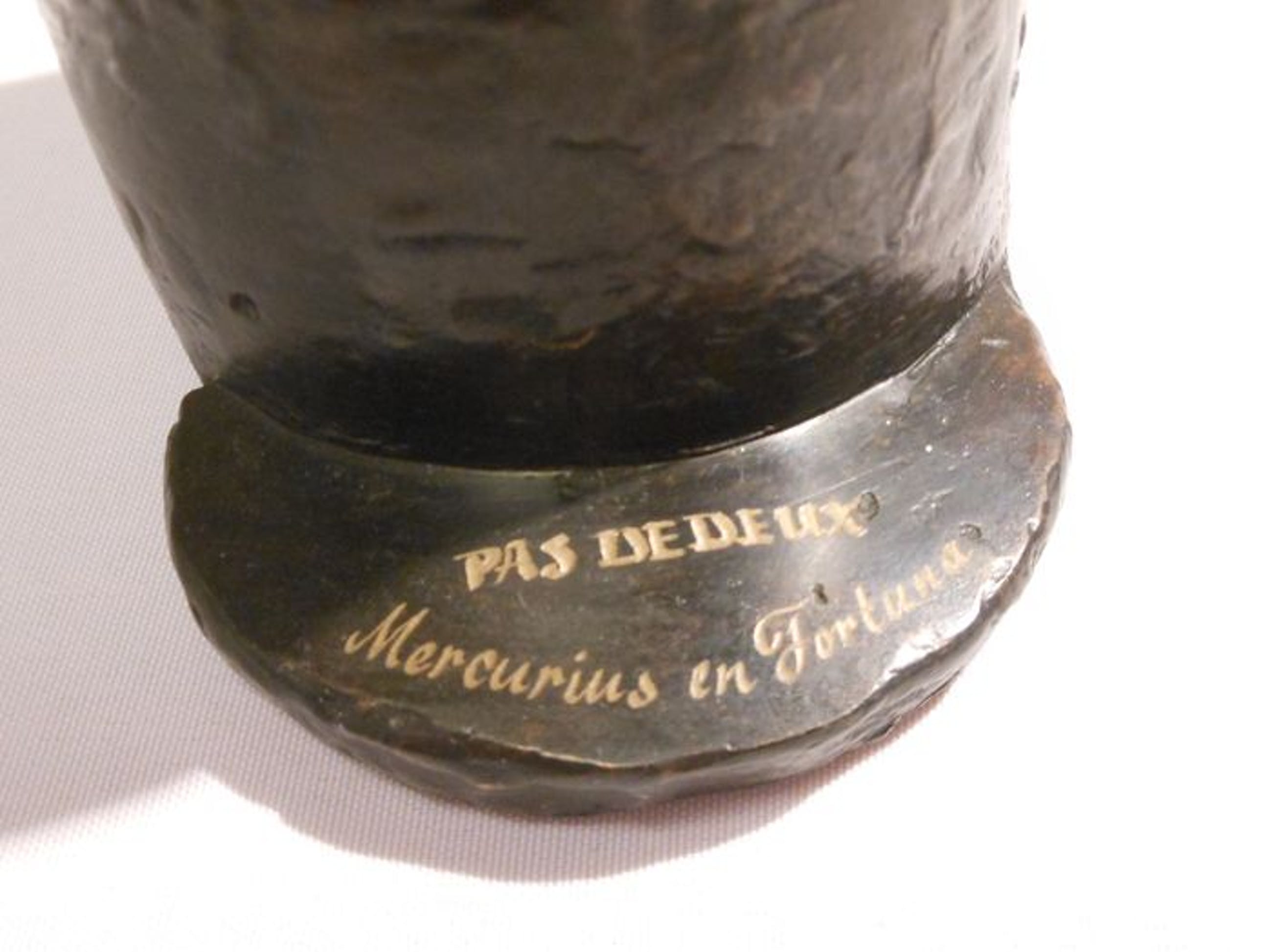 Brons beeld Pas de deux – Mercurius met Fortuna. Een dans tussen Mercurius ( de Romeinse god van de handel) en vrouwe Fortuna met de hoorn des overvloed (de Romeinse godin die voor overvloed zorgde). Wat is de handel waard als er geen winst wordt gemaakt? ( citaat,... unique sculptures )