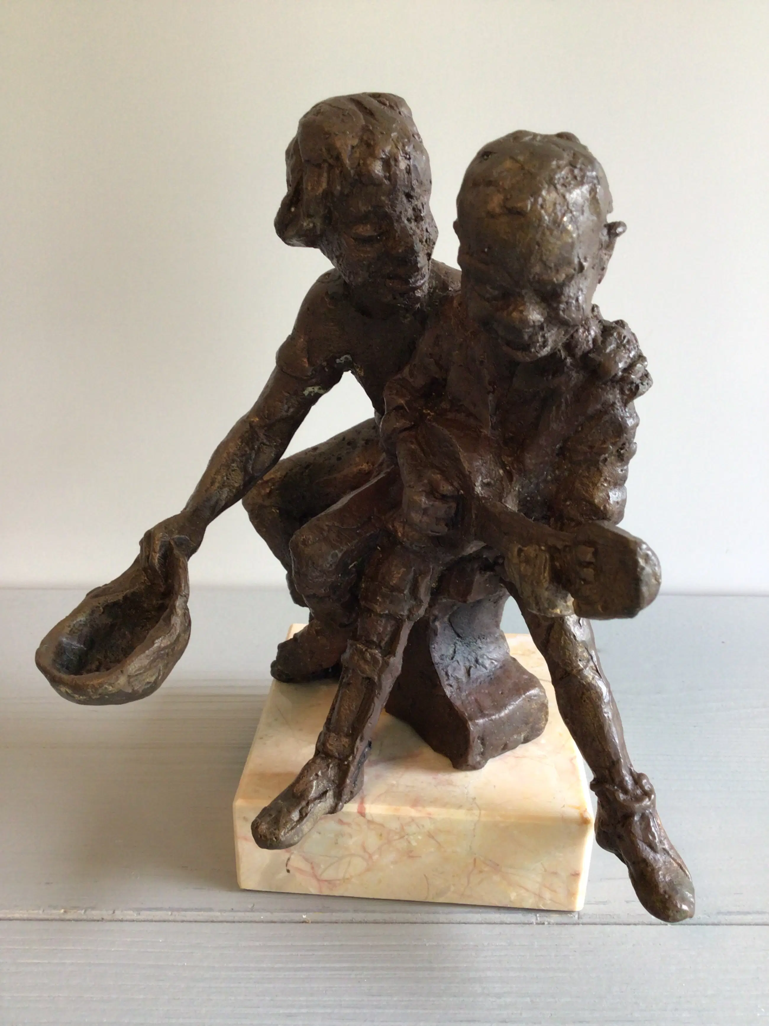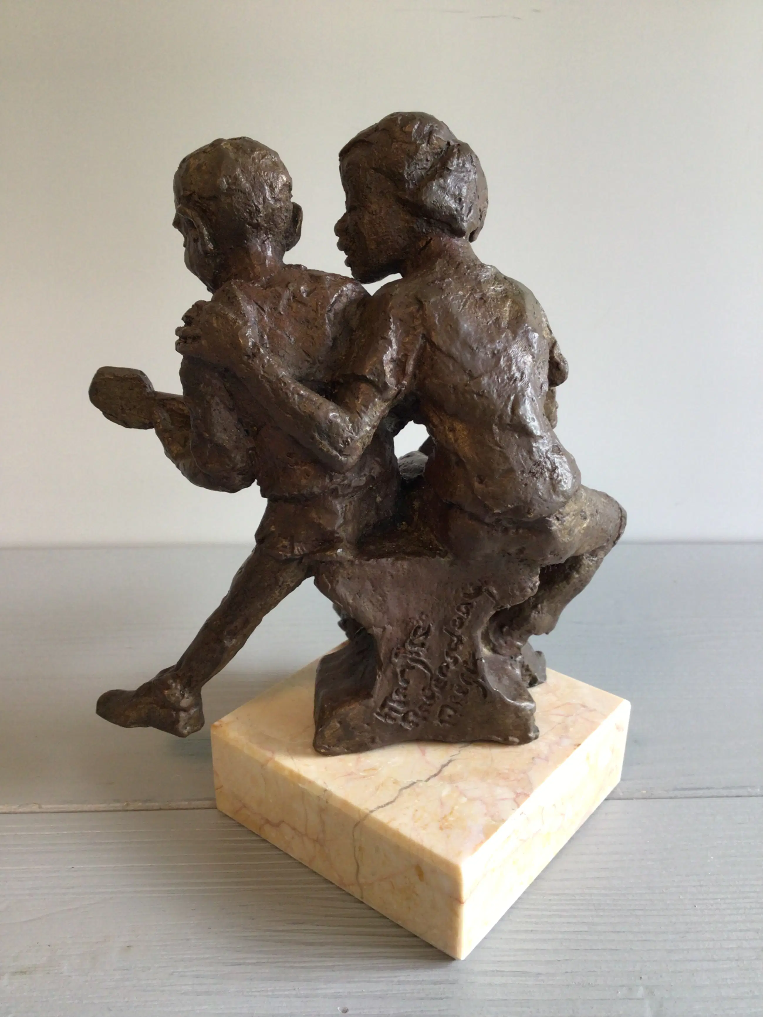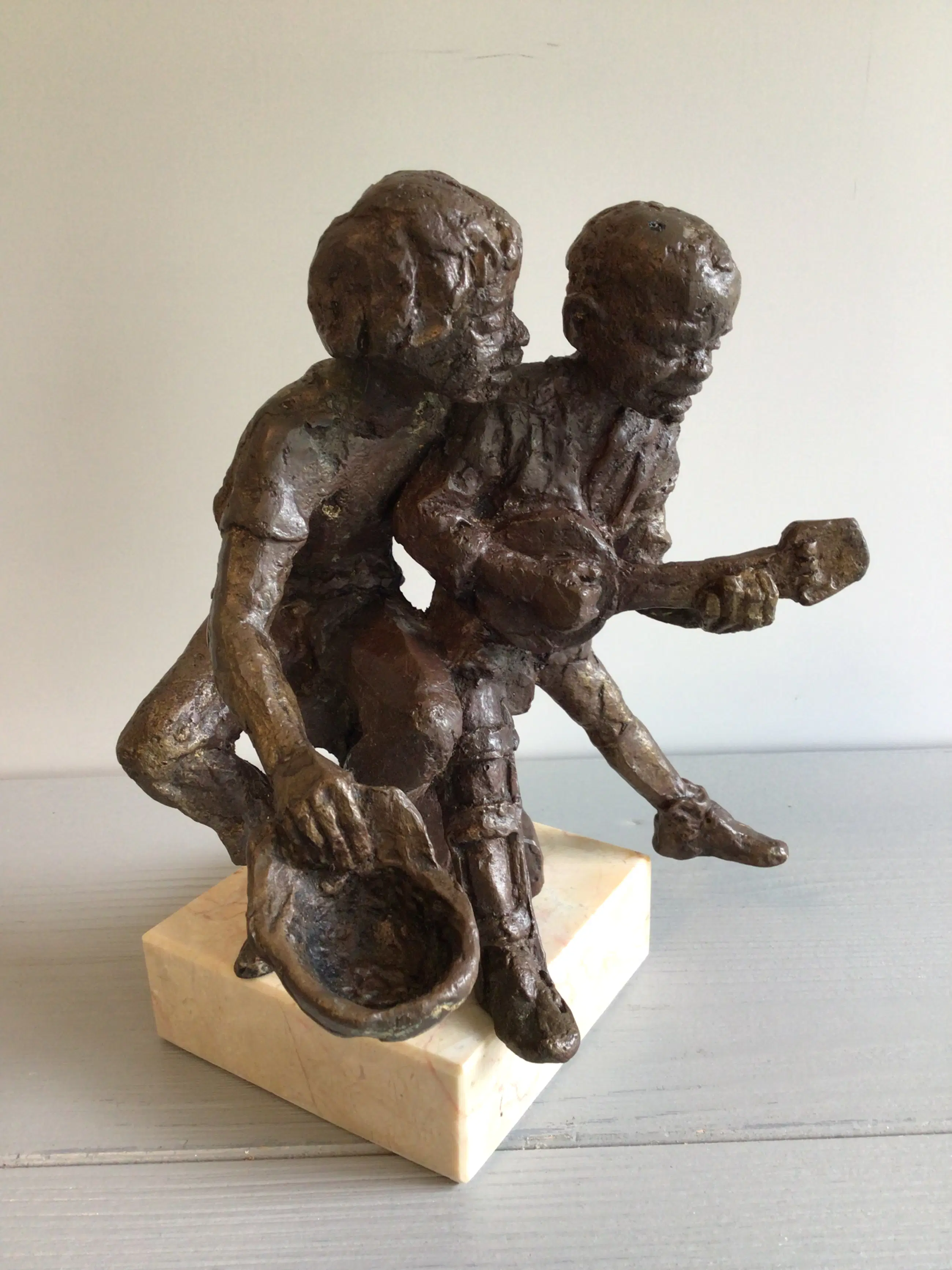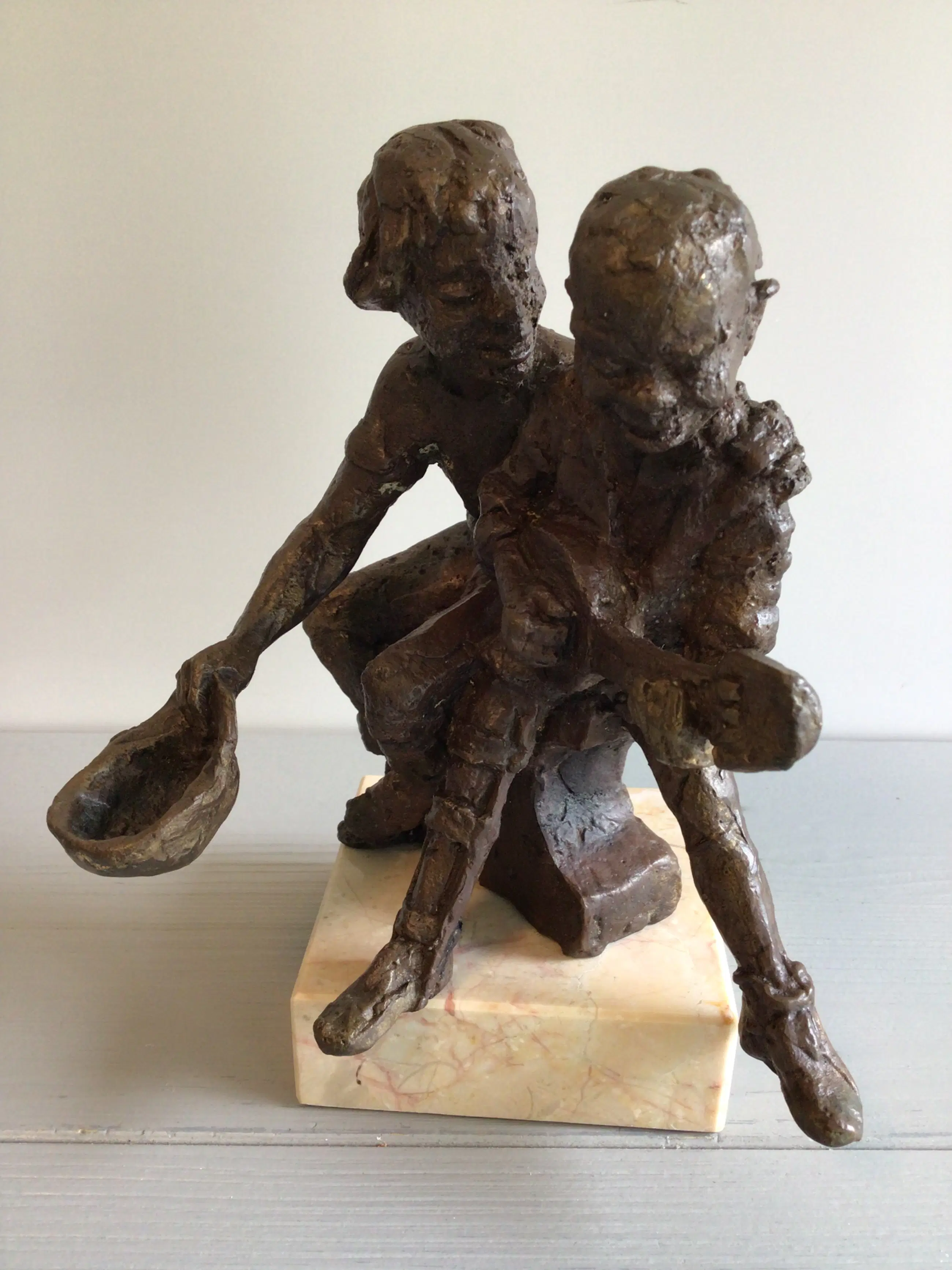 Zeer fraai gedetailleerd vormgegeven sculptuur van twee straatmuzikanten, de een bespeelt de banjo, de ander met de pet in de hand voor de centjes, een zeldzaam exemplaar. Kunstenares: Marijke Ravenszwaaij - Deege. Het beeld is aan de achterzijde gesigneerd door de kunstenares. Materiaal: brons op losse fraai marmeren sokkel. Het geheel verkeert in goede staat en wordt zorgvuldig verpakt verzonden.
