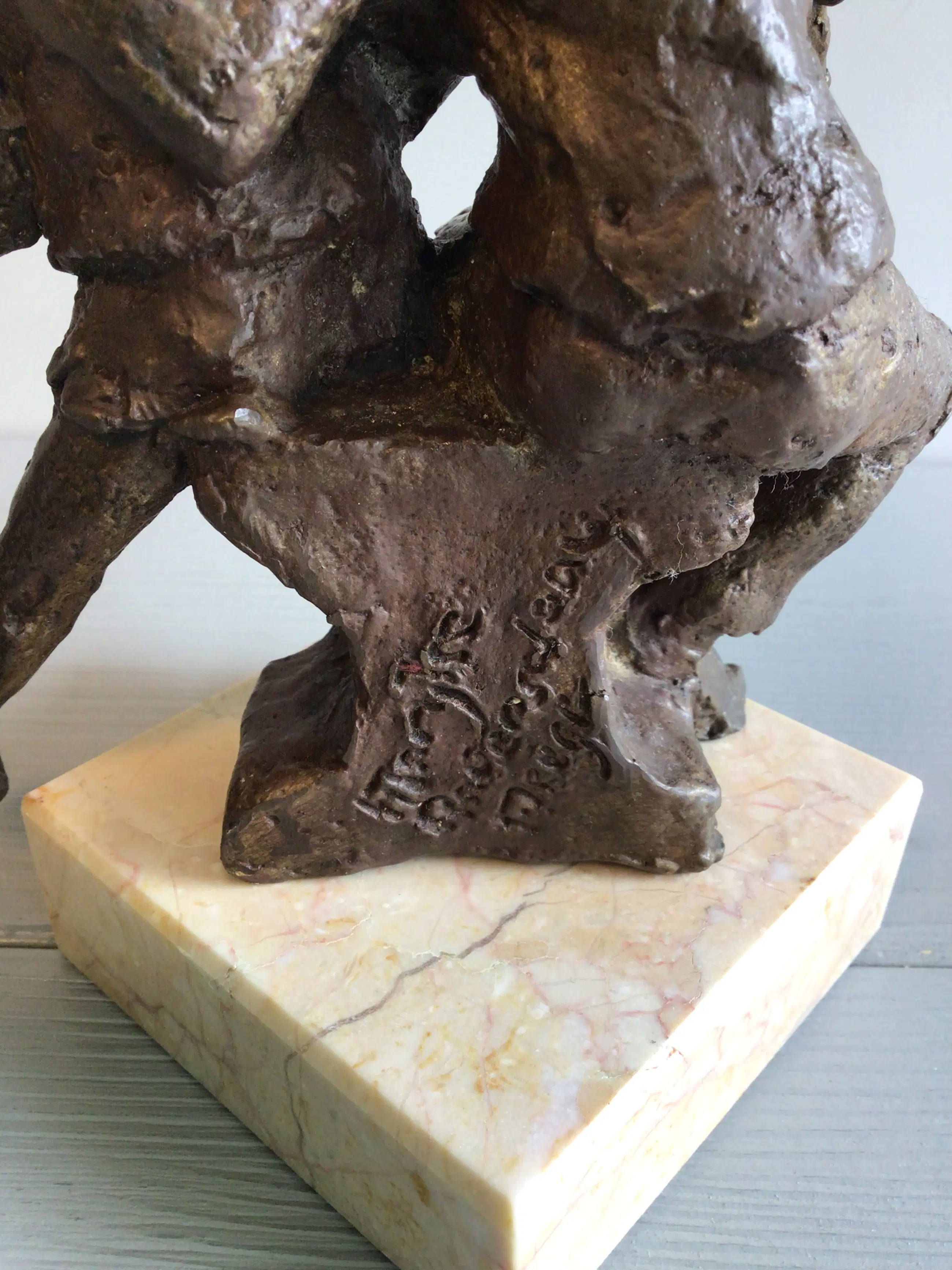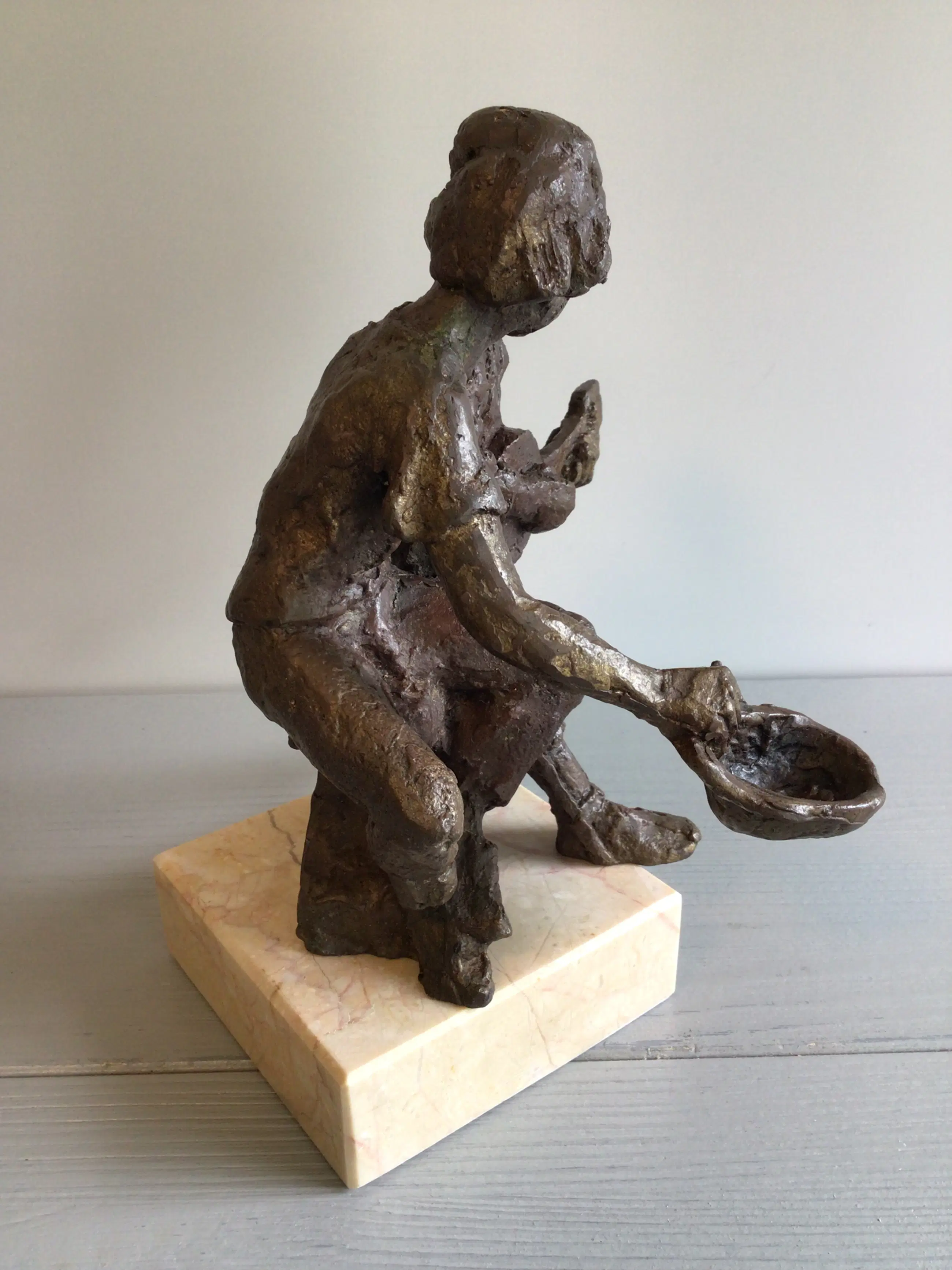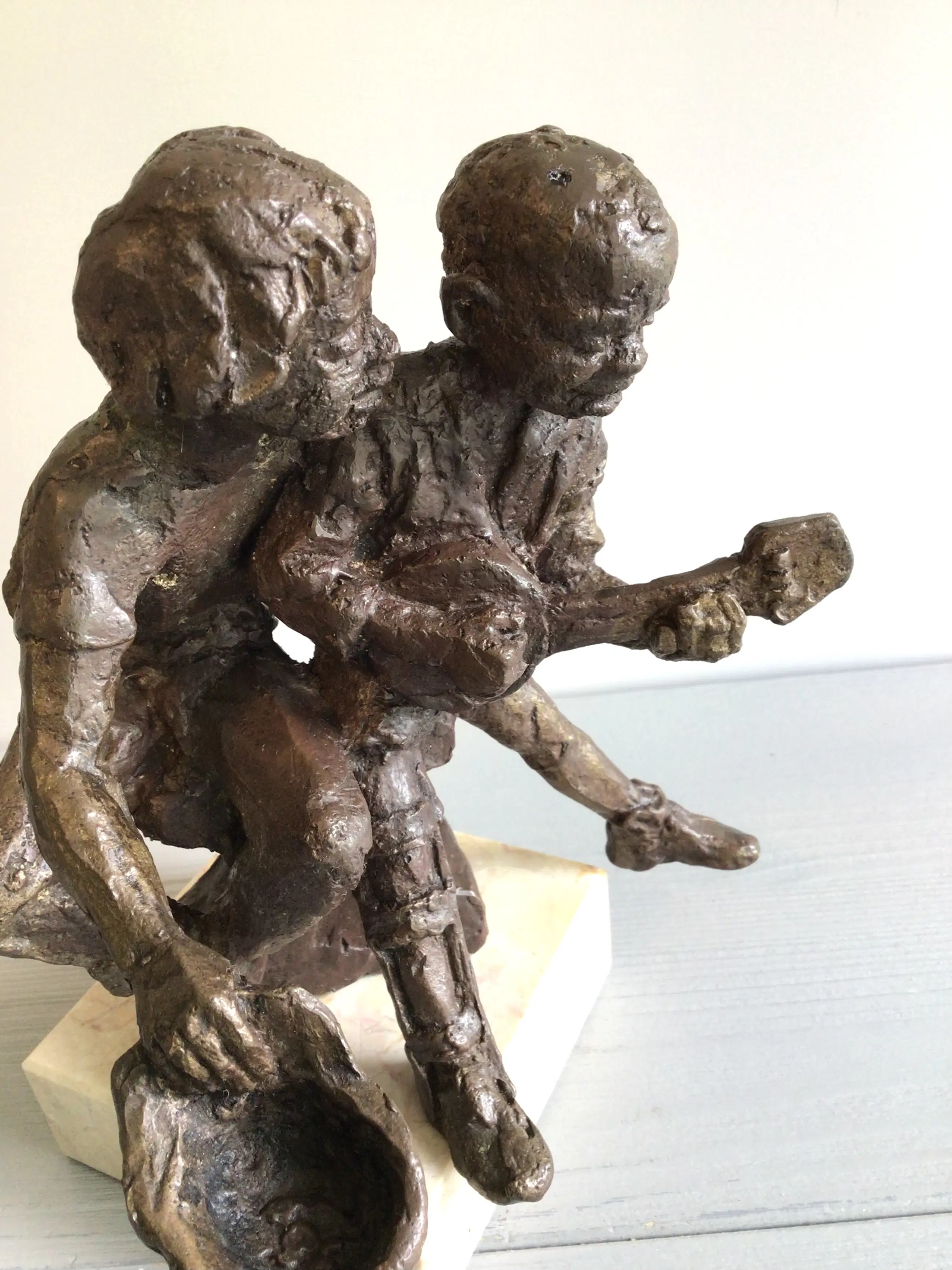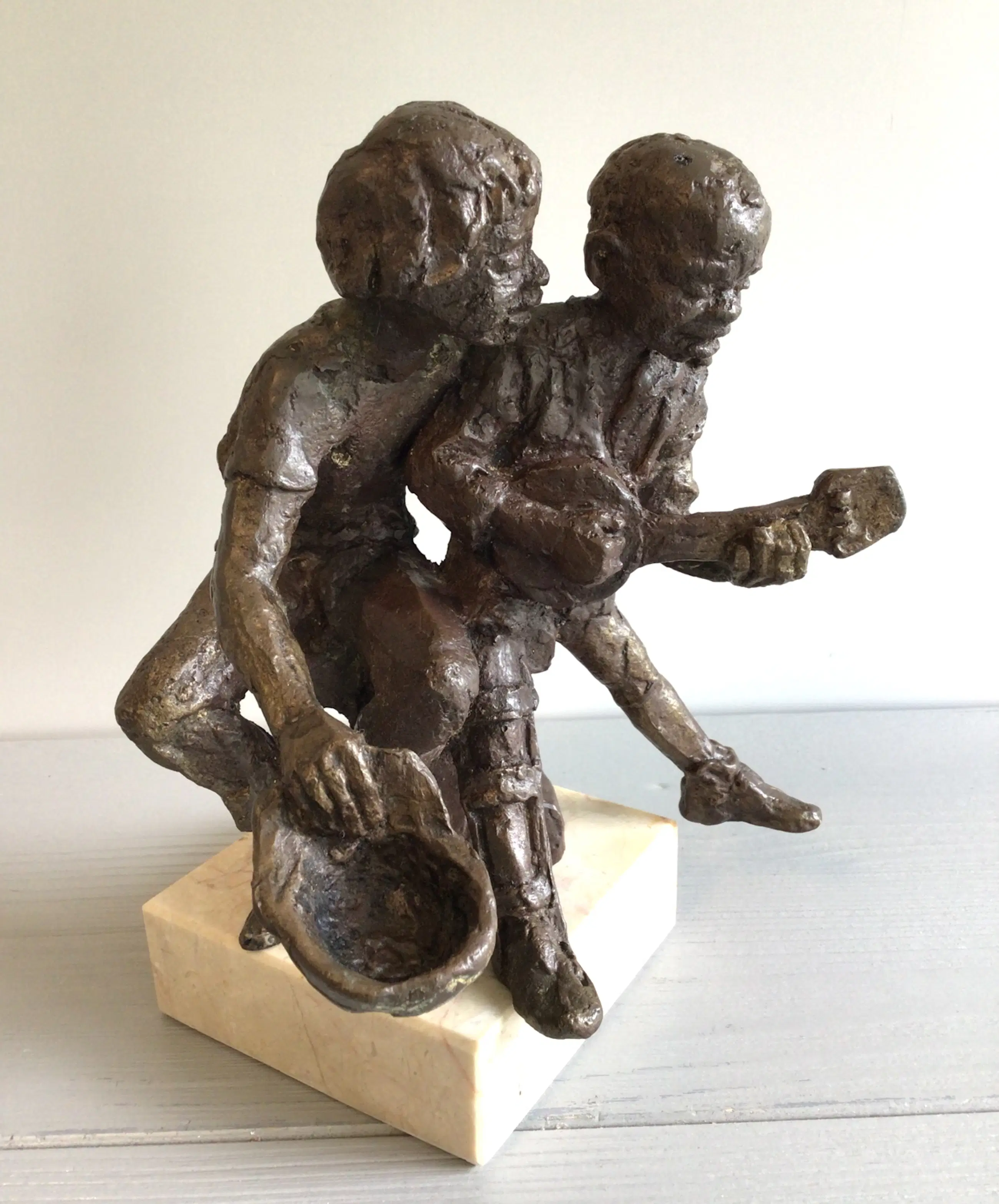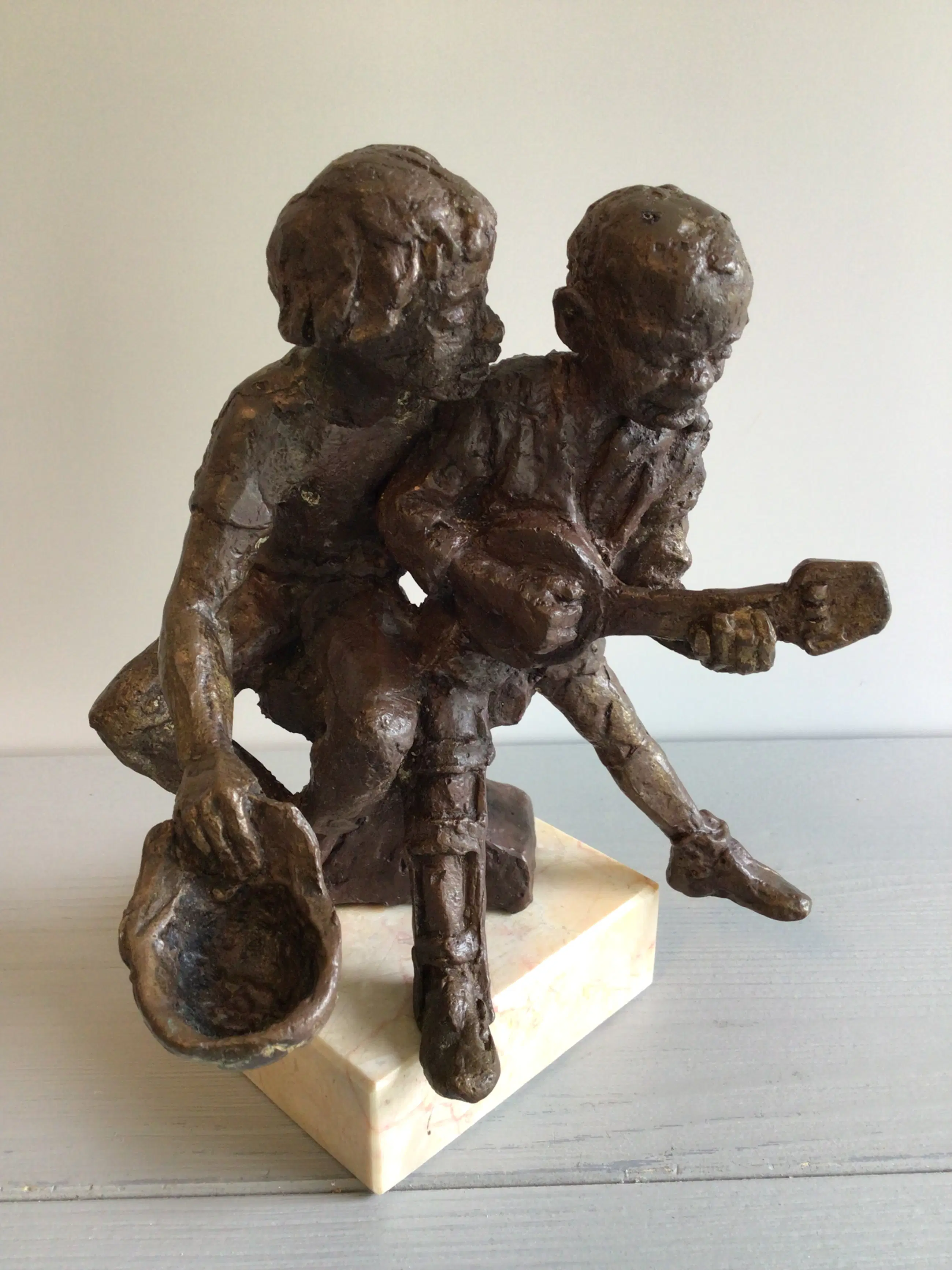 Zeer fraai gedetailleerd vormgegeven sculptuur van twee straatmuzikanten, de een bespeelt de banjo, de ander met de pet in de hand voor de centjes, een zeldzaam exemplaar. Kunstenares: Marijke Ravenszwaaij - Deege. Het beeld is aan de achterzijde gesigneerd door de kunstenares. Materiaal: brons op losse fraai marmeren sokkel. Het geheel verkeert in goede staat en wordt zorgvuldig verpakt verzonden.
