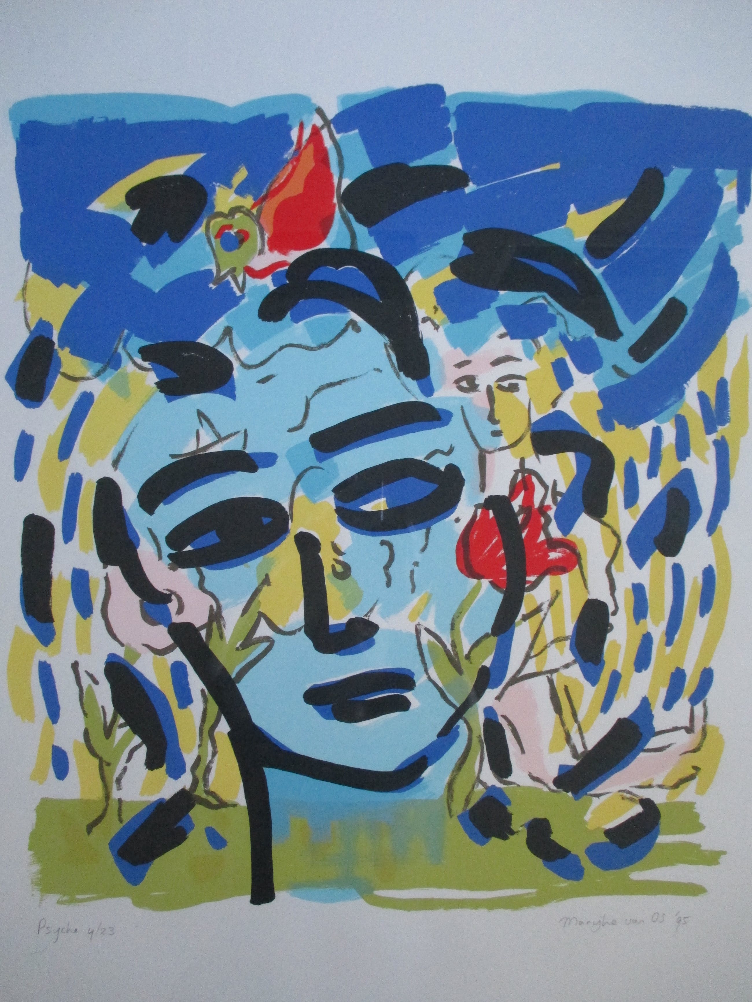 Zeefdruk van Marijke van Os, ingelijst achter glas en passe-partout in een brede houten lijst. Titel: "Psyche" LET OP! Vanwege het formaat verzending alleen mogelijk binnen Nederland en alleen met koerier