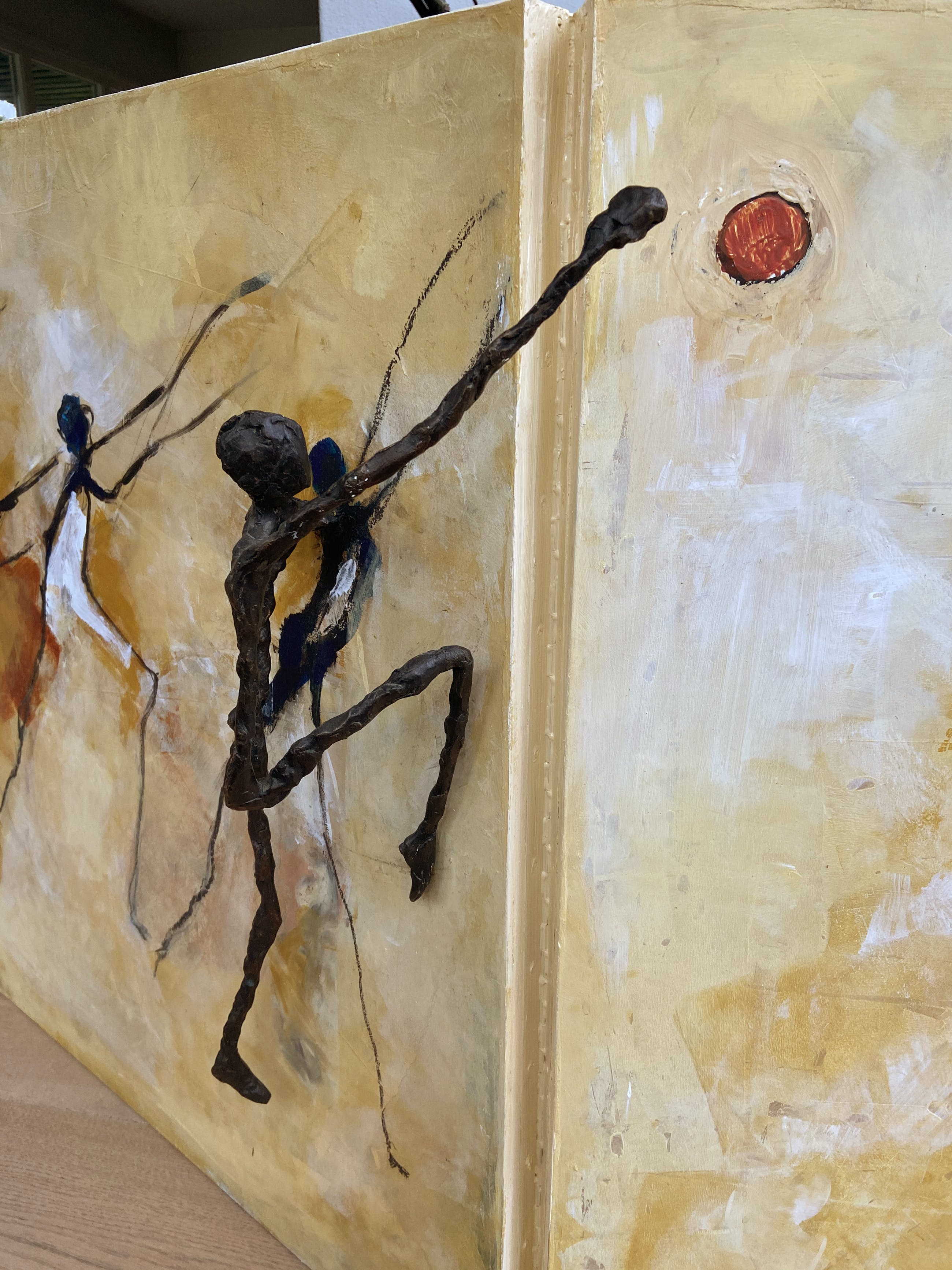 Een scharnierend tweeluik. In het acryl schilderij is een bronnenfiguur verwerkt. Hij probeert bij het "geluk" te komen maar alleen als het schilderij plat tegen de muur hangt, is dat mogelijk. Als je het schilderij met een hoek ophangt ( door middel van het haakje) kan hij er niet bij. Het schilderij kan ook in 90 graden hangen. bv om een muurhoek heen. Dan hangt het dus op 2 muren. Dubbel paneel met schanier. De maat is 100x45 (2panelen) en de hoogte is 74 cm Het is in het totaal vrij zwaar door het brons en de panelen. Bewijs van echtheid wordt erbij geleverd Af te halen in mijn atelier.