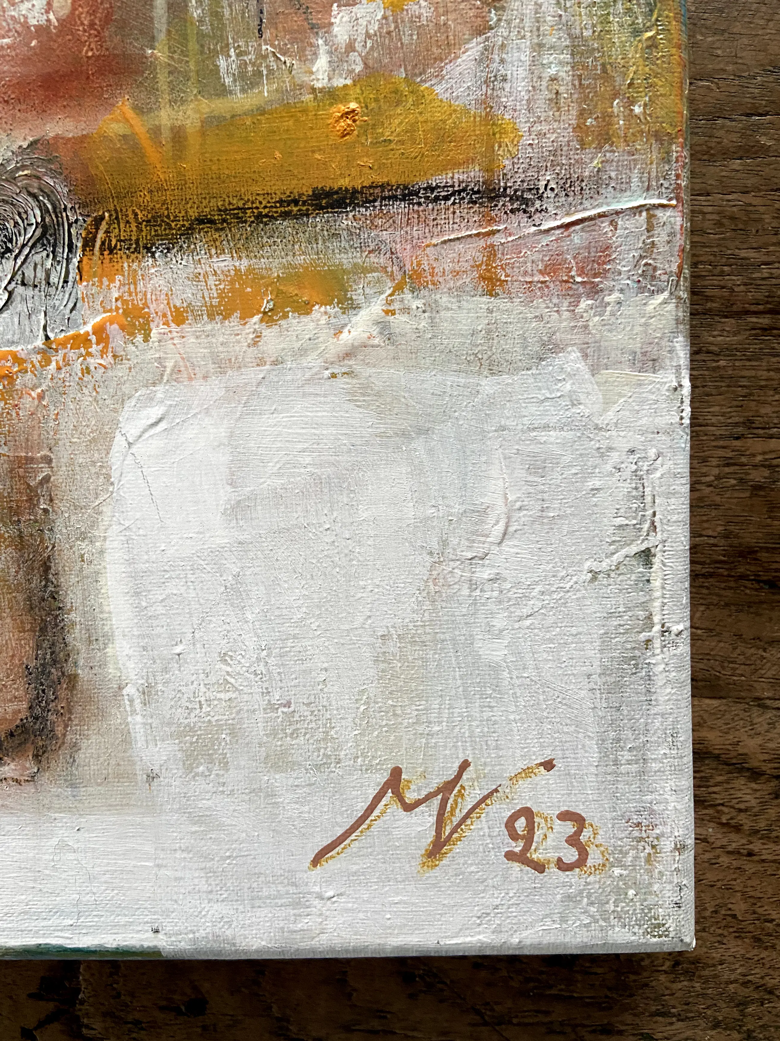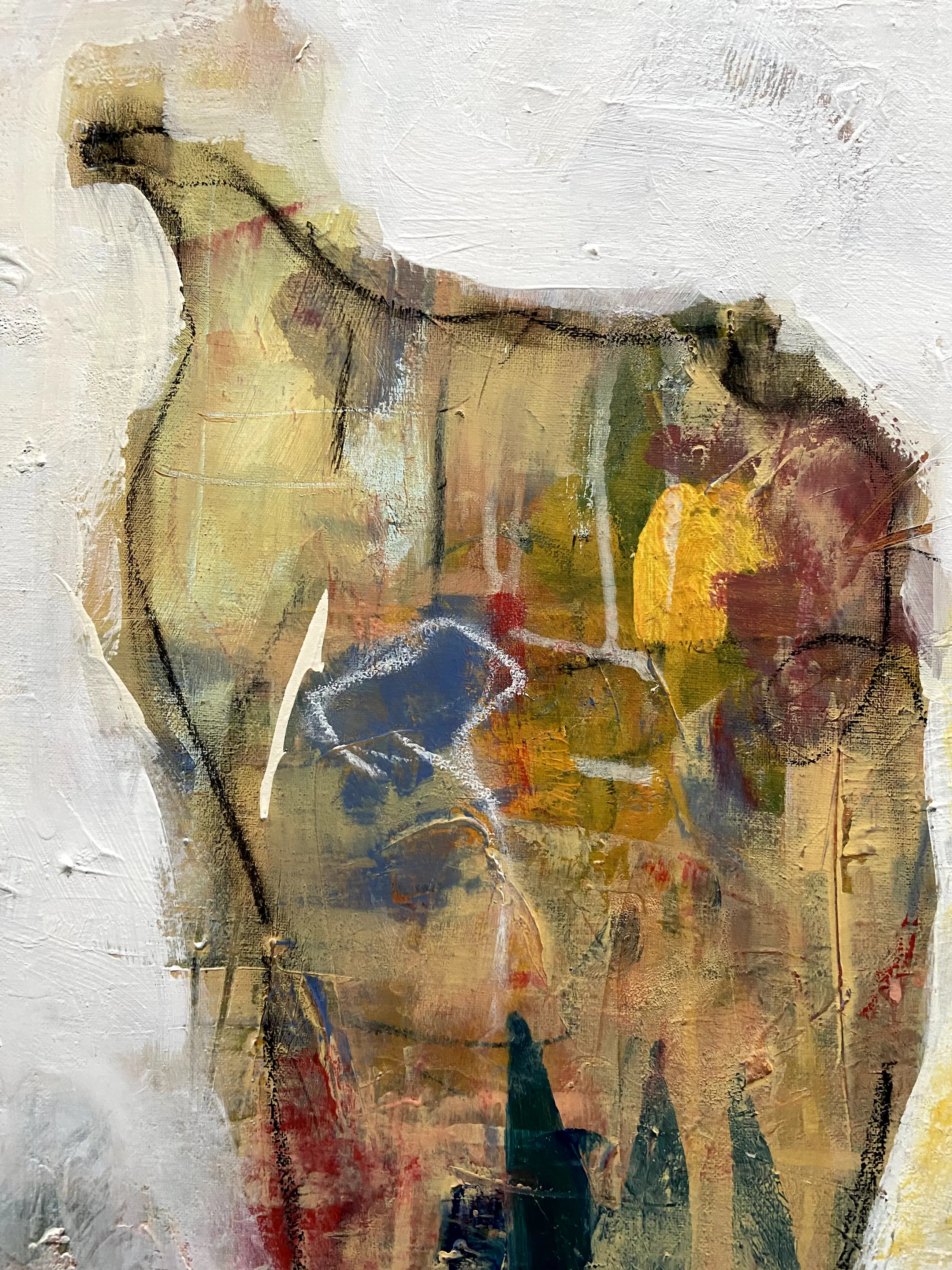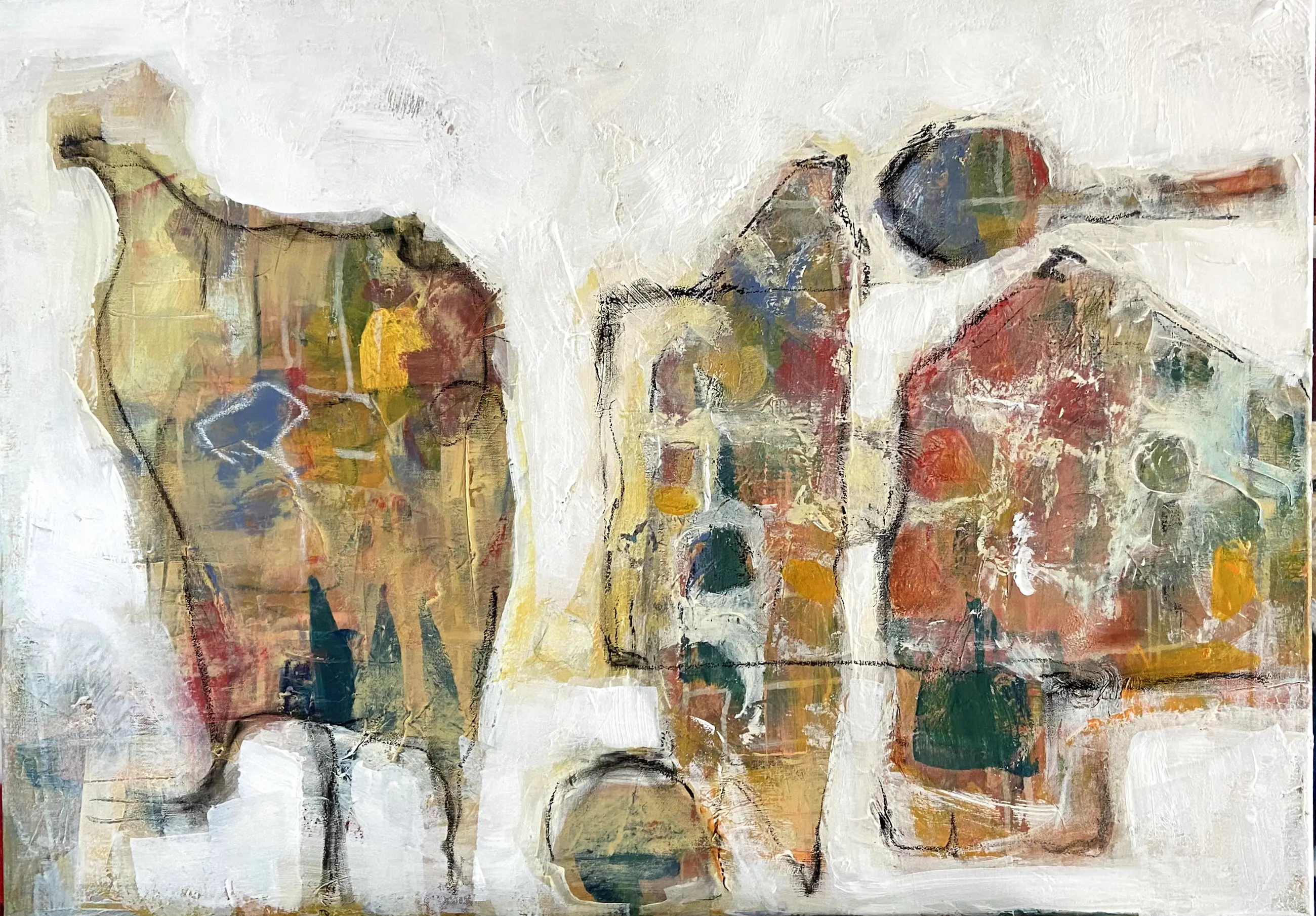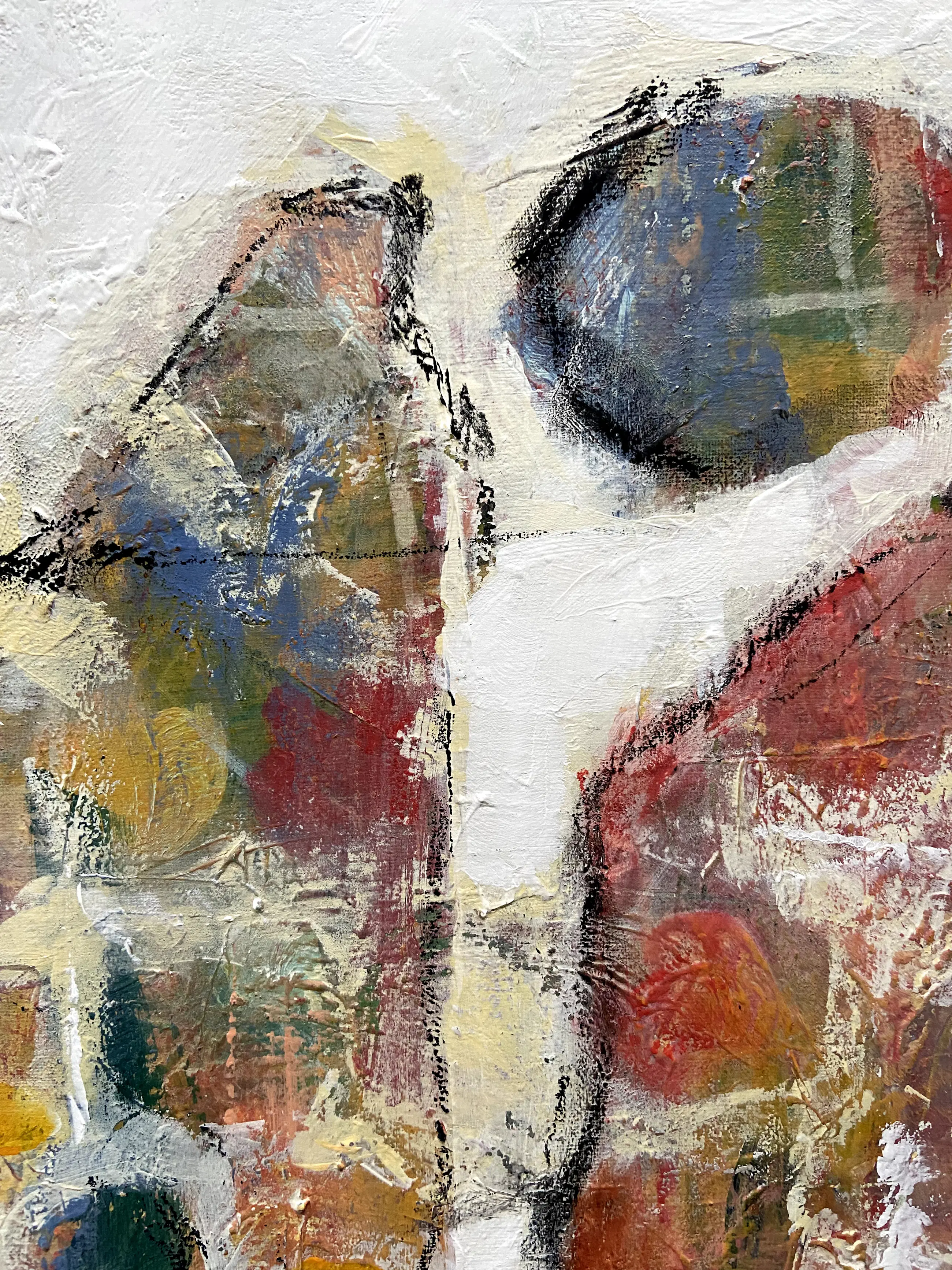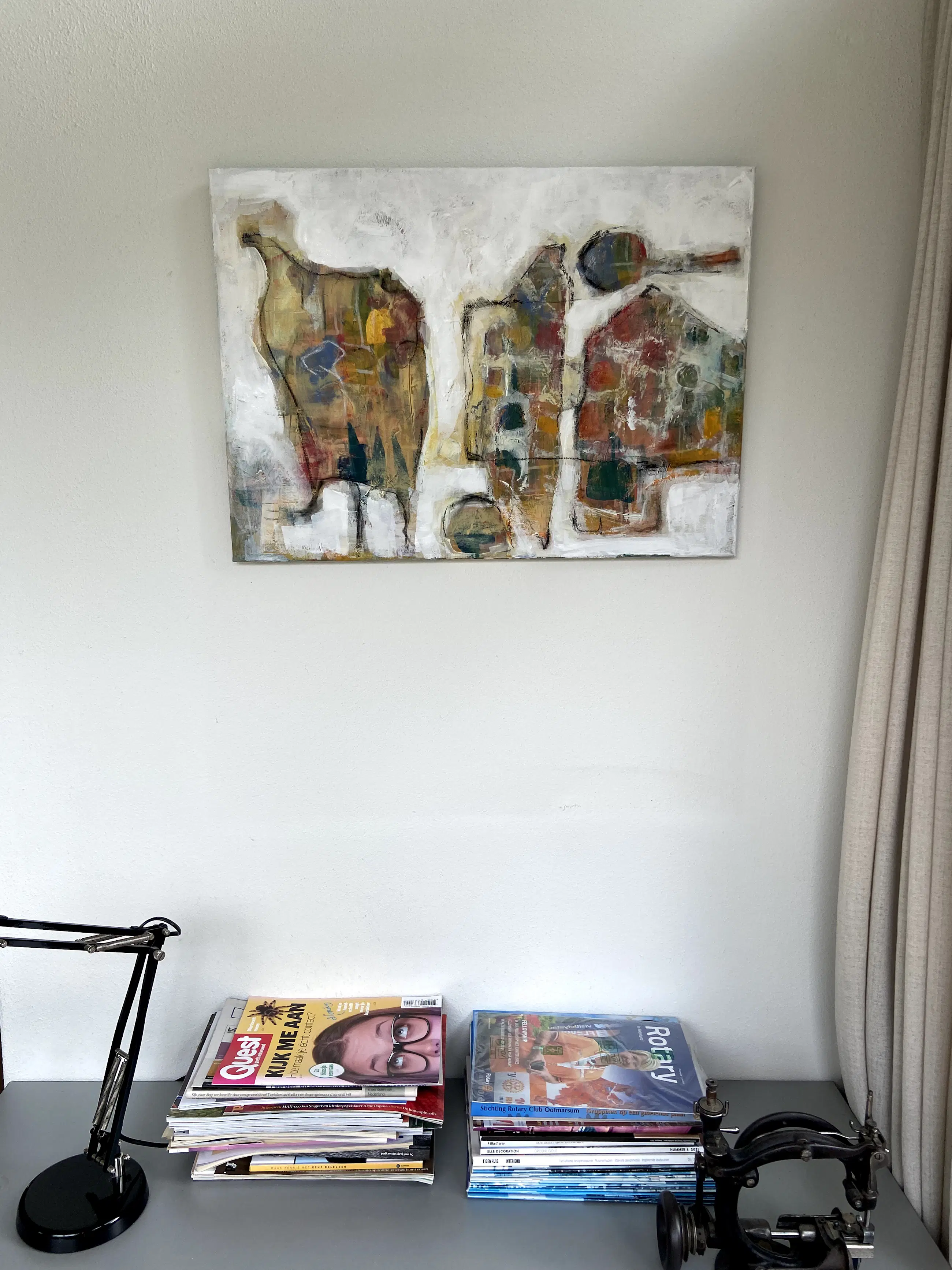 Na het werken met heel veel structuren en steeds laag over laag toe te voegen, tot er genoeg is ontstaan om te fantaseren en weer weg te halen , ontstaat daardoor een interessant beeld. IK vind het leuk om daarbij een verhaal te kunnen zien. Misschien ziet de kijker ook een verhaal. Maar het hoeft niet.