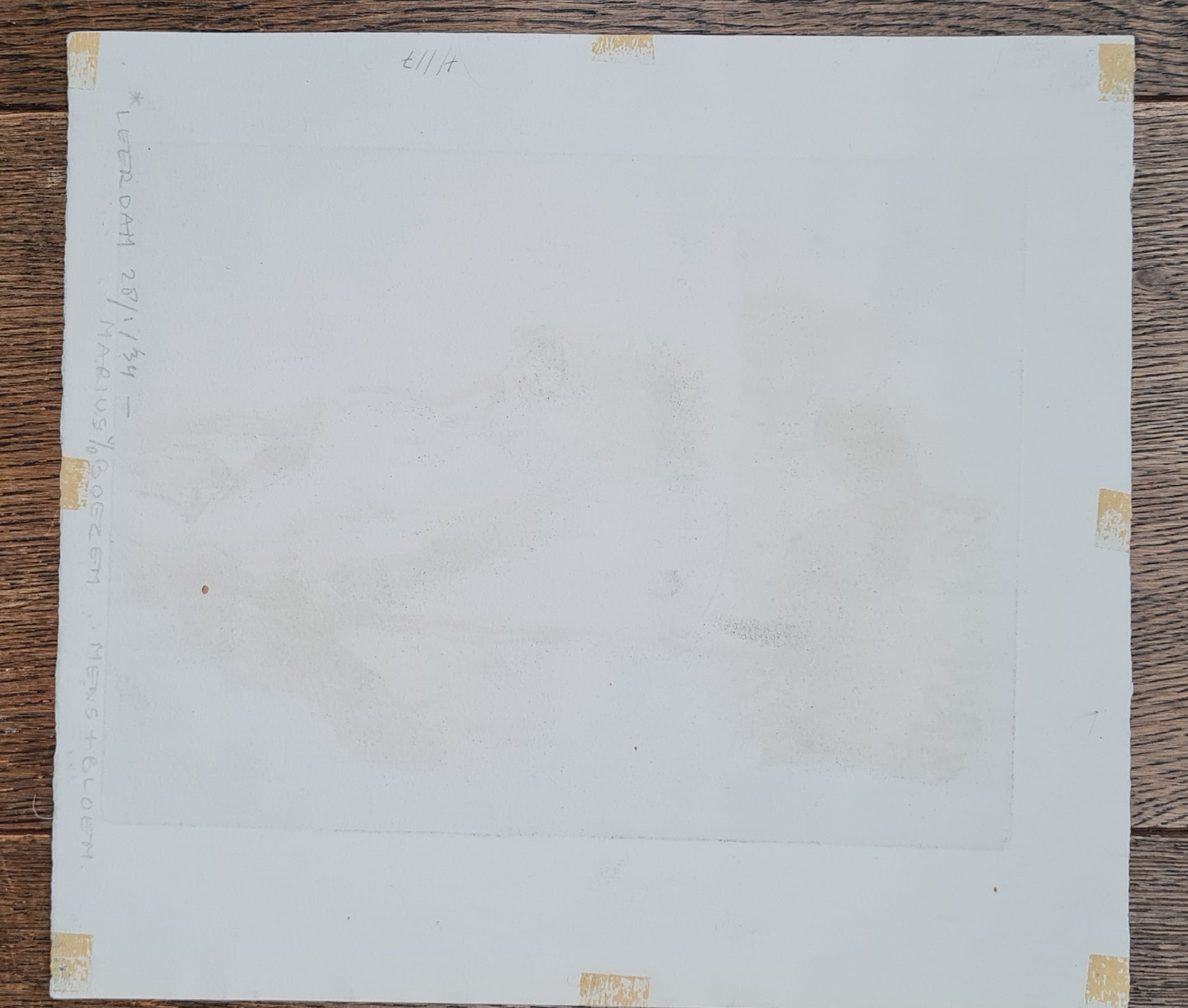 Conditie is goed, alleen verkleuringen in de blanke marge door taperesten op de achterzijde in de uiterste marges, zie scans.